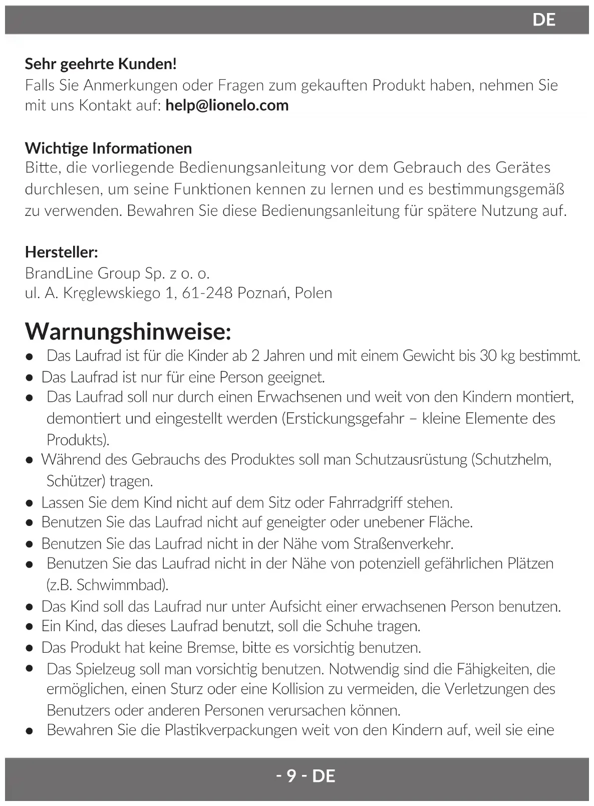 - Benutzen Sie das Laufrad nicht in der Nähe vom Straßenverkehr.