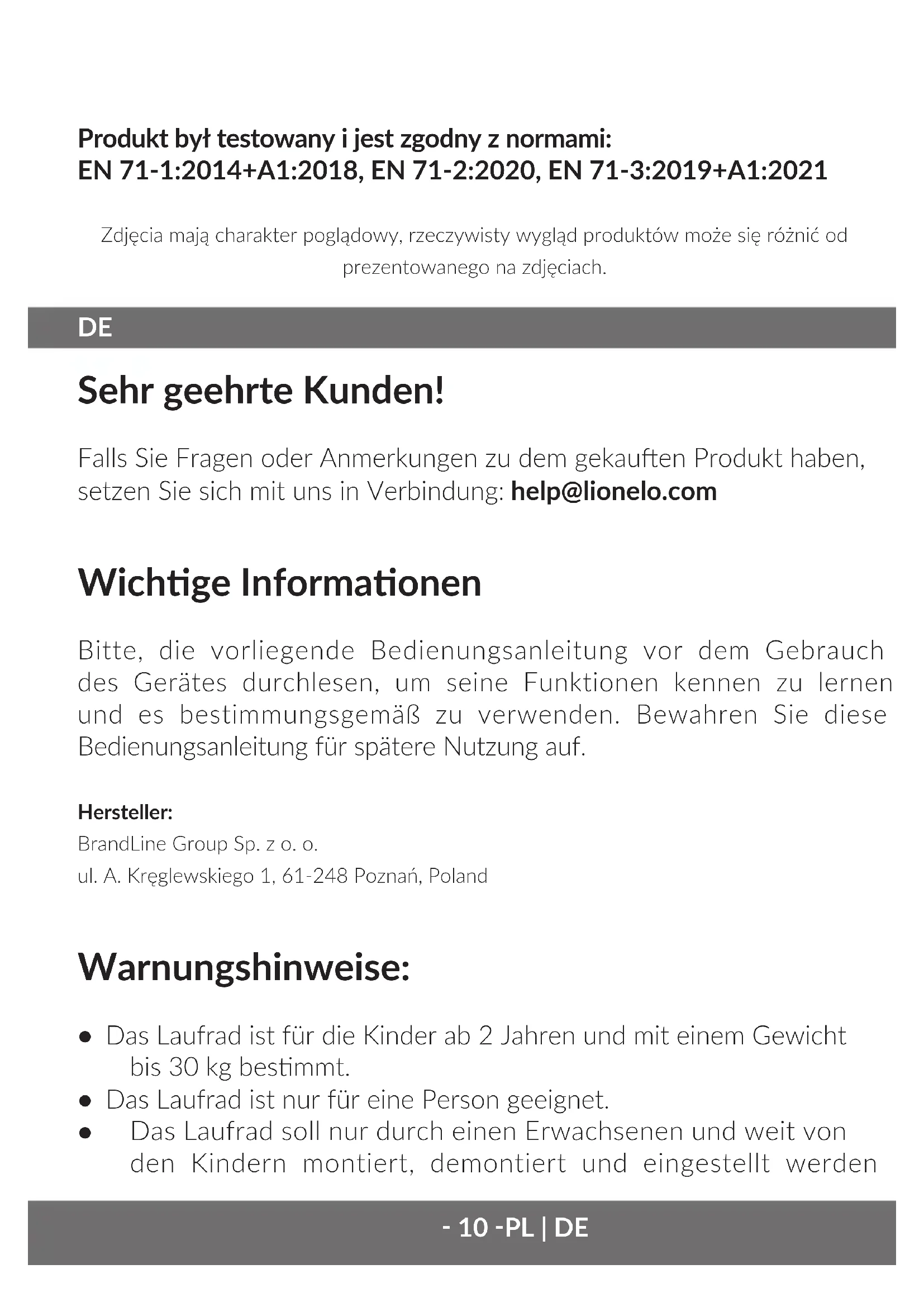 Setzen Sie den Bolzen (A) durch die Önung an der Gabel des Laufrads, dann in folgender Reihe: durch die Mue (B), Rad (C), zweite Mue (B) und zweite Önung an der Gabel. Schrauben Sie mit Hilfe des Inbusschlüssels die Muer an der Achse (D). Die Montage der beiden Räder erfolgt auf die gleiche Weise. Vor dem Gebrauch prüfen Sie, ob alle Befesgungselemente richg angezogen sind. Gebrauch Man soll sich auf dem Sael setzen, fest die beiden Fahrradgrie greifen und sich mit den Füßen abwechselnd vom Boden abstoßen. Nachdem das Laufrad in Fahrt kommt, soll man die Füße heben, um bequem zu fahren. Auf diese Weise soll das Kind lernen, wie im Gleichgewicht zu bleiben. Das Abbiegen erfolgt durch Drehen des Lenkers in Abbiegerichtung und Balancieren. Man soll so bremsen, dass die Füße den Boden berühren können. Instandhaltung und Reinigung Reinigen Sie das Laufrad mit einem feuchten Tuch, dann trocknen Sie es ab. Benutzen Sie keine ätzende oder Schleifmiel zur Reinigung des Produkts. Das Produkt wurde getestet und entspricht den Normen: EN 71-1:2014+A1:2018, EN 71-2:2020, EN 71-3:2019+A1:2021‑ 14 ‑DE | RU Уважаемый Клиент! Если у вас есть какие-либо комментарии или вопросы по поводу приобретенного вами продукта, свяжитесь с нами: help@lionelo.com Важная информация Пожалуйста, прочитайте данное руководство перед использованием продукта, чтобы ознакомиться с его функциями и использовать данный продукт по назначению. Сохраните данную инструкцию для дальнейшего использования.