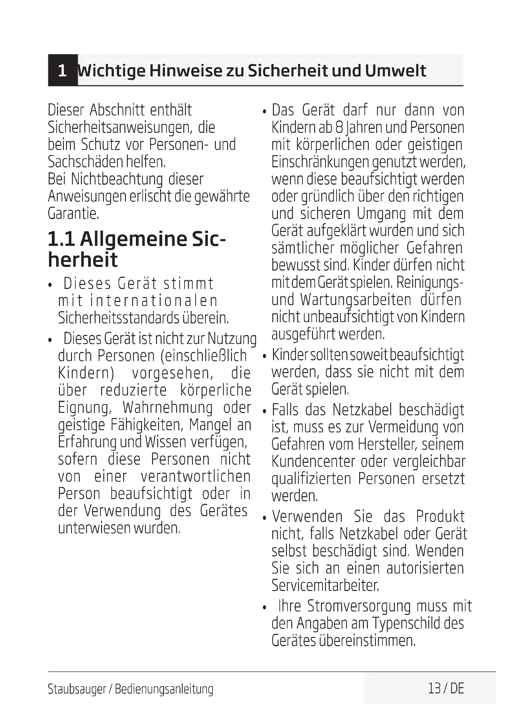 Staubsauger / Bedienungsanleitung 13 / DE 1 Wichtige Hinweise zu Sicherheit und Umwelt Dieser Abschnitt enthält Sicherheitsanweisungen, die beim Schutz vor Personen- und Sachschäden helfen. Bei Nichtbeachtung dieser Anweisungen erlischt die gewährte Garantie.
