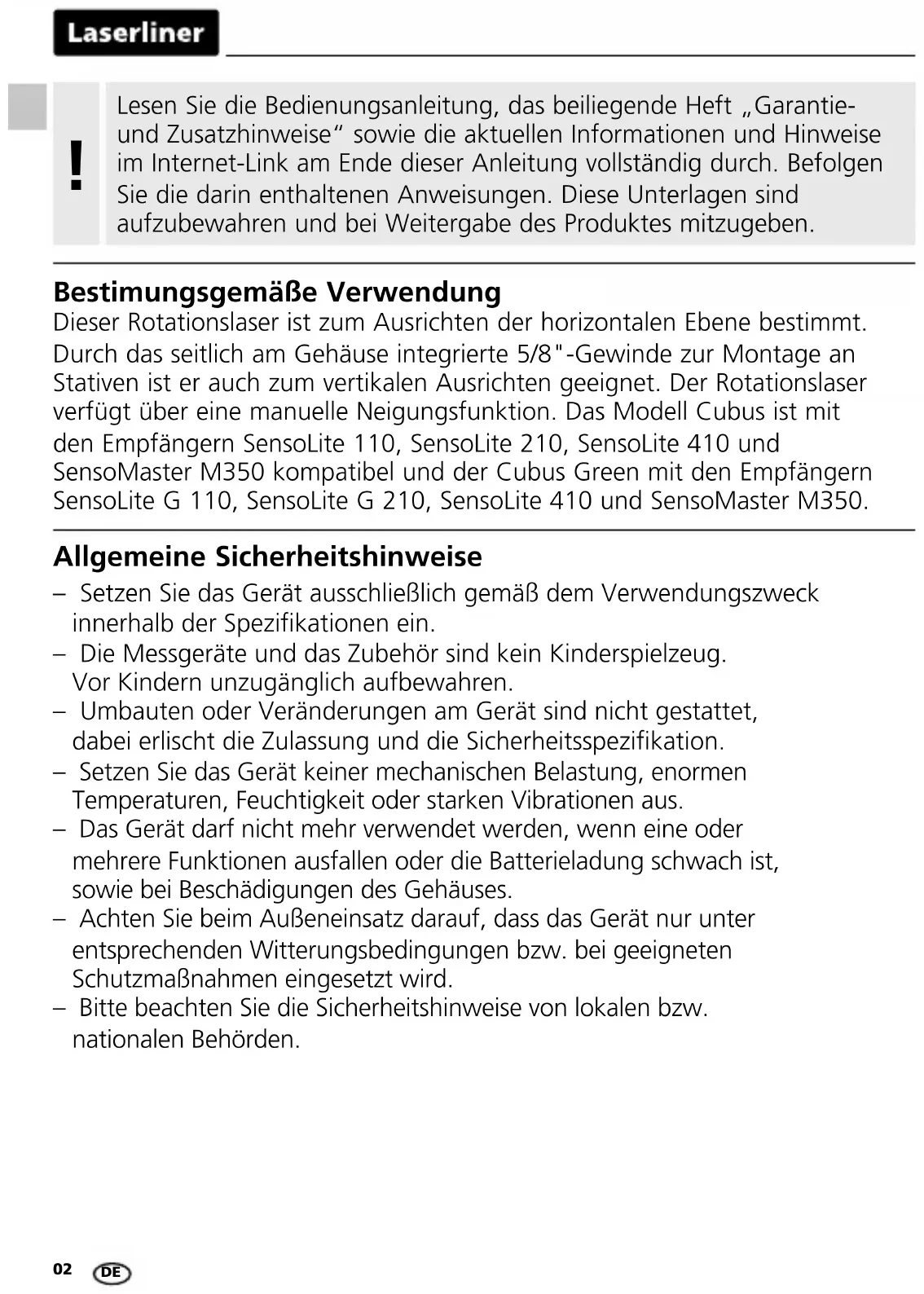 Allgemeine Sicherheitshinweise – Setzen Sie das Gerät ausschließlich gemäß dem Verwendungszweck innerhalb der Spezikationen ein. – Die Messgeräte und das Zubehör sind kein Kinderspielzeug. Vor Kindern unzugänglich aufbewahren. – Umbauten oder Veränderungen am Gerät sind nicht gestattet, dabei erlischt die Zulassung und die Sicherheitsspezikation. – Setzen Sie das Gerät keiner mechanischen Belastung, enormen Temperaturen, Feuchtigkeit oder starken Vibrationen aus. – Das Gerät darf nicht mehr verwendet werden, wenn eine oder mehrere Funktionen ausfallen oder die Batterieladung schwach ist, sowie bei Beschädigungen des Gehäuses. – Achten Sie beim Außeneinsatz darauf, dass das Gerät nur unter entsprechenden Witterungsbedingungen bzw. bei geeigneten Schutzmaßnahmen eingesetzt wird. – Bitte beachten Sie die Sicherheitshinweise von lokalen bzw. nationalen Behörden. Bestimungsgemäße Verwendung Dieser Rotationslaser ist zum Ausrichten der horizontalen Ebene bestimmt. Durch das seitlich am Gehäuse integrierte 5/8"-Gewinde zur Montage an Stativen ist er auch zum vertikalen Ausrichten geeignet. Der Rotationslaser verfügt über eine manuelle Neigungsfunktion. Das Modell Cubus ist mit den Empfängern SensoLite 110, SensoLite 210, SensoLite 410 und SensoMaster M350 kompatibel und der Cubus Green mit den Empfängern SensoLite G 110, SensoLite G 210, SensoLite 410 und SensoMaster M350.Cubus / Cubus Green