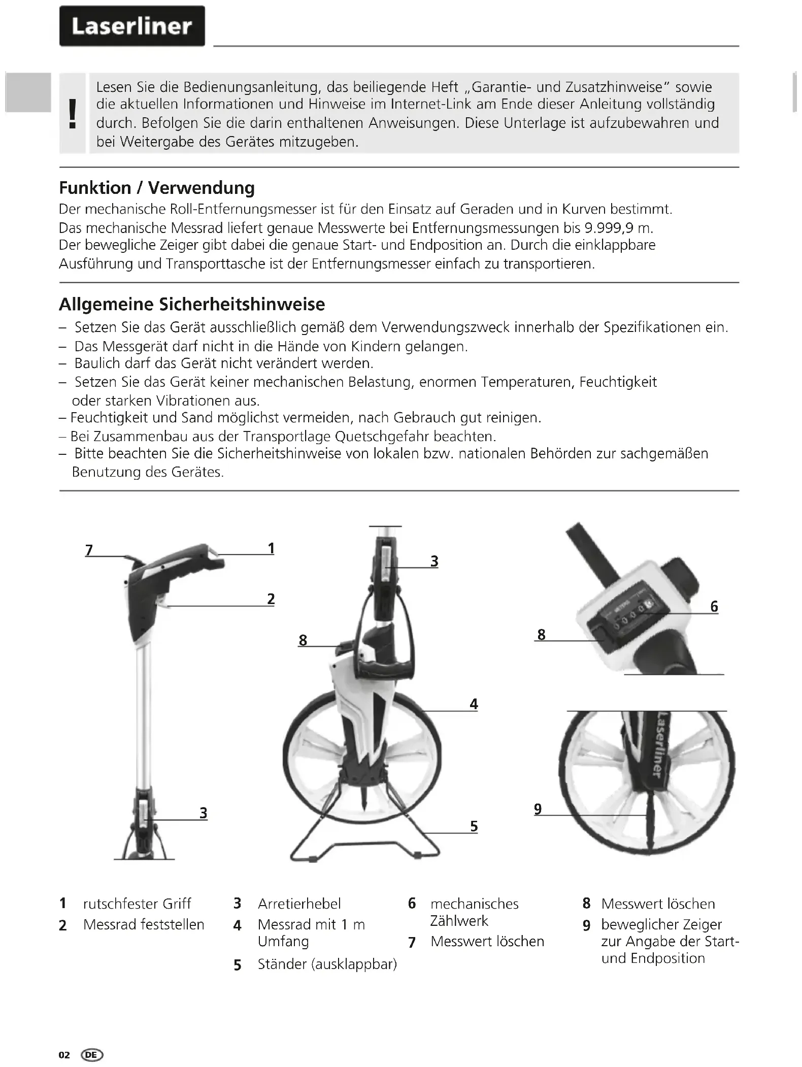 Funktion / Verwendung Der mechanische Roll-Entfernungsmesser ist für den Einsatz auf Geraden und in Kurven bestimmt. Das mechanische Messrad liefert genaue Messwerte bei Entfernungsmessungen bis 9.999,9 m. Der bewegliche Zeiger gibt dabei die genaue Start- und Endposition an. Durch die einklappbare Ausführung und Transporttasche ist der Entfernungsmesser einfach zu transportieren. Allgemeine Sicherheitshinweise – Setzen Sie das Gerät ausschließlich gemäß dem Verwendungszweck innerhalb der Spezikationen ein. – Das Messgerät darf nicht in die Hände von Kindern gelangen. – Baulich darf das Gerät nicht verändert werden. – Setzen Sie das Gerät keiner mechanischen Belastung, enormen Temperaturen, Feuchtigkeit oder starken Vibrationen aus. – Feuchtigkeit und Sand möglichst vermeiden, nach Gebrauch gut reinigen. – Bei Zusammenbau aus der Transportlage Quetschgefahr beachten. – Bitte beachten Sie die Sicherheitshinweise von lokalen bzw. nationalen Behörden zur sachgemäßen Benutzung des Gerätes.