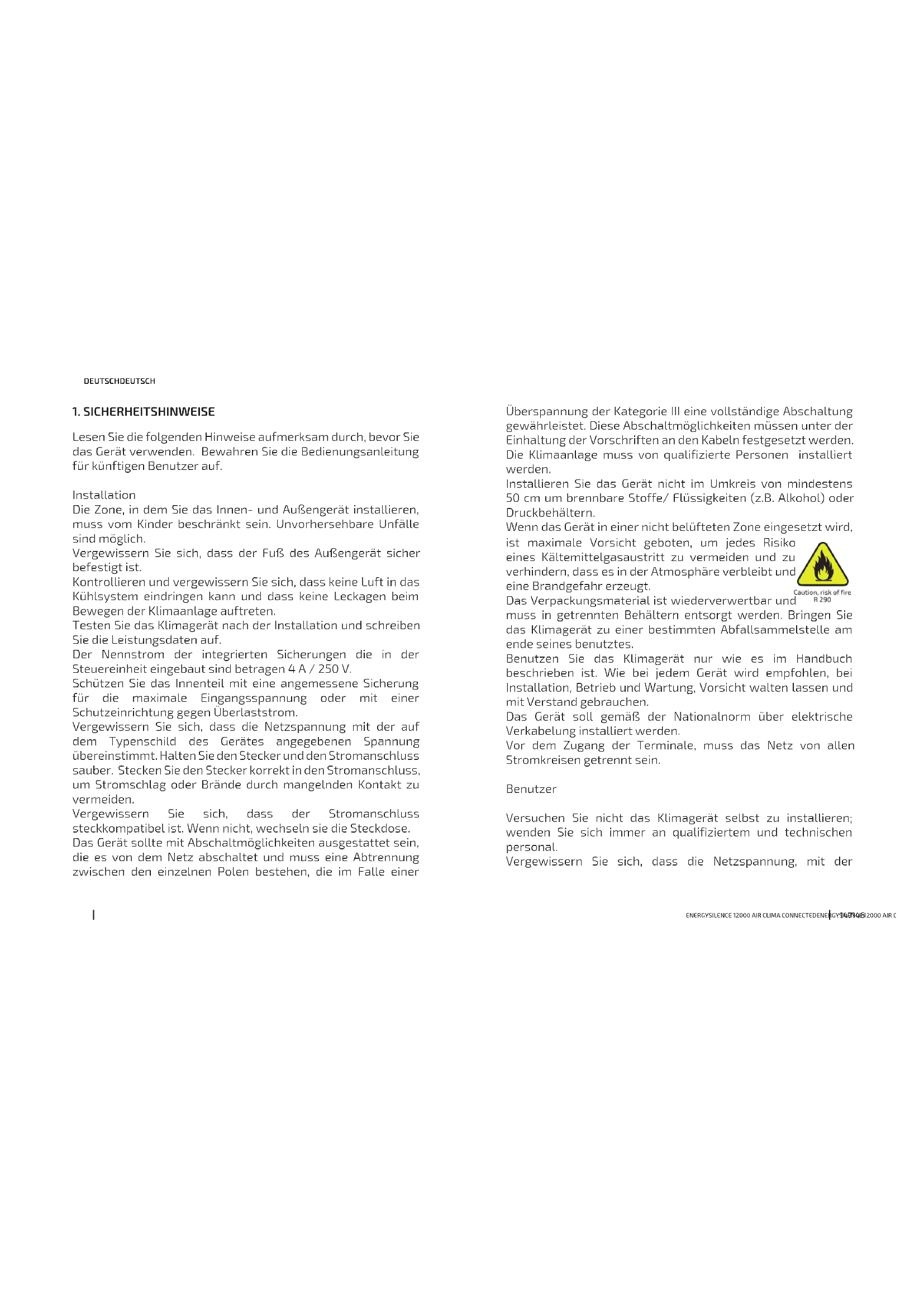 Lesen Sie die folgenden Hinweise aufmerksam durch, bevor Sie das Gerät verwenden. Bewahren Sie die Bedienungsanleitung für künftigen Benutzer auf. Installation Die Zone, in dem Sie das Innen- und Außengerät installieren, muss vom Kinder beschränkt sein. Unvorhersehbare Unfälle sind möglich. Vergewissern Sie sich, dass der Fuß des Außengerät sicher befestigt ist. Kontrollieren und vergewissern Sie sich, dass keine Luft in das Kühlsystem eindringen kann und dass keine Leckagen beim Bewegen der Klimaanlage auftreten. Testen Sie das Klimagerät nach der Installation und schreiben Sie die Leistungsdaten auf. Der Nennstrom der integrierten Sicherungen die in der Steuereinheit eingebaut sind betragen 4 A / 250 V. Schützen Sie das Innenteil mit eine angemessene Sicherung für die maximale Eingangsspannung oder mit einer Schutzeinrichtung gegen Überlaststrom. Vergewissern Sie sich, dass die Netzspannung mit der auf dem Typenschild des Gerätes angegebenen Spannung übereinstimmt. Halten Sie den Stecker und den Stromanschluss sauber. Stecken Sie den Stecker korrekt in den Stromanschluss, um Stromschlag oder Brände durch mangelnden Kontakt zu vermeiden. Vergewissern Sie sich, dass der Stromanschluss steckkompatibel ist. Wenn nicht, wechseln sie die Steckdose. Das Gerät sollte mit Abschaltmöglichkeiten ausgestattet sein, die es von dem Netz abschaltet und muss eine Abtrennung zwischen den einzelnen Polen bestehen, die im Falle einer Überspannung der Kategorie III eine vollständige Abschaltung gewährleistet. Diese Abschaltmöglichkeiten müssen unter der Einhaltung der Vorschriften an den Kabeln festgesetzt werden. Die Klimaanlage muss von qualifizierte Personen installiert werden. Installieren Sie das Gerät nicht im Umkreis von mindestens 50 cm um brennbare Stoffe/ Flüssigkeiten (z.B. Alkohol) oder Druckbehältern. Wenn das Gerät in einer nicht belüfteten Zone eingesetzt wird, ist maximale Vorsicht geboten, um jedes Risiko eines Kältemittelgasaustritt zu vermeiden und zu verhindern, dass es in der Atmosphäre verbleibt und eine Brandgefahr erzeugt. Das Verpackungsmaterial ist wiederverwertbar und muss in getrennten Behältern entsorgt werden. Bringen Sie das Klimagerät zu einer bestimmten Abfallsammelstelle am ende seines benutztes. Benutzen Sie das Klimagerät nur wie es im Handbuch beschrieben ist. Wie bei jedem Gerät wird empfohlen, bei Installation, Betrieb und Wartung, Vorsicht walten lassen und mit Verstand gebrauchen. Das Gerät soll gemäß der Nationalnorm über elektrische Verkabelung installiert werden. Vor dem Zugang der Terminale, muss das Netz von allen Stromkreisen getrennt sein. Benutzer Versuchen Sie nicht das Klimagerät selbst zu installieren; wenden Sie sich immer an qualifiziertem und technischen personal. Vergewissern Sie sich, dass die Netzspannung, mit derENERGYSILENCE 12000 AIR CLIMA CONNECTEDENERGYSILENCE 12000 AIR CLIMA CONNECTED