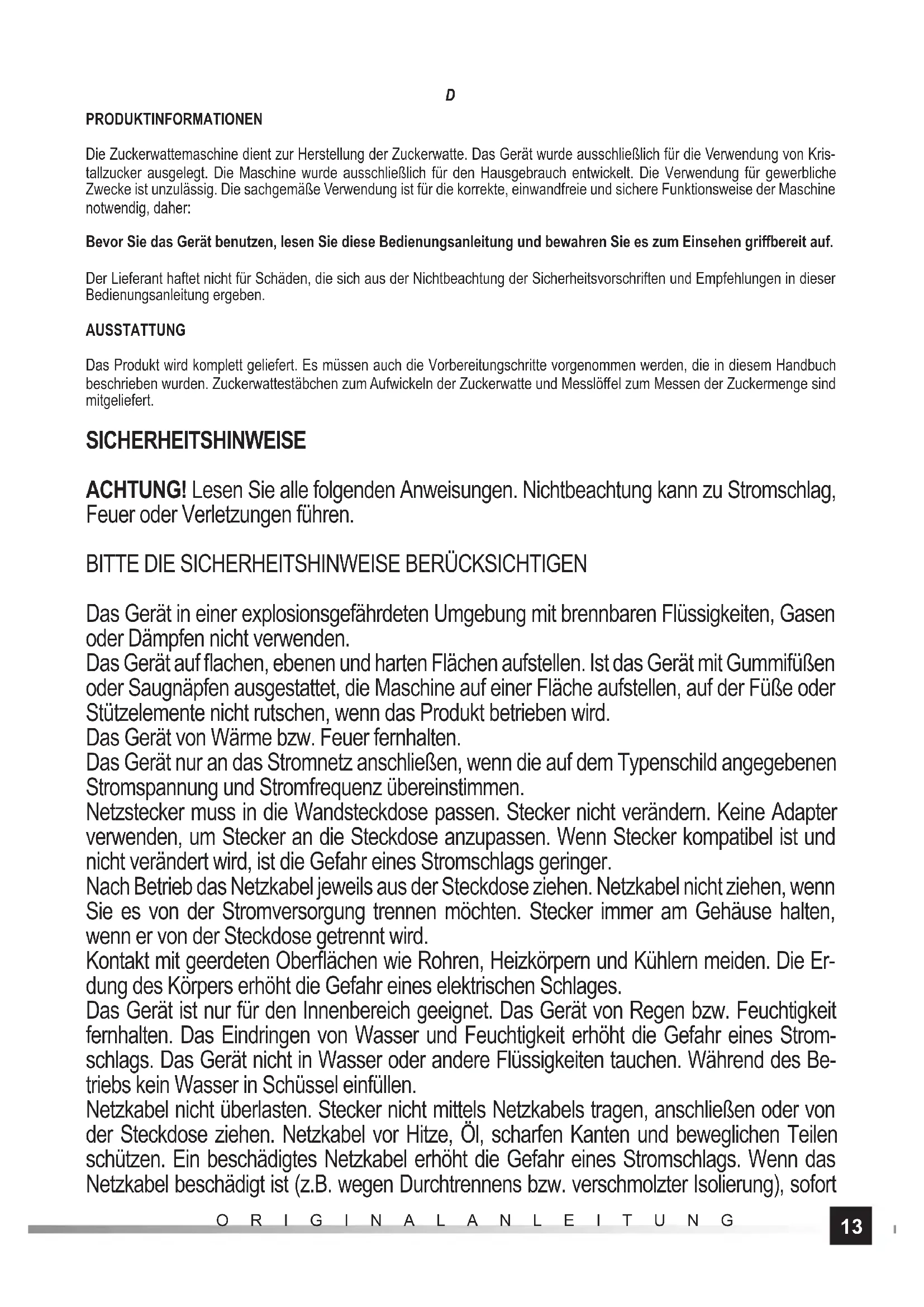 PRODUKTINFORMATIONEN Die Zuckerwattemaschine dient zur Herstellung der Zuckerwatte. Das Gerät wurde ausschließlich für die Verwendung von Kris- tallzucker ausgelegt. Die Maschine wurde ausschließlich für den Hausgebrauch entwickelt. Die Verwendung für gewerbliche Zwecke ist unzulässig. Die sachgemäße Verwendung ist für die korrekte, einwandfreie und sichere Funktionsweise der Maschine notwendig, daher: Bevor Sie das Gerät benutzen, lesen Sie diese Bedienungsanleitung und bewahren Sie es zum Einsehen griff bereit auf. Der Lieferant haftet nicht für Schäden, die sich aus der Nichtbeachtung der Sicherheitsvorschriften und Empfehlungen in dieser Bedienungsanleitung ergeben. AUSSTATTUNG Das Produkt wird komplett geliefert. Es müssen auch die Vorbereitungschritte vorgenommen werden, die in diesem Handbuch beschrieben wurden. Zuckerwattestäbchen zum Aufwickeln der Zuckerwatte und Messlöff el zum Messen der Zuckermenge sind mitgeliefert. SICHERHEITSHINWEISE ACHTUNG! Lesen Sie alle folgenden Anweisungen. Nichtbeachtung kann zu Stromschlag, Feuer oder Verletzungen führen.