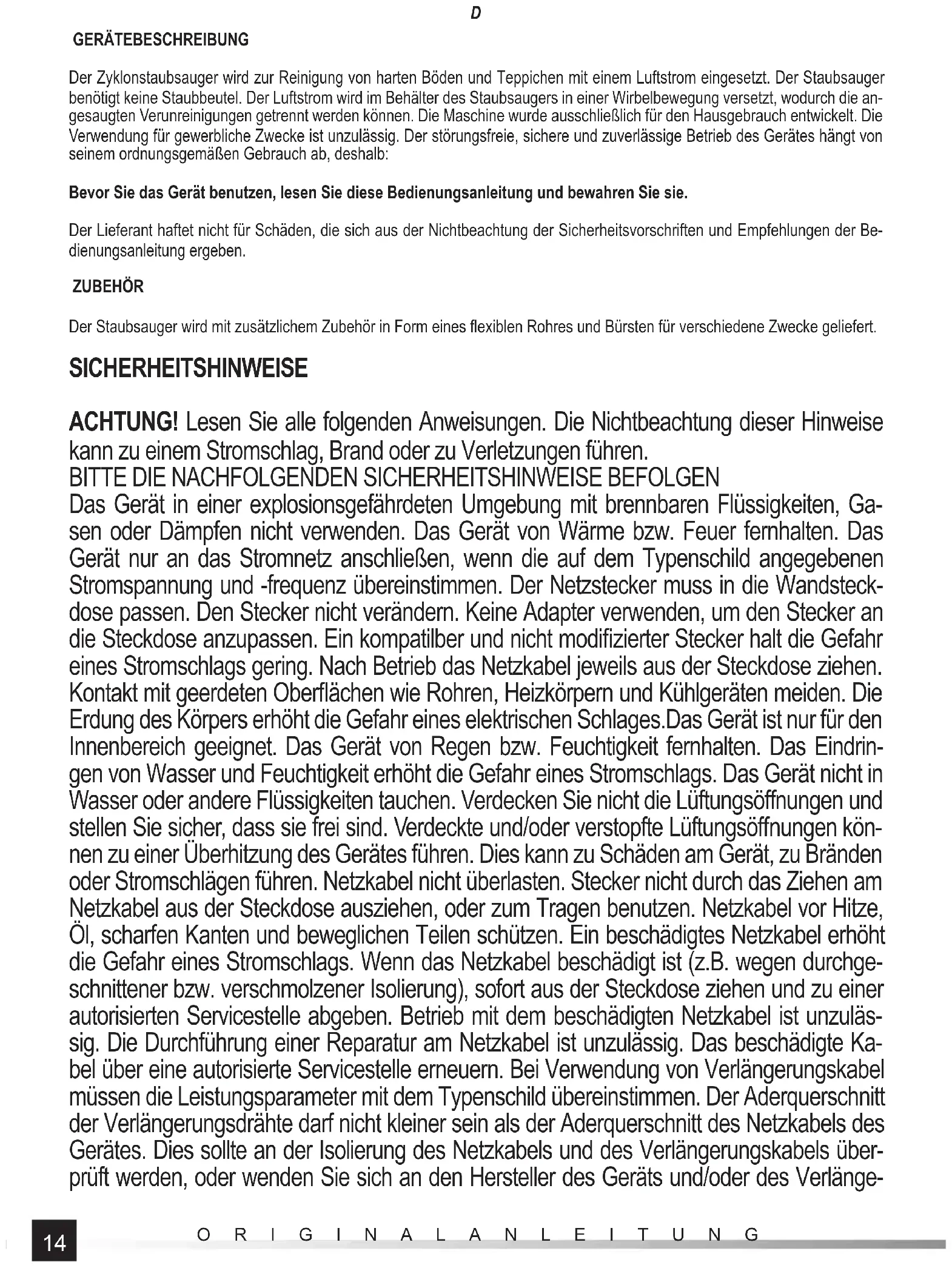 GERÄTEBESCHREIBUNG Der Zyklonstaubsauger wird zur Reinigung von harten Böden und Teppichen mit einem Luftstrom eingesetzt. Der Staubsauger benötigt keine Staubbeutel. Der Luftstrom wird im Behälter des Staubsaugers in einer Wirbelbewegung versetzt, wodurch die an- gesaugten Verunreinigungen getrennt werden können. Die Maschine wurde ausschließlich für den Hausgebrauch entwickelt. Die Verwendung für gewerbliche Zwecke ist unzulässig. Der störungsfreie, sichere und zuverlässige Betrieb des Gerätes hängt von seinem ordnungsgemäßen Gebrauch ab, deshalb: Bevor Sie das Gerät benutzen, lesen Sie diese Bedienungsanleitung und bewahren Sie sie. Der Lieferant haftet nicht für Schäden, die sich aus der Nichtbeachtung der Sicherheitsvorschriften und Empfehlungen der Be- dienungsanleitung ergeben. ZUBEHÖR Der Staubsauger wird mit zusätzlichem Zubehör in Form eines fl exiblen Rohres und Bürsten für verschiedene Zwecke geliefert. SICHERHEITSHINWEISE ACHTUNG! Lesen Sie alle folgenden Anweisungen. Die Nichtbeachtung dieser Hinweise kann zu einem Stromschlag, Brand oder zu Verletzungen führen.
