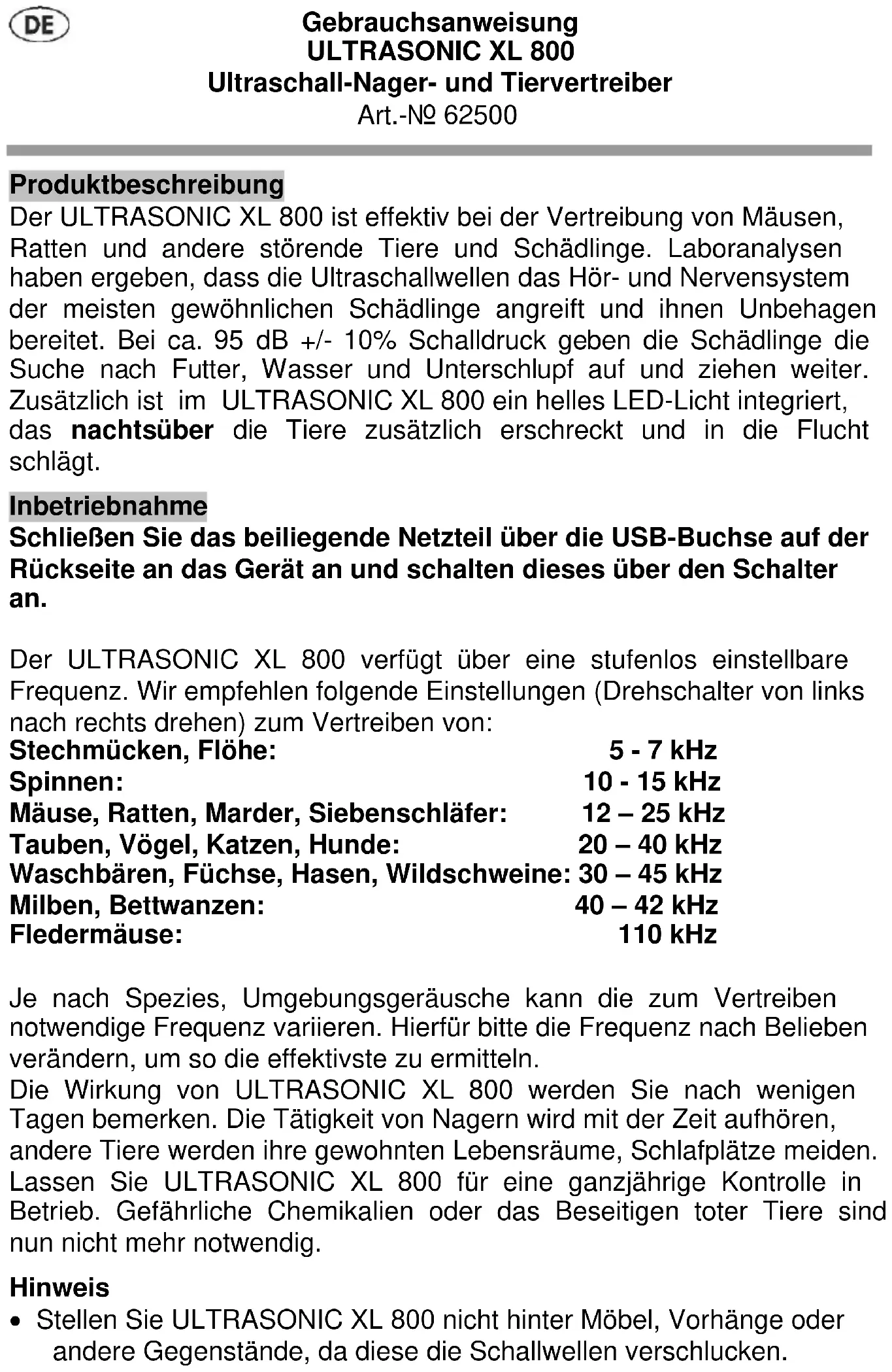 Produktbeschreibung Der ULTRASONIC XL 800 ist effektiv bei der Vertreibung von Mäusen, Ratten und andere störende Tiere und Schädlinge. Laboranalysen haben ergeben, dass die Ultraschallwellen das Hör- und Nervensystem der meisten gewöhnlichen Schädlinge angreift und ihnen Unbehagen bereitet. Bei ca. 95 dB +/- 10% Schalldruck geben die Schädlinge die Suche nach Futter, Wasser und Unterschlupf auf und ziehen weiter. Zusätzlich ist im ULTRASONIC XL 800 ein helles LED-Licht integriert, das nachtsüber die Tiere zusätzlich erschreckt und in die Flucht schlägt. Inbetriebnahme Schließen Sie das beiliegende Netzteil über die USB-Buchse auf der Rückseite an das Gerät an und schalten dieses über den Schalter an. Der ULTRASONIC XL 800 verfügt über eine stufenlos einstellbare Frequenz. Wir empfehlen folgende Einstellungen (Drehschalter von links nach rechts drehen) zum Vertreiben von: Stechmücken, Flöhe: 5 - 7 kHz Spinnen: 10 - 15 kHz Mäuse, Ratten, Marder, Siebenschläfer: 12 – 25 kHz Tauben, Vögel, Katzen, Hunde: 20 – 40 kHz Waschbären, Füchse, Hasen, Wildschweine: 30 – 45 kHz Milben, Bettwanzen: 40 – 42 kHz Fledermäuse: 110 kHz Je nach Spezies, Umgebungsgeräusche kann die zum Vertreiben notwendige Frequenz variieren. Hierfür bitte die Frequenz nach Belieben verändern, um so die effektivste zu ermitteln. Die Wirkung von ULTRASONIC XL 800 werden Sie nach wenigen Tagen bemerken. Die Tätigkeit von Nagern wird mit der Zeit aufhören, andere Tiere werden ihre gewohnten Lebensräume, Schlafplätze meiden. Lassen Sie ULTRASONIC XL 800 für eine ganzjährige Kontrolle in Betrieb. Gefährliche Chemikalien oder das Beseitigen toter Tiere sind nun nicht mehr notwendig. Hinweis Stellen Sie ULTRASONIC XL 800 nicht hinter Möbel, Vorhänge oder andere Gegenstände, da diese die Schallwellen verschlucken. Halten Sie ULTRASONIC XL 800 nicht ans Ohr, wenn Sie es testen.