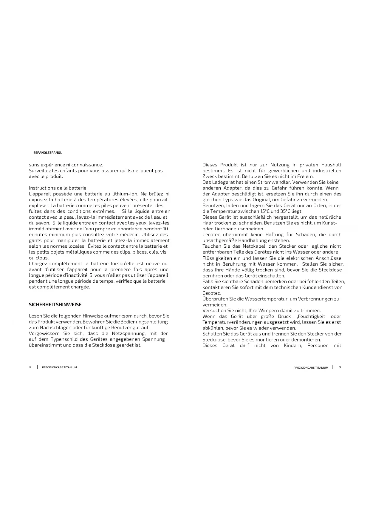 sans expérience ni connaissance. Surveillez les enfants pour vous assurer qu’ils ne jouent pas avec le produit. Instructions de la batterie L’appareil possède une batterie au lithium-ion. Ne brûlez ni exposez la batterie à des températures élevées, elle pourrait exploser. La batterie comme les piles peuvent présenter des fuites dans des conditions extrêmes. Si le liquide entre en contact avec la peau, lavez-la immédiatement avec de l’eau et du savon. Si le liquide entre en contact avec les yeux, lavez-les immédiatement avec de l’eau propre en abondance pendant 10 minutes minimum puis consultez votre médecin. Utilisez des gants pour manipuler la batterie et jetez-la immédiatement selon les normes locales. Évitez le contact entre la batterie et les petits objets métalliques comme des clips, pièces, clés, vis ou clous. Chargez complètement la batterie lorsqu’elle est neuve ou avant d’utiliser l’appareil pour la première fois après une longue période d’inactivité. Si vous n’allez pas utiliser l’appareil pendant une longue période de temps, vériez que la batterie est complètement chargée. SICHERHEITSHINWEISE Lesen Sie die folgenden Hinweise aufmerksam durch, bevor Sie das Produkt verwenden. Bewahren Sie die Bedienungsanleitung zum Nachschlagen oder für künftige Benutzer gut auf. Vergewissern Sie sich, dass die Netzspannung, mit der auf dem Typenschild des Gerätes angegebenen Spannung übereinstimmt und dass die Steckdose geerdet ist. Dieses Produkt ist nur zur Nutzung in privaten Haushalt bestimmt. Es ist nicht für gewerblichen und industriellen Zweck bestimmt. Benutzen Sie es nicht im Freiem. Das Ladegerät hat einen Stromwandler. Verwenden Sie keine anderen Adapter, da dies zu Gefahr führen könnte. Wenn der Adapter beschädigt ist, ersetzen Sie ihn durch einen des gleichen Typs wie das Original, um Gefahr zu vermeiden. Benutzen, laden und lagern Sie das Gerät nur an Orten, in der die Temperatur zwischen 15°C und 35°C liegt. Dieses Gerät ist ausschließlich hergestellt, um das natürliche Haar trocken zu schneiden. Benutzen Sie es nicht, um Kunst- oder Tierhaar zu schneiden. Cecotec übernimmt keine Haftung für Schäden, die durch unsachgemäße Handhabung enstehen. Tauchen Sie das Netzkabel, den Stecker oder jegliche nicht entfernbaren Teile des Gerätes nicht ins Wasser oder andere Flüssigkeiten ein und lassen Sie die elektrischen Anschlüsse nicht in Berührung mit Wasser kommen. Stellen Sie sicher, dass Ihre Hände völlig trocken sind, bevor Sie die Steckdose berühren oder das Gerät einschalten. Falls Sie sichtbare Schäden bemerken oder bei fehlenden Teilen, kontaktieren Sie sofort mit dem technischen Kundendienst von Cecotec. Überprüfen Sie die Wassertemperatur, um Verbrennungen zu vermeiden. Versuchen Sie nicht, Ihre Wimpern damit zu trimmen. Wenn das Gerät über große Druck- ,Feuchtigkeit- oder Temperaturveränderungen ausgesetzt wird, lassen Sie es erst abkühlen, bevor Sie es wieder verwenden. Schalten Sie das Gerät aus und trennen Sie den Stecker von der Steckdose, bevor Sie es montieren oder demontieren. Dieses Gerät darf nicht von Kindern, Personen mitPRECISIONCARE TITANIUM PRECISIONCARE TITANIUM