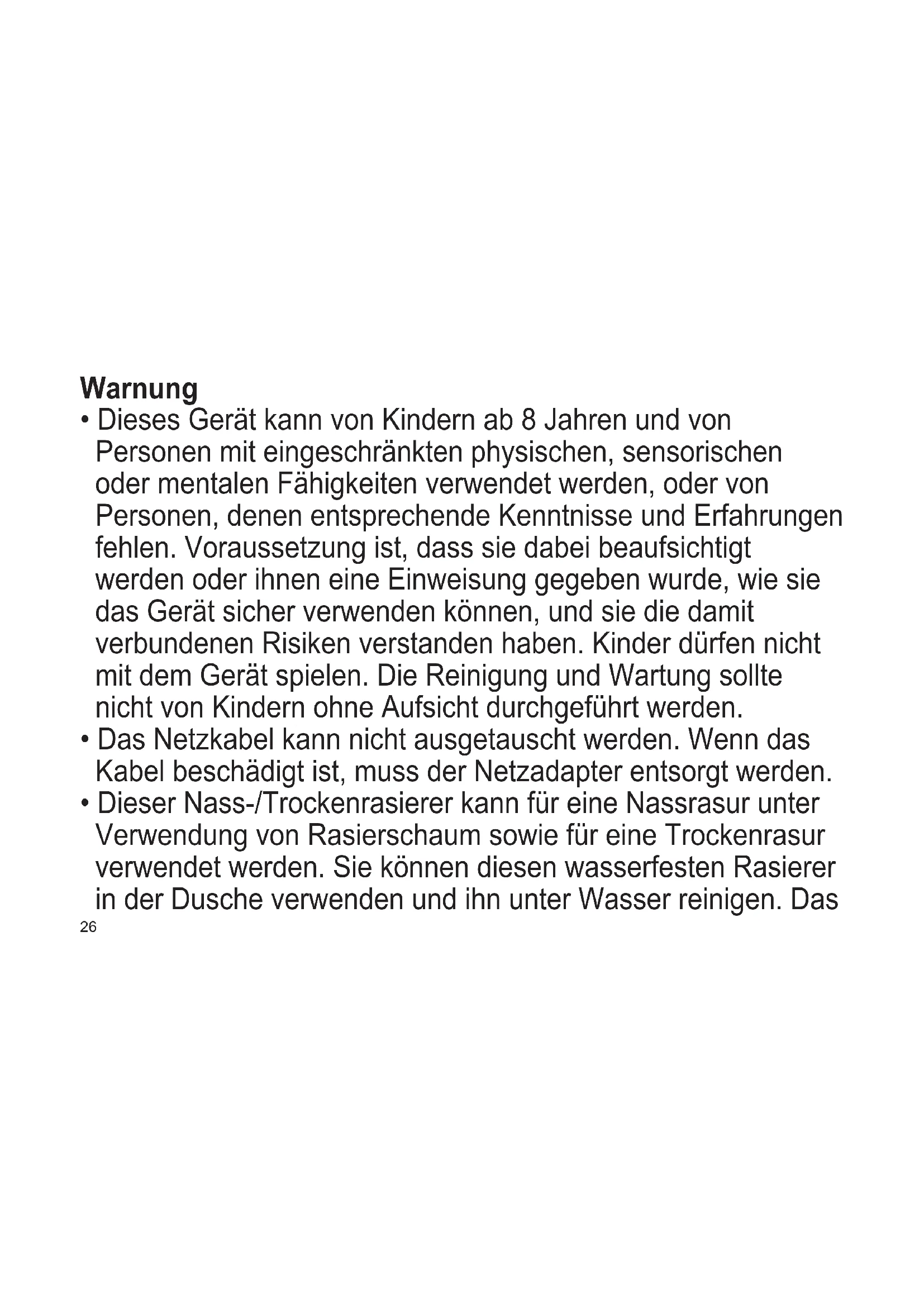 Sonst kann es zu einem elektrischen Schlag oder Verletzungen kommen. Verwenden Sie den Rasierer nicht gemeinsam mit Ihrer Familie oder anderen Personen