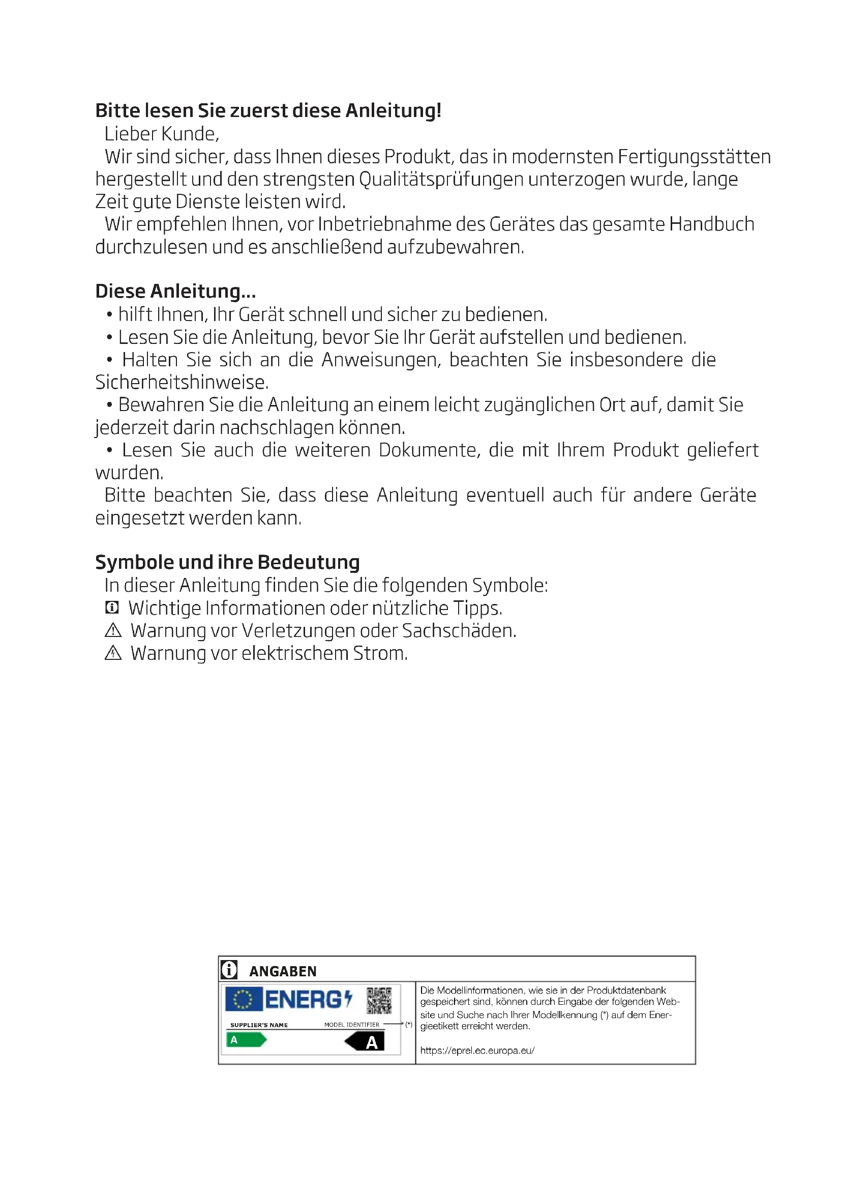 - Lesen Sie die Anleitung, bevor Sie Ihr Gerät aufstellen und bedienen.