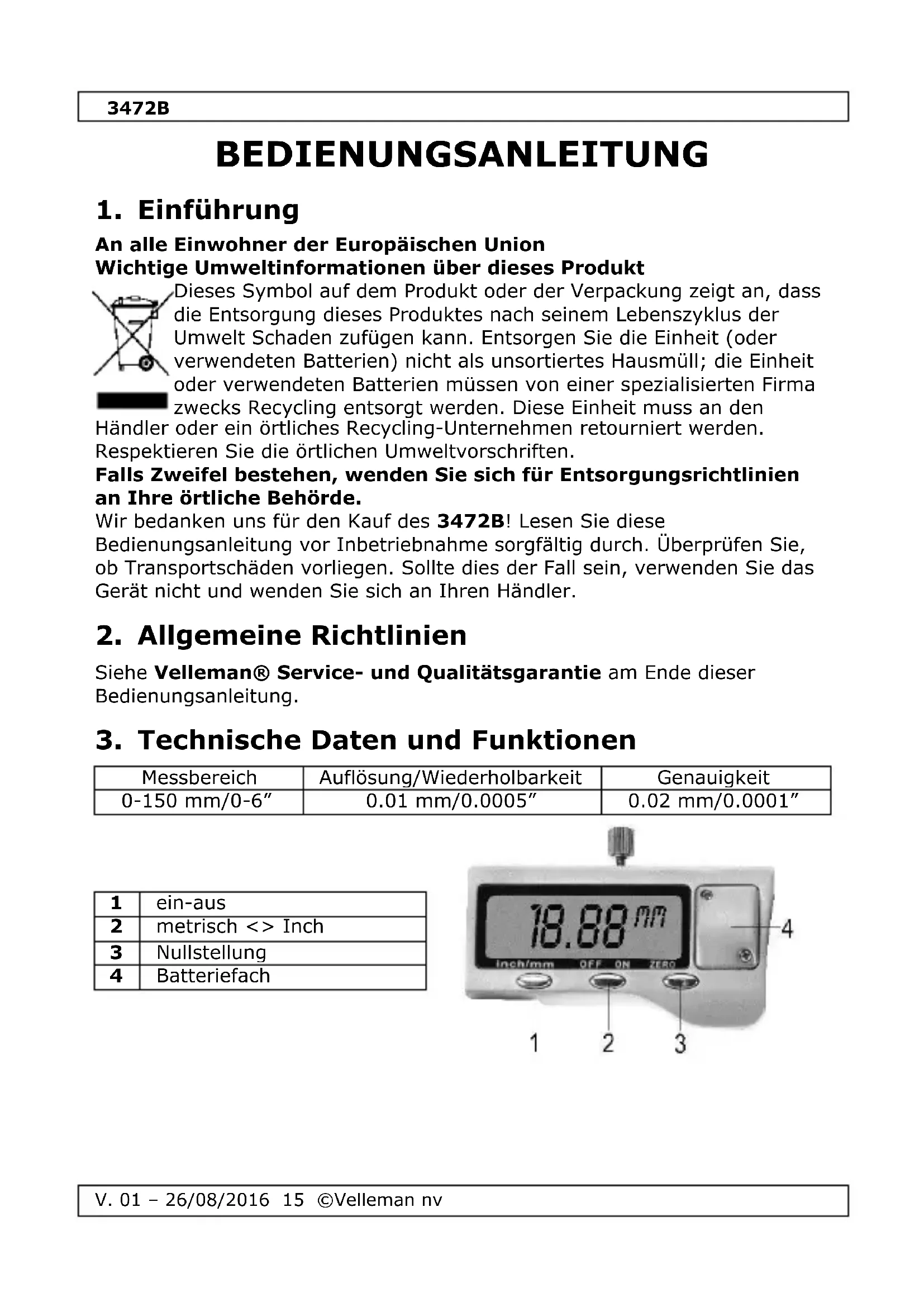An alle Einwohner der Europäischen Union Wichtige Umweltinformationen über dieses Produkt Dieses Symbol auf dem Produkt oder der Verpackung zeigt an, dass die Entsorgung dieses Produktes nach seinem Lebenszyklus der Umwelt Schaden zufügen kann. Entsorgen Sie die Einheit (oder verwendeten Batterien) nicht als unsortiertes Hausmüll; die Einheit oder verwendeten Batterien müssen von einer spezialisierten Firma zwecks Recycling entsorgt werden. Diese Einheit muss an den Händler oder ein örtliches Recycling-Unternehmen retourniert werden. Respektieren Sie die örtlichen Umweltvorschriften. Falls Zweifel bestehen, wenden Sie sich für Entsorgungsrichtlinien an Ihre örtliche Behörde. Wir bedanken uns für den Kauf des 3472B! Lesen Sie diese Bedienungsanleitung vor Inbetriebnahme sorgfältig durch. Überprüfen Sie, ob Transportschäden vorliegen. Sollte dies der Fall sein, verwenden Sie das Gerät nicht und wenden Sie sich an Ihren Händler.