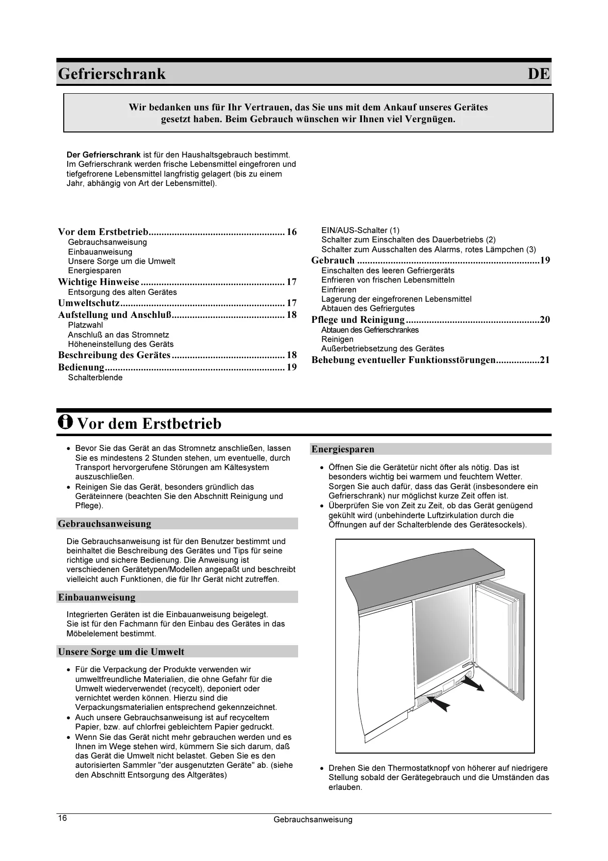 - Wir bedanken uns für Ihr Vertrauen, das Sie uns mit dem Ankauf unseres Gerätes gesetzt haben. Beim Gebrauch wünschen wir Ihnen viel Vergnügen. Der Gefrierschrank ist für den Haushaltsgebrauch bestimmt. Im Gefrierschrank werden frische Lebensmittel eingefroren und tiefgefrorene Lebensmittel langfristig gelagert (bis zu einem Jahr, abhängig von Art der Lebensmittel). Vor dem Erstbetrieb p. 16