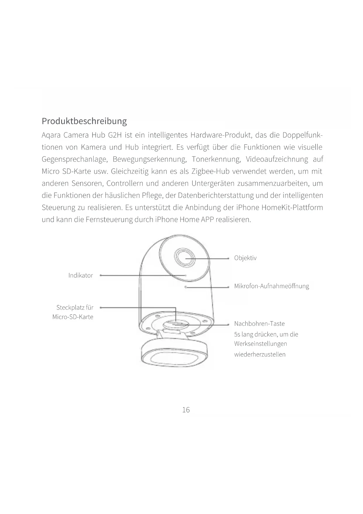 服務網址: www.aqara.com/support 制 造 商: 深圳綠米聯創科技有限公司 地 址: 深圳市南山區桃源街道留仙大道塘嶺路1號金騏智谷大廈8樓Indikator Steckplatz für Micro-SD-Karte Objektiv Mikrofon-Aufnahmeöffnung Nachbohren-Taste 5s lang drücken, um die Werkseinstellungen wiederherzustellen Produktbeschreibung Aqara Camera Hub G2H ist ein intelligentes Hardware-Produkt, das die Doppelfunk- tionen von Kamera und Hub integriert. Es verfügt über die Funktionen wie visuelle Gegensprechanlage, Bewegungserkennung, Tonerkennung, Videoaufzeichnung auf Micro SD-Karte usw. Gleichzeitig kann es als Zigbee-Hub verwendet werden, um mit anderen Sensoren, Controllern und anderen Untergeräten zusammenzuarbeiten, um die Funktionen der häuslichen Pflege, der Datenberichterstattung und der intelligenten Steuerung zu realisieren. Es unterstützt die Anbindung der iPhone HomeKit-Plattform und kann die Fernsteuerung durch iPhone Home APP realisieren.