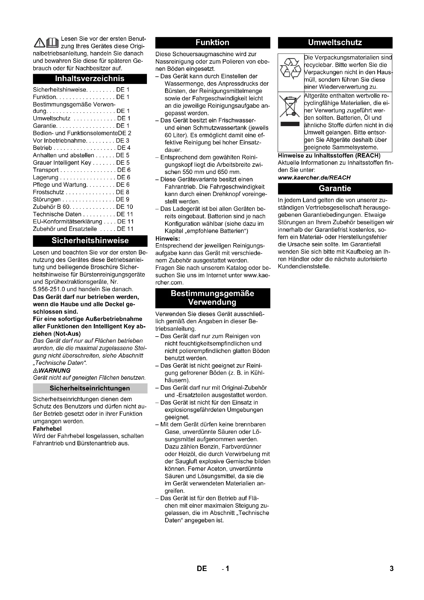 Lesen Sie vor der ersten Benut- zung Ihres Gerätes diese Origi- nalbetriebsanleitung, handeln Sie danach und bewahren Sie diese für späteren Ge- brauch oder für Nachbesitzer auf. Lesen und beachten Sie vor der ersten Be- nutzung des Gerätes diese Betriebsanlei- tung und beiliegende Broschüre Sicher- heitshinweise für Bürstenreinigungsgeräte und Sprühextraktionsgeräte, Nr. 5.956-251.0 und handeln Sie danach. Das Gerät darf nur betrieben werden, wenn die Haube und alle Deckel ge- schlossen sind. Für eine sofortige Außerbetriebnahme aller Funktionen den Intelligent Key ab- ziehen (Not-Aus) Das Gerät darf nur auf Flächen betrieben werden, die die maximal zugelassene Stei- gung nicht überschreiten, siehe Abschnitt „Technische Daten“. 몇 WARNUNG Gerät nicht auf geneigten Flächen benutzen. Sicherheitseinrichtungen dienen dem Schutz des Benutzers und dürfen nicht au- ßer Betrieb gesetzt oder in ihrer Funktion umgangen werden. Fahrhebel Wird der Fahrhebel losgelassen, schalten Fahrantrieb und Bürstenantrieb aus. Diese Scheuersaugmaschine wird zur Nassreinigung oder zum Polieren von ebe- nen Böden eingesetzt. – Das Gerät kann durch Einstellen der Wassermenge, des Anpressdrucks der Bürsten, der Reinigungsmittelmenge sowie der Fahrgeschwindigkeit leicht an die jeweilige Reinigungsaufgabe an- gepasst werden. – Das Gerät besitzt ein Frischwasser- und einen Schmutzwassertank (jeweils 60 Liter). Es ermöglicht damit eine ef- fektive Reinigung bei hoher Einsatz- dauer. – Entsprechend dem gewählten Reini- gungskopf liegt die Arbeitsbreite zwi- schen 550 mm und 650 mm. – Diese Gerätevariante besitzt einen Fahrantrieb. Die Fahrgeschwindigkeit kann durch einen Drehknopf voreinge- stellt werden. – Das Ladegerät ist bei allen Geräten be- reits eingebaut. Batterien sind je nach Konfiguration wählbar (siehe dazu im Kapitel „empfohlene Batterien“) Hinweis: Entsprechend der jeweiligen Reinigungs- aufgabe kann das Gerät mit verschiede- nem Zubehör ausgestattet werden. Fragen Sie nach unserem Katalog oder be- suchen Sie uns im Internet unter www.kae- rcher.com. Verwenden Sie dieses Gerät ausschließ- lich gemäß den Angaben in dieser Be- triebsanleitung. – Das Gerät darf nur zum Reinigen von nicht feuchtigkeitsempfindlichen und nicht polierempfindlichen glatten Böden benutzt werden. – Das Gerät ist nicht geeignet zur Reini- gung gefrorener Böden (z. B. in Kühl- häusern). – Das Gerät darf nur mit Original-Zubehör und -Ersatzteilen ausgestattet werden. – Das Gerät ist nicht für den Einsatz in explosionsgefährdeten Umgebungen geeignet. – Mit dem Gerät dürfen keine brennbaren Gase, unverdünnte Säuren oder Lö- sungsmittel aufgenommen werden. Dazu zählen Benzin, Farbverdünner oder Heizöl, die durch Verwirbelung mit der Saugluft explosive Gemische bilden können. Ferner Aceton, unverdünnte Säuren und Lösungsmittel, da sie die im Gerät verwendeten Materialien an- greifen. – Das Gerät ist für den Betrieb auf Flä- chen mit einer maximalen Steigung zu- gelassen, die im Abschnitt „Technische Daten“ angegeben ist. Hinweise zu Inhaltsstoffen (REACH) Aktuelle Informationen zu Inhaltsstoffen fin- den Sie unter: www.kaercher.de/REACH In jedem Land gelten die von unserer zu- ständigen Vertriebsgesellschaft herausge- gebenen Garantiebedingungen. Etwaige Störungen an Ihrem Zubehör beseitigen wir innerhalb der Garantiefrist kostenlos, so- fern ein Material- oder Herstellungsfehler die Ursache sein sollte. Im Garantiefall wenden Sie sich bitte mit Kaufbeleg an Ih- ren Händler oder die nächste autorisierte Kundendienststelle. Inhaltsverzeichnis Sicherheitshinweise... DE 1 Funktion... DE 1 Bestimmungsgemäße Verwen- dung... DE 1 Umweltschutz ... DE 1 Garantie... DE 1 Bedien- und FunktionselementeDE 2 Vor Inbetriebnahme... DE 3 Betrieb ... DE 4 Anhalten und abstellen ... DE 5 Grauer Intelligent Key ... DE 5 Transport ... DE 6 Lagerung ... DE 6 Pflege und Wartung... DE 6 Frostschutz ... DE 8 Störungen ... DE 9 Zubehör B 60... DE 10 Technische Daten ... DE 11 EU-Konformitätserklärung ... DE 11 Zubehör und Ersatzteile ... DE 11 Sicherheitshinweise Sicherheitseinrichtungen Funktion Bestimmungsgemäße Verwendung Umweltschutz Die Verpackungsmaterialien sind recyclebar. Bitte werfen Sie die Verpackungen nicht in den Haus- müll, sondern führen Sie diese einer Wiederverwertung zu. Altgeräte enthalten wertvolle re- cyclingfähige Materialien, die ei- ner Verwertung zugeführt wer- den sollten. Batterien, Öl und ähnliche Stoffe dürfen nicht in die Umwelt gelangen. Bitte entsor- gen Sie Altgeräte deshalb über geeignete Sammelsysteme. Garantie 3DE- 2 1 Hebel Saugbalkenabsenkung 2 Deckel Schmutzwassertank 3 Halteschiene für Homebase 4 Turbinenschutzsieb (unter dem Schwimmer) 5 Schmutzwassertank Spülystem (Option) 6 Flexibler Verschluss Spülsystem (Option) 7 Verriegelung Schmutzwassertank 8 Schwimmer 9 Schubbügel 10 Grobschmutzsieb 11 Schmutzwassertank 12 Einfüllöffnung Frischwassertank 13 Saugschlauch Reinigungsmittel (nur bei Variante DOSE) 14 Reinigungsmittelflasche (nur bei Vari- ante DOSE) 15 Verschluss Frischwassertank mit Filter 16 Halter Reinigungsmittelflasche 17 Frischwassertank 18 Verriegelung des Tanks 19 Reinigungskopf (Abbildung symbolisch) * 20 Bürstenwalzen (BR-Variante), Schei- benbürsten (BD-Variante) * 21 Grobschmutzbehälter (nur BR) 22 Batteriepolsicherung 23 Batterie * 24 Füllstandsanzeige Frischwasser 25 Pedal zum Anheben/Absenken des Reinigungskopfes 26 Hebel zur Verstellung Bürstenanpress- druck 27 Drehgriff zum Neigen des Saugbalkens 28 Flügelmuttern zum Befestigen des Saugbalkens 29 Saugschlauch 30 Saugbalken * 31 Anschlusskabel für Ladegerät 32 Füllautomatik Frischwassertank (Option) 33 Regulierknopf Wassermenge 34 Fahrhebel 35 Bedienpult 36 Abstellfläche für Reinigungsset „Home- base Box“ 37 Kabelhaken 38 Ablassschlauch Schmutzwasser mit Dosiereinrichtung