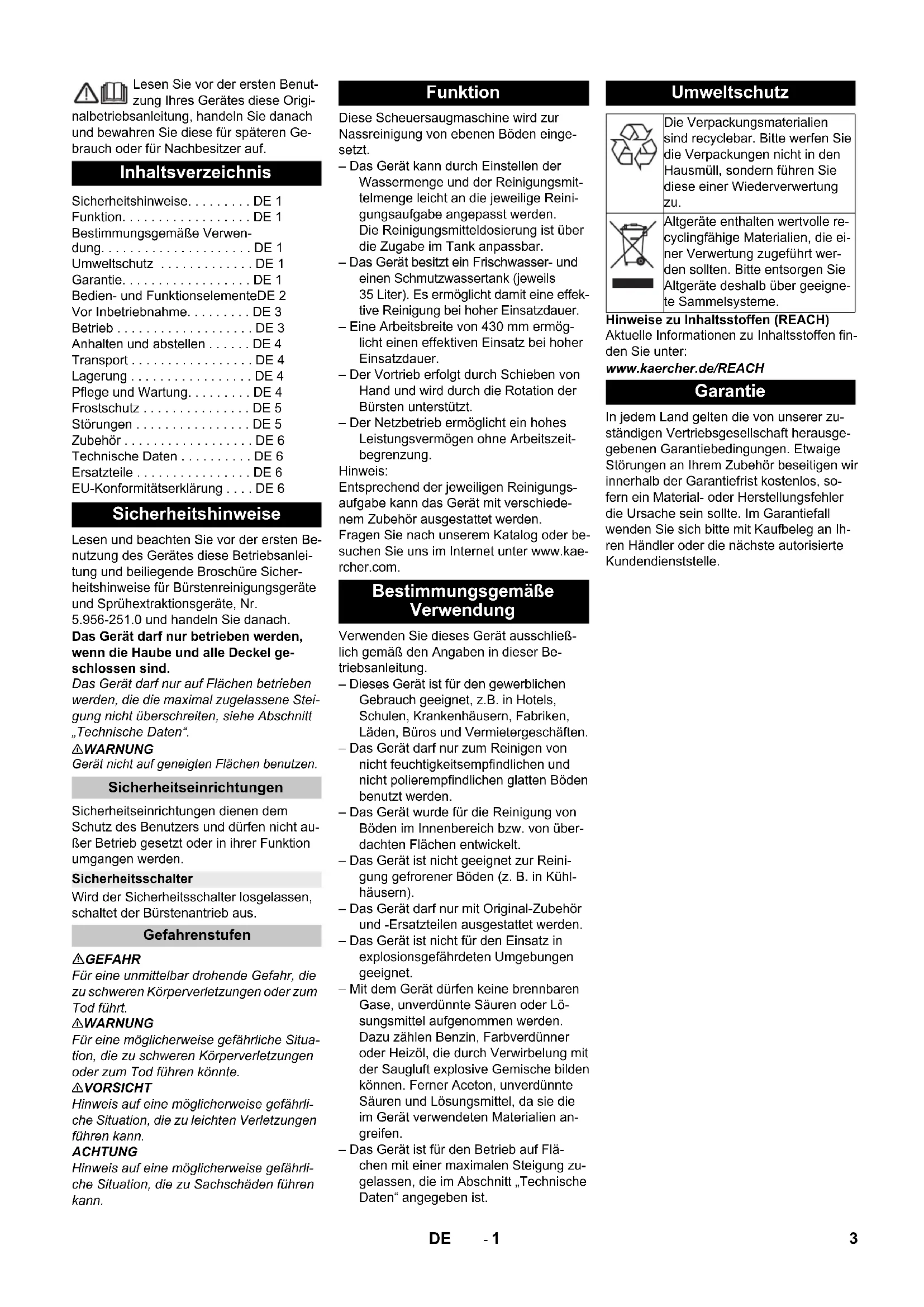 59785480 03/22 Deutsch 3 English 9 Français 15 Italiano 22 Nederlands 29 Español 35 Português 41 Dansk 47 Norsk 53 Svenska 59 Suomi 65 Ελληνικά 71 Türkçe 78 Русский 84 Magyar 92 Čeština 98 Slovenščina 104 Polski 110 Româneşte 116 Slovenčina 122 Hrvatski 128 Srpski 134 Български 140 Eesti 147 Latviešu 153 Lietuviškai 159 Українська 165 Indonesia 172 中文 178 ไทย 1842- 1 Lesen Sie vor der ersten Benut- zung Ihres Gerätes diese Origi- nalbetriebsanleitung, handeln Sie danach und bewahren Sie diese für späteren Ge- brauch oder für Nachbesitzer auf. Lesen und beachten Sie vor der ersten Be- nutzung des Gerätes diese Betriebsanlei- tung und beiliegende Broschüre Sicher- heitshinweise für Bürstenreinigungsgeräte und Sprühextraktionsgeräte, Nr. 5.956-251.0 und handeln Sie danach. Das Gerät darf nur betrieben werden, wenn die Haube und alle Deckel ge- schlossen sind. Das Gerät darf nur auf Flächen betrieben werden, die die maximal zugelassene Stei- gung nicht überschreiten, siehe Abschnitt „Technische Daten“. 몇 WARNUNG Gerät nicht auf geneigten Flächen benutzen. Sicherheitseinrichtungen dienen dem Schutz des Benutzers und dürfen nicht au- ßer Betrieb gesetzt oder in ihrer Funktion umgangen werden. Wird der Sicherheitsschalter losgelassen, schaltet der Bürstenantrieb aus. GEFAHR Für eine unmittelbar drohende Gefahr, die zu schweren Körperverletzungen oder zum Tod führt. 몇 WARNUNG Für eine möglicherweise gefährliche Situa- tion, die zu schweren Körperverletzungen oder zum Tod führen könnte. 몇 VORSICHT Hinweis auf eine möglicherweise gefährli- che Situation, die zu leichten Verletzungen führen kann. ACHTUNG Hinweis auf eine möglicherweise gefährli- che Situation, die zu Sachschäden führen kann. Diese Scheuersaugmaschine wird zur Nassreinigung von ebenen Böden einge- setzt. – Das Gerät kann durch Einstellen der Wassermenge und der Reinigungsmit- telmenge leicht an die jeweilige Reini- gungsaufgabe angepasst werden. Die Reinigungsmitteldosierung ist über die Zugabe im Tank anpassbar. – Das Gerät besitzt ein Frischwasser- und einen Schmutzwassertank (jeweils 35 Liter). Es ermöglicht damit eine effek- tive Reinigung bei hoher Einsatzdauer. – Eine Arbeitsbreite von 430 mm ermög- licht einen effektiven Einsatz bei hoher Einsatzdauer. – Der Vortrieb erfolgt durch Schieben von Hand und wird durch die Rotation der Bürsten unterstützt. – Der Netzbetrieb ermöglicht ein hohes Leistungsvermögen ohne Arbeitszeit- begrenzung. Hinweis: Entsprechend der jeweiligen Reinigungs- aufgabe kann das Gerät mit verschiede- nem Zubehör ausgestattet werden. Fragen Sie nach unserem Katalog oder be- suchen Sie uns im Internet unter www.kae- rcher.com. Verwenden Sie dieses Gerät ausschließ- lich gemäß den Angaben in dieser Be- triebsanleitung. – Dieses Gerät ist für den gewerblichen Gebrauch geeignet, z.B. in Hotels, Schulen, Krankenhäusern, Fabriken, Läden, Büros und Vermietergeschäften. – Das Gerät darf nur zum Reinigen von nicht feuchtigkeitsempfindlichen und nicht polierempfindlichen glatten Böden benutzt werden. – Das Gerät wurde für die Reinigung von Böden im Innenbereich bzw. von über- dachten Flächen entwickelt. – Das Gerät ist nicht geeignet zur Reini- gung gefrorener Böden (z. B. in Kühl- häusern). – Das Gerät darf nur mit Original-Zubehör und -Ersatzteilen ausgestattet werden. – Das Gerät ist nicht für den Einsatz in explosionsgefährdeten Umgebungen geeignet. – Mit dem Gerät dürfen keine brennbaren Gase, unverdünnte Säuren oder Lö- sungsmittel aufgenommen werden. Dazu zählen Benzin, Farbverdünner oder Heizöl, die durch Verwirbelung mit der Saugluft explosive Gemische bilden können. Ferner Aceton, unverdünnte Säuren und Lösungsmittel, da sie die im Gerät verwendeten Materialien an- greifen. – Das Gerät ist für den Betrieb auf Flä- chen mit einer maximalen Steigung zu- gelassen, die im Abschnitt „Technische Daten“ angegeben ist. Hinweise zu Inhaltsstoffen (REACH) Aktuelle Informationen zu Inhaltsstoffen fin- den Sie unter: www.kaercher.de/REACH In jedem Land gelten die von unserer zu- ständigen Vertriebsgesellschaft herausge- gebenen Garantiebedingungen. Etwaige Störungen an Ihrem Zubehör beseitigen wir innerhalb der Garantiefrist kostenlos, so- fern ein Material- oder Herstellungsfehler die Ursache sein sollte. Im Garantiefall wenden Sie sich bitte mit Kaufbeleg an Ih- ren Händler oder die nächste autorisierte Kundendienststelle. Inhaltsverzeichnis Sicherheitshinweise... DE 1 Funktion... DE 1 Bestimmungsgemäße Verwen- dung... DE 1 Umweltschutz ... DE 1 Garantie... DE 1 Bedien- und FunktionselementeDE 2 Vor Inbetriebnahme... DE 3 Betrieb ... DE 3 Anhalten und abstellen ... DE 4 Transport ... DE 4 Lagerung ... DE 4 Pflege und Wartung... DE 4 Frostschutz ... DE 5 Störungen ... DE 5 Zubehör ... DE 6 Technische Daten ... DE 6 Ersatzteile ... DE 6 EU-Konformitätserklärung ... DE 6 Sicherheitshinweise Sicherheitseinrichtungen Sicherheitsschalter Gefahrenstufen Funktion Bestimmungsgemäße Verwendung Umweltschutz Die Verpackungsmaterialien sind recyclebar. Bitte werfen Sie die Verpackungen nicht in den Hausmüll, sondern führen Sie diese einer Wiederverwertung zu. Altgeräte enthalten wertvolle re- cyclingfähige Materialien, die ei- ner Verwertung zugeführt wer- den sollten. Bitte entsorgen Sie Altgeräte deshalb über geeigne- te Sammelsysteme. Garantie 3DE- 2 1 Flusensieb 2 Sicherheitsschalter 3 Ablassschlauch Schmutzwasser mit Dosiereinrichtung 4 Halteschiene für Homebase 5 Schwimmer 6 Frischwassertank 7 Verschluss Frischwassertank 8 Griffmulde 9 Reinigungskopf 10 Scheibenbürste 11 Einfüllöffnung Frischwassertank 12 Bügel Bürstenwechsel 13 Schmutzwassertank 14 Füllstandsanzeige Frischwasser 15 Drehgriff zum Neigen des Saugbalkens 16 Höhenverstellung Saugbalken * 17 Flügelmuttern zum Befestigen des Saugbalkens 18 Saugbal