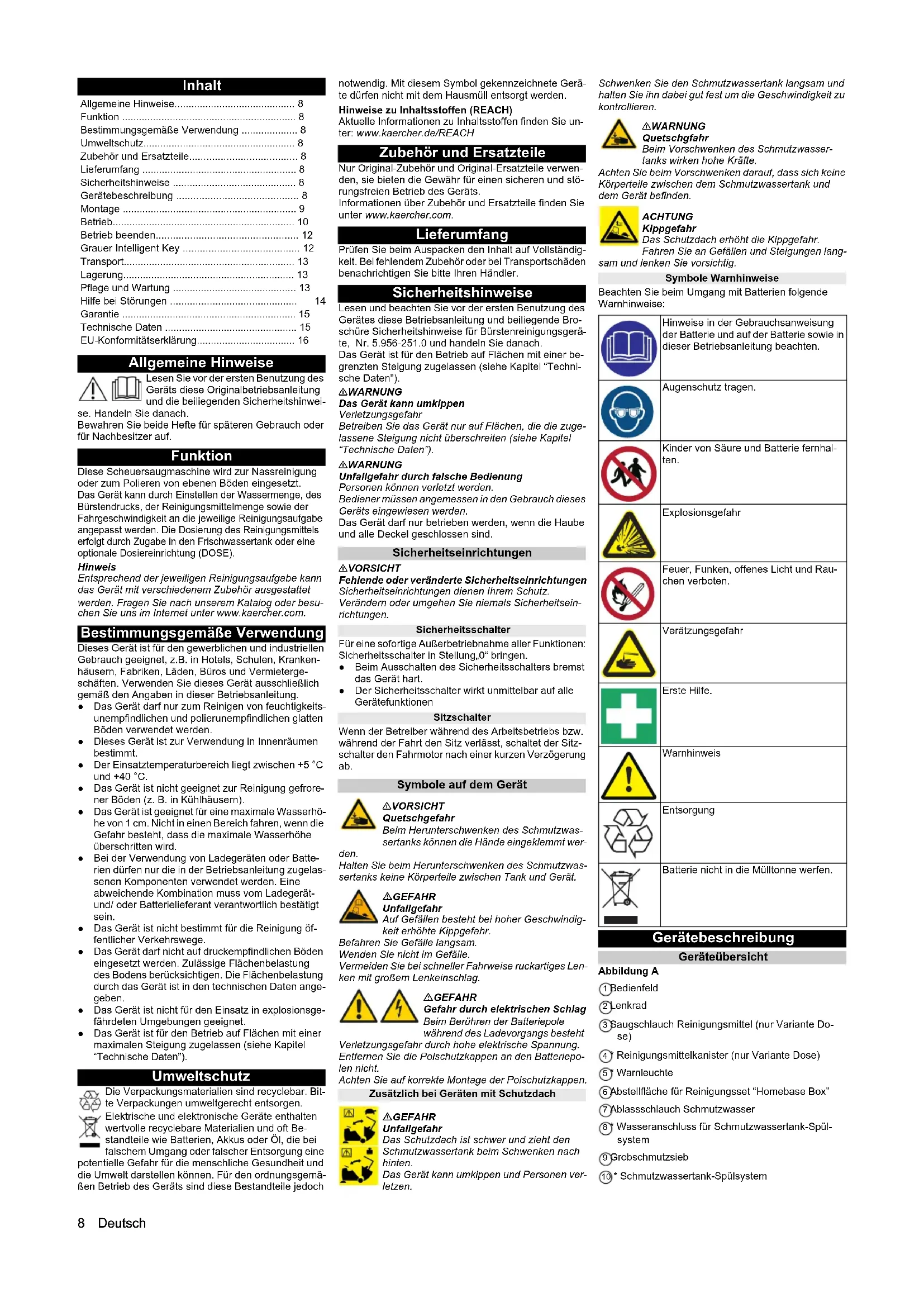 - AO AP8 Deutsch Inhalt Allgemeine Hinweise Lesen Sie vor der ersten Benutzung des Geräts diese Originalbetriebsanleitung und die beiliegenden Sicherheitshinwei- se. Handeln Sie danach. Bewahren Sie beide Hefte für späteren Gebrauch oder für Nachbesitzer auf. Funktion Diese Scheuersaugmaschine wird zur Nassreinigung oder zum Polieren von ebenen Böden eingesetzt. Das Gerät kann durch Einstellen der Wassermenge, des Bürstendrucks, der Reinigungsmittelmenge sowie der Fahrgeschwindigkeit an die jeweilige Reinigungsaufgabe angepasst werden. Die Dosierung des Reinigungsmittels erfolgt durch Zugabe in den Frischwassertank oder eine optionale Dosiereinrichtung (DOSE). Hinweis Entsprechend der jeweiligen Reinigungsaufgabe kann das Gerät mit verschiedenem Zubehör ausgestattet werden. Fragen Sie nach unserem Katalog oder besu- chen Sie uns im Internet unter www.kaercher.com. Bestimmungsgemäße Verwendung Dieses Gerät ist für den gewerblichen und industriellen Gebrauch geeignet, z.B. in Hotels, Schulen, Kranken- häusern, Fabriken, Läden, Büros und Vermieterge- schäften. Verwenden Sie dieses Gerät ausschließlich gemäß den Angaben in dieser Betriebsanleitung. ● Das Gerät darf nur zum Reinigen von feuchtigkeits- unempfindlichen und polierunempfindlichen glatten Böden verwendet werden. ● Dieses Gerät ist zur Verwendung in Innenräumen bestimmt. ● Der Einsatztemperaturbereich liegt zwischen +5 °C und +40 °C. ● Das Gerät ist nicht geeignet zur Reinigung gefrore- ner Böden (z. B. in Kühlhäusern). ● Das Gerät ist geeignet für eine maximale Wasserhö- he von 1 cm. Nicht in einen Bereich fahren, wenn die Gefahr besteht, dass die maximale Wasserhöhe überschritten wird. ● Bei der Verwendung von Ladegeräten oder Batte- rien dürfen nur die in der Betriebsanleitung zugelas- senen Komponenten verwendet werden. Eine abweichende Kombination muss vom Ladegerät- und/ oder Batterielieferant verantwortlich bestätigt sein. ● Das Gerät ist nicht bestimmt für die Reinigung öf- fentlicher Verkehrswege. ● Das Gerät darf nicht auf druckempfindlichen Böden eingesetzt werden. Zulässige Flächenbelastung des Bodens berücksichtigen. Die Flächenbelastung durch das Gerät ist in den technischen Daten ange- geben. ● Das Gerät ist nicht für den Einsatz in explosionsge- fährdeten Umgebungen geeignet. ● Das Gerät ist für den Betrieb auf Flächen mit einer maximalen Steigung zugelassen (siehe Kapitel “Technische Daten”). Umweltschutz Die Verpackungsmaterialien sind recyclebar. Bit- te Verpackungen umweltgerecht entsorgen. Elektrische und elektronische Geräte enthalten wertvolle recyclebare Materialien und oft Be- standteile wie Batterien, Akkus oder Öl, die bei falschem Umgang oder falscher Entsorgung eine potentielle Gefahr für die menschliche Gesundheit und die Umwelt darstellen können. Für den ordnungsgemä- ßen Betrieb des Geräts sind diese Bestandteile jedoch notwendig. Mit diesem Symbol gekennzeichnete Gerä- te dürfen nicht mit dem Hausmüll entsorgt werden. Hinweise zu Inhaltsstoffen (REACH) Aktuelle Informationen zu Inhaltsstoffen finden Sie un- ter: www.kaercher.de/REACH Zubehör und Ersatzteile Nur Original-Zubehör und Original-Ersatzteile verwen- den, sie bieten die Gewähr für einen sicheren und stö- rungsfreien Betrieb des Geräts. Informationen über Zubehör und Ersatzteile finden Sie unter www.kaercher.com. Lieferumfang Prüfen Sie beim Auspacken den Inhalt auf Vollständig- keit. Bei fehlendem Zubehör oder bei Transportschäden benachrichtigen Sie bitte Ihren Händler. Sicherheitshinweise Lesen und beachten Sie vor der ersten Benutzung des Gerätes diese Betriebsanleitung und beiliegende Bro- schüre Sicherheitshinweise für Bürstenreinigungsgerä- te, Nr. 5.956-251.0 und handeln Sie danach. Das Gerät ist für den Betrieb auf Flächen mit einer be- grenzten Steigung zugelassen (siehe Kapitel “Techni- sche Daten”). 몇 WARNUNG Das Gerät kann umkippen Verletzungsgefahr Betreiben Sie das Gerät nur auf Flächen, die die zuge- lassene Steigung nicht überschreiten (siehe Kapitel “Technische Daten”). 몇 WARNUNG Unfallgefahr durch falsche Bedienung Personen können verletzt werden. Bediener müssen angemessen in den Gebrauch dieses Geräts eingewiesen werden. Das Gerät darf nur betrieben werden, wenn die Haube und alle Deckel geschlossen sind. Sicherheitseinrichtungen 몇 VORSICHT Fehlende oder veränderte Sicherheitseinrichtungen Sicherheitseinrichtungen dienen Ihrem Schutz. Verändern oder umgehen Sie niemals Sicherheitsein- richtungen. Sicherheitsschalter Für eine sofortige Außerbetriebnahme aller Funktionen: Sicherheitsschalter in Stellung„0“ bringen. ● Beim Ausschalten des Sicherheitsschalters bremst das Gerät hart. ● Der Sicherheitsschalter wirkt unmittelbar auf alle Gerätefunktionen Sitzschalter Wenn der Betreiber während des Arbeitsbetriebs bzw. während der Fahrt den Sitz verlässt, schaltet der Sitz- schalter den Fahrmotor nach einer kurzen Verzögerung ab. Symbole auf dem Gerät 몇VORSICHT Quetschgefahr Beim Herunterschwenken des Schmutzwas- sertanks können die Hände eingeklemmt wer- den. Halten Sie beim Herunterschwenken des Schmutzwas- sertanks keine Körperteile zwischen Tank und Gerät. GEFAHR Unfallgefahr Auf Gefällen besteht bei hoher Geschwindig- keit erhöhte Kippgefahr. Befahren Sie Gefälle langsam. Wenden Sie nicht im Gefälle. Vermeiden Sie bei schneller Fahrweise ruckartiges Len- ken mit großem Lenkeinschlag. GEFAHR Gefahr durch elektrischen Schlag Beim Berühren der Batteriepole während des Ladevorgangs besteht Verletzungsgefahr durch hohe elektrische Spannung. Entfernen Sie die Polschutzkappen an den Batteriepo- len nicht. Achten Sie auf korrekte Montage der Polschutzkappen. Zusätzlich bei Geräten mit Schutzdach GEFAHR Unfallgefahr Das Schutzdach ist schwer und zieht den Schmutzwassertank beim Schwenken nach hinten. Das Gerät kann umkippen und Personen ver- letzen. Schwenken Sie de