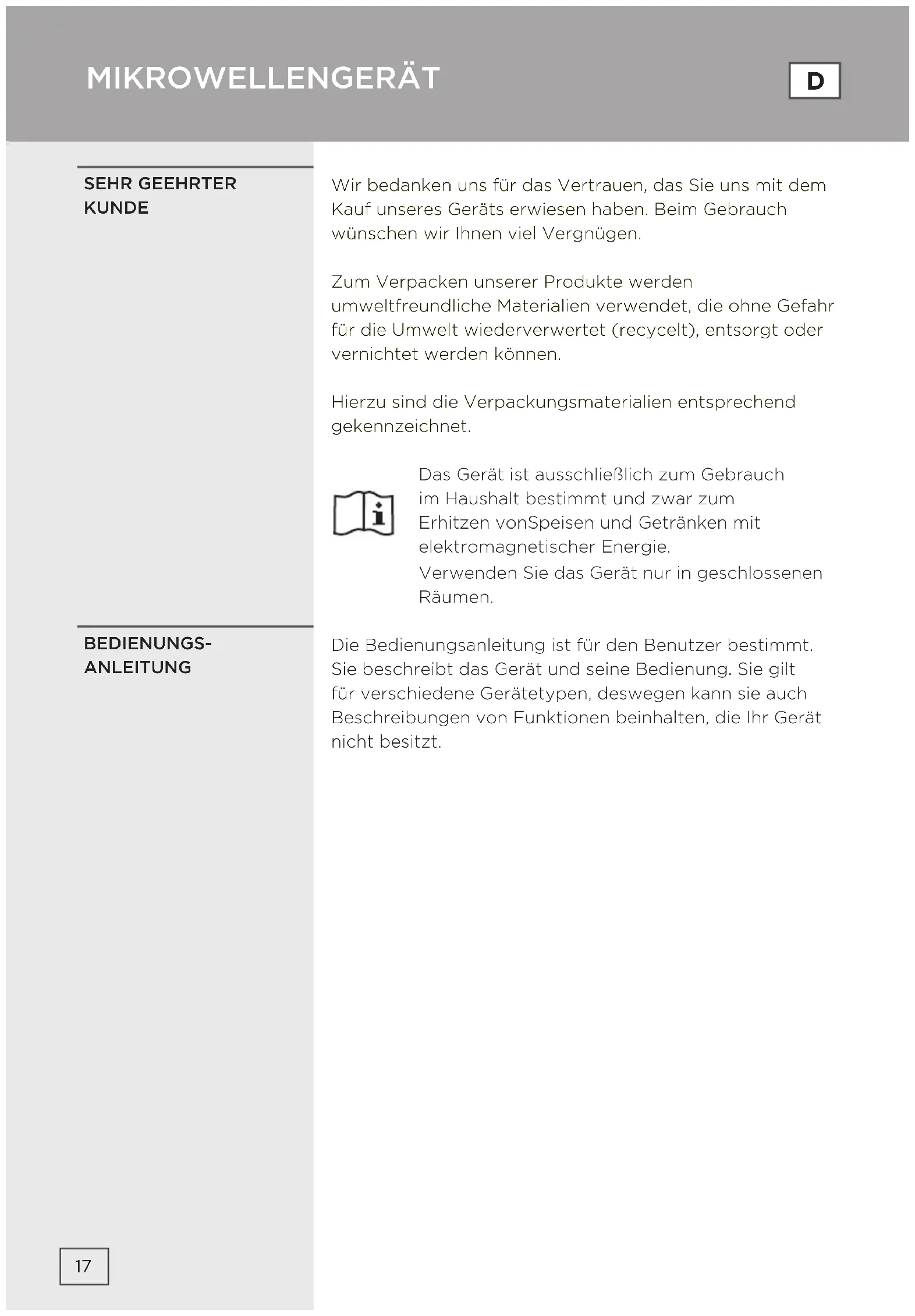 GUARANTEE & SERVICEWir bedanken uns für das Vertrauen, das Sie uns mit dem Kauf unseres Geräts erwiesen haben. Beim Gebrauch wünschen wir Ihnen viel Vergnügen. Zum Verpacken unserer Produkte werden umweltfreundliche Materialien verwendet, die ohne Gefahr für die Umwelt wiederverwertet (recycelt), entsorgt oder vernichtet werden können. Hierzu sind die Verpackungsmaterialien entsprechend gekennzeichnet. Das Gerät ist ausschließlich zum Gebrauch im Haushalt bestimmt und zwar zum Erhitzen vonSpeisen und Getränken mit elektromagnetischer Energie. Verwenden Sie das Gerät nur in geschlossenen Räumen. Die Bedienungsanleitung ist für den Benutzer bestimmt. Sie beschreibt das Gerät und seine Bedienung. Sie gilt für verschiedene Gerätetypen, deswegen kann sie auch Beschreibungen von Funktionen beinhalten, die Ihr Gerät nicht besitzt. SEHR GEEHRTER KUNDE