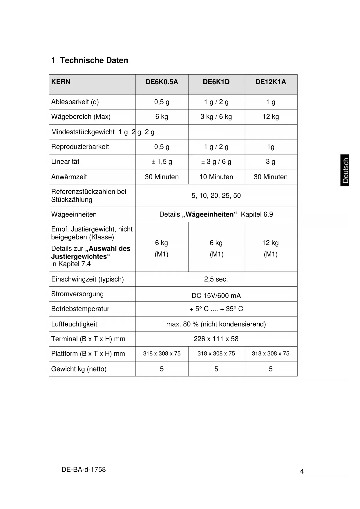 1 Technische Daten KERN DE6K0.5A DE6K1D DE12K1A Ablesbarkeit (d) 0,5 g 1 g / 2 g 1 g Wägebereich (Max) 6 kg 3 kg / 6 kg 12 kg Mindeststückgewicht 1 g 2 g 2 g Reproduzierbarkeit 0,5 g 1 g / 2 g 1g Linearität ± 1,5 g ± 3 g / 6 g 3 g Anwärmzeit 30 Minuten 10 Minuten 30 Minuten Referenzstückzahlen bei Stückzählung 5, 10, 20, 25, 50 Wägeeinheiten Details „Wägeeinheiten“ Kapitel 6.9 Empf. Justiergewicht, nicht beigegeben (Klasse) Details zur „Auswahl des Justiergewichtes“ in Kapitel 7.4 6 kg (M1) 6 kg (M1) 12 kg (M1) Einschwingzeit (typisch) 2,5 sec. Stromversorgung DC 15V/600 mA Betriebstemperatur + 5° C .... + 35° C Luftfeuchtigkeit max. 80 % (nicht kondensierend) Terminal (B x T x H) mm 226 x 111 x 58 Plattform (B x T x H) mm 318 x 308 x 75 318 x 308 x 75 318 x 308 x 75 Gewicht kg (netto) 5 5 55 DE-BA-d-1758 KERN DE15K0.2D DE15K2D DE24K2A Ablesbarkeit (d) 0,2 g / 0,5 g 2 g / 5 g 2 g Wägebereich (Max) 6 kg / 15 kg 6 kg / 15 kg 24 kg Mindeststückgewicht 400 mg 4 g 4 g Reproduzierbarkeit 0,2 g / 0,5 g 2 g / 5g 2 g Linearität ± 0,8 g / 2 g ± 6 g / 15 g ± 6 g Anwärmzeit 2 Stunden 10 Minuten 30 Minuten Referenzstückzahlen bei Stückzählung 5, 10, 20, 25, 50 Wägeeinheiten Details „Wägeeinheiten“ Kapitel 6.9 Empf. Justiergewicht, nicht beigegeben (Klasse) Details zur „Auswahl des Justiergewichtes“ in Kapitel 7.4 15 kg (F2) 15 kg (M1) 20 kg (M1) Einschwingzeit (typisch) 2,5 sec. Stromversorgung DC 15V/600 mA Betriebstemperatur + 5° C .... + 35° C Luftfeuchtigkeit max. 80 % (nicht kondensierend) Terminal (B x T x H) mm 226 x 111 x 58 Plattform (B x T x H) mm 318 x 308 x 85 318 x 308 x 75 Gewicht kg (netto) 7,5 5DE-BA-d-1758