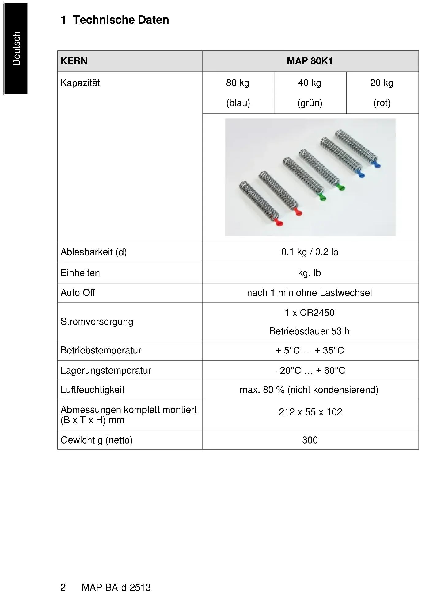 Einheiten kg, lb Auto Off nach 1 min ohne Lastwechsel Stromversorgung 1 x CR2450 Betriebsdauer 53 h Betriebstemperatur + 5°C … + 35°C Lagerungstemperatur - 20°C … + 60°C Luftfeuchtigkeit max. 80 % (nicht kondensierend) Abmessungen komplett montiert (B x T x H) mm 212 x 55 x 102 Gewicht g (netto) 300MAP-BA-d-2513 3 Deutsch