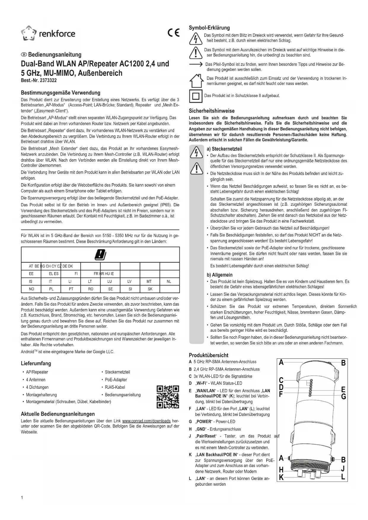 Bedienungsanleitung Dual-Band WLAN AP/Repeater AC1200 2,4 und 5 GHz, MU-MIMO, Außenbereich Best.-Nr. 2373322 Bestimmungsgemäße Verwendung Das Produkt dient zur Erweiterung oder Erstellung eines Netzwerks. Es verfügt über die 3 Betriebsarten„AP-Modus“ (Access-Point;LAN-Brücke;Standard),Repeater und„MeshEx-tender“ („Easymesh Client“).DieBetriebsart„AP-Modus“stellteinenseparatenWLAN-ZugangspunktzurVerfügung.DasProduktwirddabeianIhrenvorhandenenRouterbzw.NetzwerkperKabelangebunden.DieBetriebsart„Repeater“dientdazu,IhrvorhandenesWLAN-Netzwerkzuverstärkenundden Abdeckungsbereich zu vergrößern. Die Verbindung zu Ihrem WLAN-Router erfolgt in der Betriebsart drahtlos über WLAN.Die Betriebsart „Mesh Extender“ dient dazu, das Produkt an Ihr vorhandenes Easymesh-Netzwerk anzubinden. Die Verbindung zu Ihrem Mesh-Controller (z.B. WLAN-Router) erfolgt drahtlos über WLAN. Nach dem Verbinden werden alle Einstellung direkt von Ihrem Mesh-Controller übernommen.DieVerbindungIhrerGerätemitdemProduktkanninallenBetriebsartenperWLANoderLANerfolgen.DieKongurationerfolgtüberdieWeboberächedesProdukts.SiekannsowohlvoneinemComputeralsaucheinemSmartphoneoderTableterfolgen.DieSpannungsversorgungerfolgtüberdasbeiliegendeSteckernetzteilunddenPoE-Adapter.Das Produkt selbst ist für den Betrieb im Innen- und Außenbereich geeignet (IP65). Die VerwendungdesSteckernetzteilsunddesPoE-AdaptersistnichtimFreien,sondernnuringeschlossenenRäumenerlaubt.DerKontaktmitFeuchtigkeit,z.B.imBadezimmero.ä.,istunbedingt zu vermeiden.Für WLAN ist im 5 GHz-Band der Bereich von 5150 - 5350 MHz nur für die Nutzung in ge-schlossenen Räumen bestimmt. Diese Beschränkung/Anforderung gilt in den Ländern: AT BE BG CH CY CZ DE DKEE EL ES FI FR HR HU IE IS IT LI LT LU LV MT NL NO PL PT RO SE SI SK Aus Sicherheits- und Zulassungsgründen dürfen Sie das Produkt nicht umbauen und/oder ver-ändern. Falls Sie das Produkt für andere Zwecke verwenden, als zuvor beschrieben, kann das Produkt beschädigt werden. Außerdem kann eine unsachgemäße Verwendung Gefahren wie z.B.Kurzschluss,Brand,Stromschlag,etc.hervorrufen.LesenSiesichdieBedienungsanlei-tung genau durch und bewahren Sie diese auf. Reichen Sie das Produkt nur zusammen mit der Bedienungsanleitung an dritte Personen weiter.DasProduktentsprichtdengesetzlichen,nationalenundeuropäischenAnforderungen.AlleenthaltenenFirmennamenundProduktbezeichnungensindWarenzeichenderjeweiligenIn-haber. Alle Rechte vorbehalten.Android ist eine eingetragene Marke der Google LLC. Lieferumfang