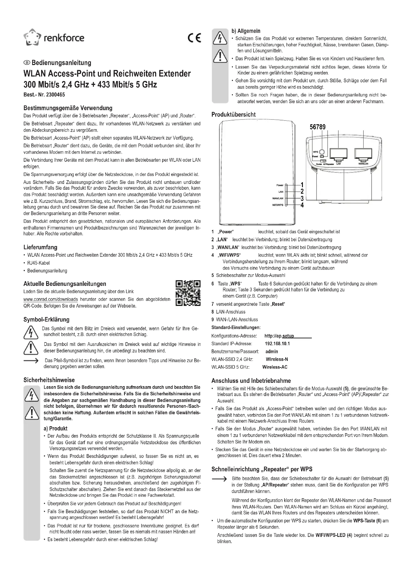 - WLAN Access-Point und Reichweiten Extender 300 Mbit/s 2,4 GHz + 433 Mbit/s 5 GHz• RJ45-Kabel• Bedienungsanleitung Aktuelle Bedienungsanleitungen Laden Sie die aktuelle Bedienungsanleitung über den Linkwww.conrad.com/downloads herunter oder scannen Sie den abgebildeten QR-Code. Befolgen Sie die Anweisungen auf der Webseite. Symbol-Erklärung Das Symbol mit dem Blitz im Dreieck wird verwendet, wenn Gefahr für Ihre Ge-sundheit besteht, z.B. durch einen elektrischen Schlag. Das Symbol mit dem Ausrufezeichen im Dreieck weist auf wichtige Hinweise in dieser Bedienungsanleitung hin, die unbedingt zu beachten sind. DasPfeil-Symbolistzunden,wennIhnenbesondereTippsundHinweisezurBe-dienung gegeben werden sollen. Sicherheitshinweise Lesen Sie sich die Bedienungsanleitung aufmerksam durch und beachten Sie insbesondere die Sicherheitshinweise. Falls Sie die Sicherheitshinweise und die Angaben zur sachgemäßen Handhabung in dieser Bedienungsanleitung nicht befolgen, übernehmen wir für dadurch resultierende Personen-/Sach-schäden keine Haftung. Außerdem erlischt in solchen Fällen die Gewährleis-tung/Garantie. a) Produkt