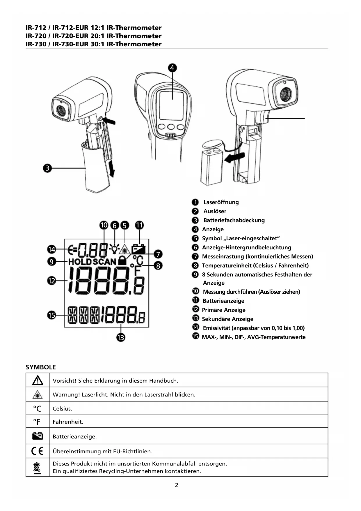 Vorsicht! Siehe Erklärung in diesem Handbuch.Warnung! Laserlicht. Nicht in den Laserstrahl blicken. Celsius. Fahrenheit.Batterieanzeige. Übereinstimmung mit EU-Richtlinien. Dieses Produkt nicht im unsortierten Kommunalabfall entsorgen. Ein qualifiziertes Recycling-Unternehmen kontaktieren. IR-712 / IR-712-EUR 12:1 IR-Thermometer IR-720 / IR-720-EUR 20:1 IR-Thermometer IR-730 / IR-730-EUR 30:1 IR-Thermometer