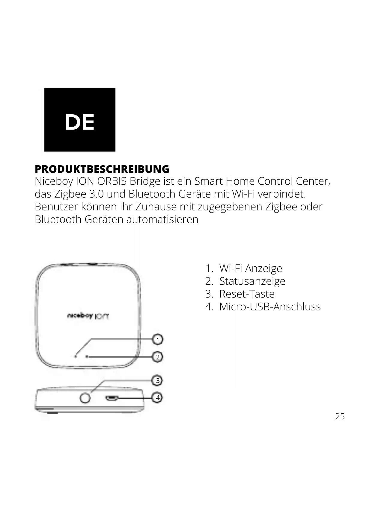 PRODUKTBESCHREIBUNG Niceboy ION ORBIS Bridge ist ein Smart Home Control Center, das Zigbee 3.0 und Bluetooth Geräte mit Wi-Fi verbindet. Benutzer können ihr Zuhause mit zugegebenen Zigbee oder Bluetooth Geräten automatisieren