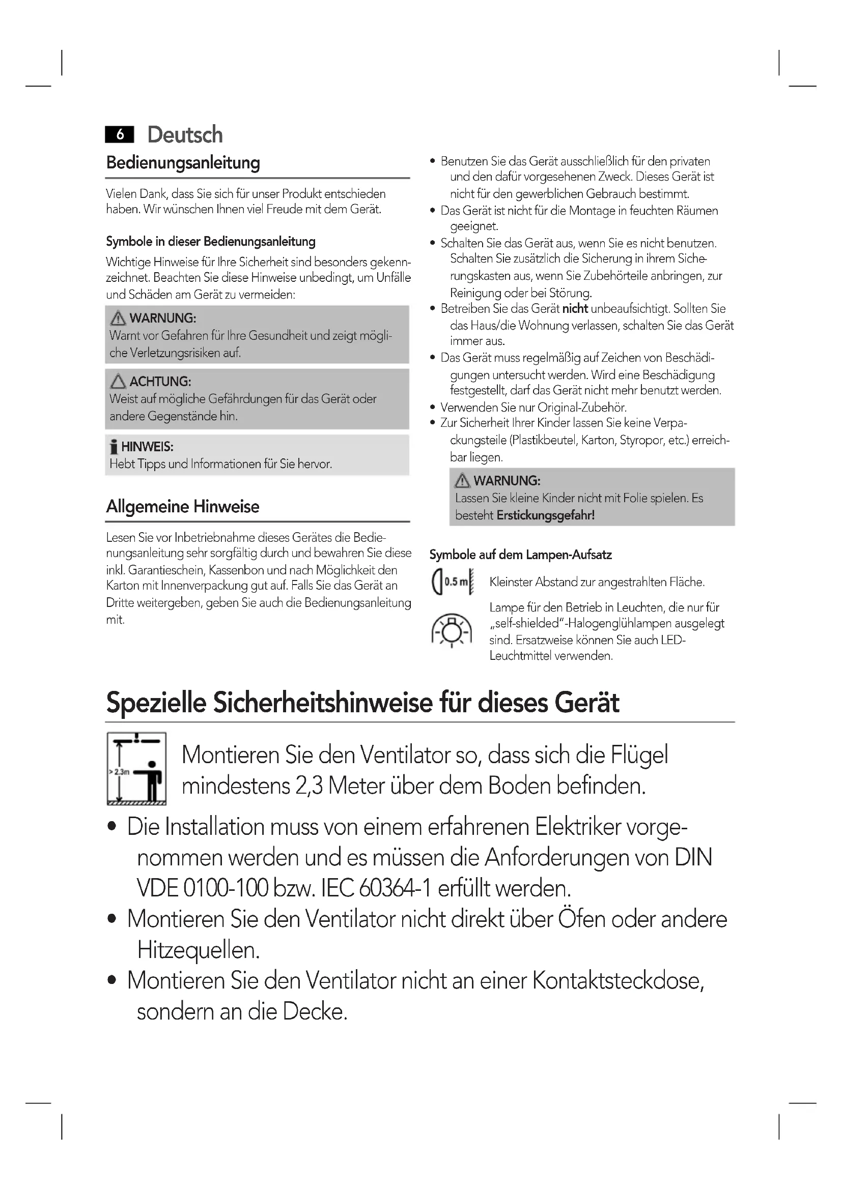 Bedienungsanleitung Vielen Dank, dass Sie sich für unser Produkt entschieden haben. Wir wünschen Ihnen viel Freude mit dem Gerät.Symbole in dieser BedienungsanleitungWichtige Hinweise für Ihre Sicherheit sind besonders gekenn zeichnet. Beachten Sie diese Hinweise unbedingt, um Unfälle und Schäden am Gerät zu vermeiden: WARNUNG: Warnt vor Gefahren für Ihre Gesundheit und zeigt mögli che Verletzungsrisiken auf. ACHTUNG: Weist auf mögliche Gefährdungen für das Gerät oder andere Gegenstände hin. HINWEIS: Hebt Tipps und Informationen für Sie hervor. Allgemeine Hinweise Lesen Sie vor Inbetriebnahme dieses Gerätes die Bedie-nungsanleitung sehr sorgfältig durch und bewahren Sie diese inkl. Garantieschein, Kassenbon und nach Möglichkeit den Karton mit Innenverpackung gut auf. Falls Sie das Gerät an Dritte weitergeben, geben Sie auch die Bedienungsanleitung mit. • Benutzen Sie das Gerät ausschließlich für den privaten und den dafür vorgesehenen Zweck. Dieses Gerät ist nicht für den gewerblichen Gebrauch bestimmt. • Das Gerät ist nicht für die Montage in feuchten Räumen geeignet.• Schalten Sie das Gerät aus, wenn Sie es nicht benutzen. Schalten Sie zusätzlich die Sicherung in ihrem Siche rungskasten aus, wenn Sie Zubehörteile anbringen, zur Reinigung oder bei Störung.• Betreiben Sie das Gerät nicht unbeaufsichtigt. Sollten Sie das Haus/die Wohnung verlassen, schalten Sie das Gerät immer aus. • Das Gerät muss regelmäßig auf Zeichen von Beschädi-gungen untersucht werden. Wird eine Beschädigung festgestellt, darf das Gerät nicht mehr benutzt werden.• Verwenden Sie nur Original-Zubehör.• Zur Sicherheit Ihrer Kinder lassen Sie keine Verpa-ckungsteile (Plastikbeutel, Karton, Styropor, etc.) erreich-bar liegen. WARNUNG: Lassen Sie kleine Kinder nicht mit Folie spielen. Es besteht Erstickungsgefahr!Symbole auf dem Lampen-AufsatzKleinster Abstand zur angestrahlten Fläche.Lampe für den Betrieb in Leuchten, die nur für „self-shielded“-Halogenglühlampen ausgelegt sind. Ersatzweise können Sie auch LED-Leuchtmittel verwenden. Spezielle Sicherheitshinweise für dieses Gerät Montieren Sie den Ventilator so, dass sich die Flügel mindestens 2,3 Meter über dem Boden befinden.