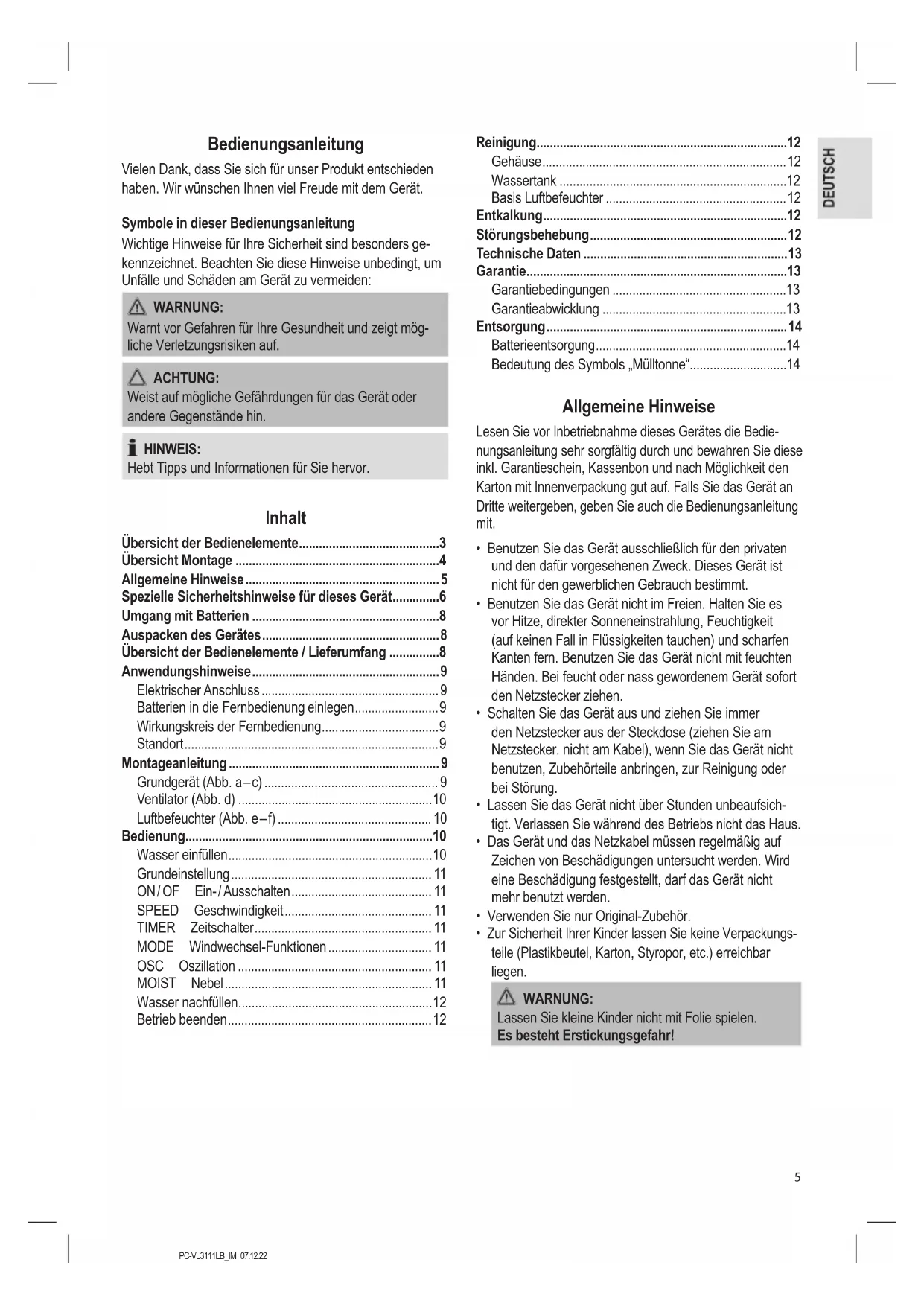 - Kinder dürfen nicht mit dem Gerät spielen.8 PC-VL3111LB_IM 07.12.22