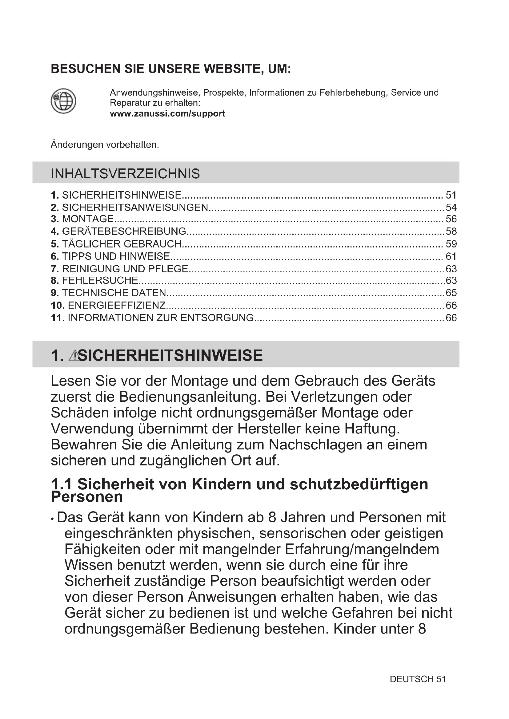 Ihre Pflichten als Endnutzer Dieses Elektro- bzw. Elektronikgerät ist mit einer durchgestrichenen Abfalltonne auf Rädern gekennzeichnet. Das Gerät darf deshalb nur getrennt vom unsortierten Siedlungsabfall gesammelt und zurückgenommen werden, es darf also nicht in den Hausmüll gegeben werden. Das Gerät kann z. B. bei einer kommunalen Sammelstelle oder ggf. bei einem Vertreiber (siehe zu deren Rücknahmepflichten unten) abgegeben werden. Das gilt auch für alle Bauteile, Unterbaugruppen und Verbrauchsmaterialien des zu entsorgenden Altgeräts. Bevor das Altgerät entsorgt werden darf, müssen alle Altbatterien und Altakkumulatoren vom Altgerät getrennt werden, die nicht vom Altgerät umschlossen sind. Das gleiche gilt für Lampen, die 66 DEUTSCHzerstörungsfrei aus dem Altgerät entnommen werden können. Der Endnutzer ist zudem selbst dafür verantwortlich, personenbezogene Daten auf dem Altgerät zu löschen. Hinweise zum Recycling Helfen Sie mit, alle Materialien zu recyceln, die mit diesem Symbol gekennzeichnet sind. Entsorgen Sie solche Materialien, insbesondere Verpackungen, nicht im Hausmüll sondern über die bereitgestellten Recyclingbehälter oder die entsprechenden örtlichen Sammelsysteme. Recyceln Sie zum Umwelt- und Gesundheitsschutz auch elektrische und elektronische Geräte. Rücknahmepflichten der Vertreiber in Deutschland Wer auf mindestens 400 m² Verkaufsfläche Elektro- und Elektronikgeräte vertreibt oder sonst geschäftlich an Endnutzer abgibt, ist verpflichtet, bei Abgabe eines neuen Geräts ein Altgerät des Endnutzers der gleichen Geräteart, das im Wesentlichen die gleichen Funktionen wie das neue Gerät erfüllt, am Ort der Abgabe oder in unmittelbarer Nähe hierzu unentgeltlich zurückzunehmen. Das gilt auch für Vertreiber von Lebensmitteln mit einer Gesamtverkaufsfläche von mindestens 800 m², die mehrmals im Kalenderjahr oder dauerhaft Elektro- und Elektronikgeräte anbieten und auf dem Markt bereitstellen. Solche Vertreiber müssen zudem auf Verlangen des Endnutzers Altgeräte, die in keiner äußeren Abmessung größer als 25 cm sind (kleine Elektrogeräte), im Einzelhandelsgeschäft oder in unmittelbarer Nähe hierzu unentgeltlich zurückzunehmen; die Rücknahme darf in diesem Fall nicht an den Kauf eines Elektro- oder Elektronikgerätes geknüpft, kann aber auf drei Altgeräte pro Geräteart beschränkt werden. Ort der Abgabe ist auch der private Haushalt, wenn das neue Elektro- oder Elektronikgerät dorthin geliefert wird; in diesem Fall ist die Abholung des Altgerätes für den Endnutzer kostenlos. Die vorstehenden Pflichten gelten auch für den Vertrieb unter Verwendung von Fernkommunikationsmitteln, wenn die Vertreiber Lager- und Versandflächen für Elektro- und Elektronikgeräte bzw. Gesamtlager- und -versandflächen für Lebensmittel vorhalten, die den oben genannten Verkaufsflächen entsprechen. Die unentgeltliche Abholung von Elektro- und Elektronikgeräten ist dann aber auf Wärmeüberträger (z. B. Kühlschrank), Bildschirme, Monitore und Geräte, die Bildschirme mit einer Oberfläche von mehr als 100 cm² enthalten, und Geräte beschränkt, bei denen mindestens eine der äußeren Abmessungen mehr als 50 cm beträgt. Für alle übrigen Elektro- und Elektronikgeräte muss der Vertreiber geeignete Rückgabemöglichkeiten in zumutbarer Entfernung zum jeweiligen Endnutzer gewährleisten; das gilt auch für kleine Elektrogeräte (s.o.), die der Endnutzer zurückgeben will, ohne ein neues Gerät zu kaufen. Rücknahmepflichten von Vertreibern und andere Möglichkeiten der Entsorgung von Elektro- und Elektronikgeräten in der Region Wallonien Vertreiber, die Elektro- und Elektronikgeräte verkaufen, sind verpflichtet, bei der Lieferung von Neugeräten Altgeräte desselben Typs, die im Wesentlichen die gleichen Funktionen wie die Neugeräte erfüllen, kostenlos vom Endverbraucher zurückzunehmen. Dies gilt auch bei der Lieferung von neuen Elektro- und Elektronikgeräten oder beim Fernabsatz. Darüber hinaus ist jeder, der Elektro- und Elektronikgeräte auf einer Verkaufsfläche von mindestens 400 m² verkauft, verpflichtet, Altgeräte, die in keiner äußeren Abmessung größer als 25 cm sind (Elektrokleingeräte), im Ladengeschäft oder in unmittelbarer Nähe kostenlos zurückzunehmen; die Rücknahme darf in diesem Fall nicht vom Kauf eines Elektro- oder Elektronikgerätes abhängig gemacht werden. DEUTSCH 67Die Rücknahme von Elektro- und Elektronikgeräten kann auch auf Containerplätzen oder zugelassenen Recyclinghöfen erfolgen. Für weitere Informationen wenden Sie sich bitte an Ihre Gemeindeverwaltung. 68 DEUTSCHΕΠΙΣΚΕΦΘΕΙΤΕ ΤΟΝ ΙΣΤΟΤΟΠΟ ΜΑΣ ΓΙΑ ΝΑ: Βρείτε υποδείξεις χρήσης, φυλλάδια, συμβουλές για την επίλυση προβλημάτων,πληροφορίες σέρβις και επισκευής:www.zanussi.com/supportΥπόκειται αε αλλαγές χωρίς προειδποίηση. ΠΕΡΙΕΧΟΜΕΝΑ