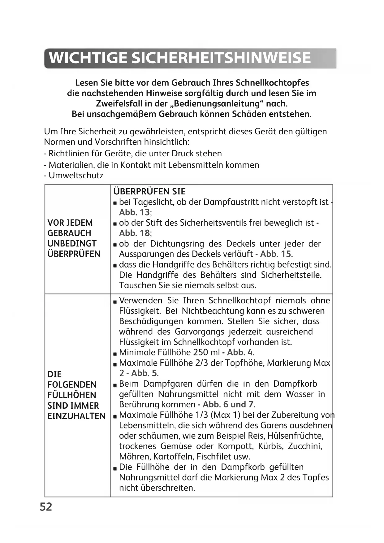 2 PERSONEN 400 ml/2 Gläser 150 g/1 Glas 7 bis 8 min4 PERSONEN 500 ml/2,5 Gläser 250 g/2 Gläser 6 PERSONEN 700 ml/3,5 Gläser 375 g/3 Gläser FRISCH GEFROREN Ente (1,8 kg) 45 bis 47 min 50 bis 55 min Filet Mignon vom Kalb: 0,7 kg 17 bis 21 min 33 bis 38 min Filet Mignon vom Schwein: 2 Stücke zu je 350 g 13 bis 15 min 26 bis 29 min Hühnchen (1,35 kg) 23 bis 25 min 1 h bis 1 h 10 min Kalbsbraten (0,8 kg, 5–7 cm Durchmesser) 17 bis 19 min 37 bis 40 min Kalbsrouladen: 4 10 bis 12 min x Kaninchen (1,5 kg in Stücken) 8 bis 9 min 20 bis 23 min Lachssteak: 4 (0,8 kg) 5 bis 6 min 7 bis 8 min Lammkeule: 2 (0,95 kg) 40 bis 45 min 1 h 5 min bis 1 h 15 min Rinderbraten (1 kg, 8–11 cm Durchmesser) 30 bis 35 min 45 bis 50 min Schweinebraten (0,8 kg, 8–10 cm Durchmesser) 30 bis 35 min 1 h 5 min bis 1 h 15 min Seefisch-Filet (1 kg) in 75-Gramm-Stücken 5 bis 6 min 7 bis 8 min Stubenküken: 2 (1,3 kg) 23 bis 25 min 40 bis 45 min Thunfischsteak: 4 (0,7 kg) 5 bis 6 min 7 bis 9 min Wachtel: 4 9 bis 10 min 18 bis 20 min Hinweis: Bei Modellen von 5 Litern und weniger sicherstellen, dass Braten und Geflügel nicht höher als die Markierung im Inneren des Topfes sind. Braten und Geflügel dürfen max. 8 cm dick sein.Neem voordat u uw snelkookpan gebruikt, de tijd om alle instructies te lezen en raadpleeg steeds de "Gebruiksaanwijzing". Ondeskundig gebruik kan leiden tot schade. Met het oog op uw veiligheid, voldoet dit apparaat aan de toepasselijke normen en regelgevingen: - Richtlijn Drukapparatuur - Materialen die met levensmiddelen in contact komen - Omgeving BELANGRIJKE VOORZORGSMAATREGELEN