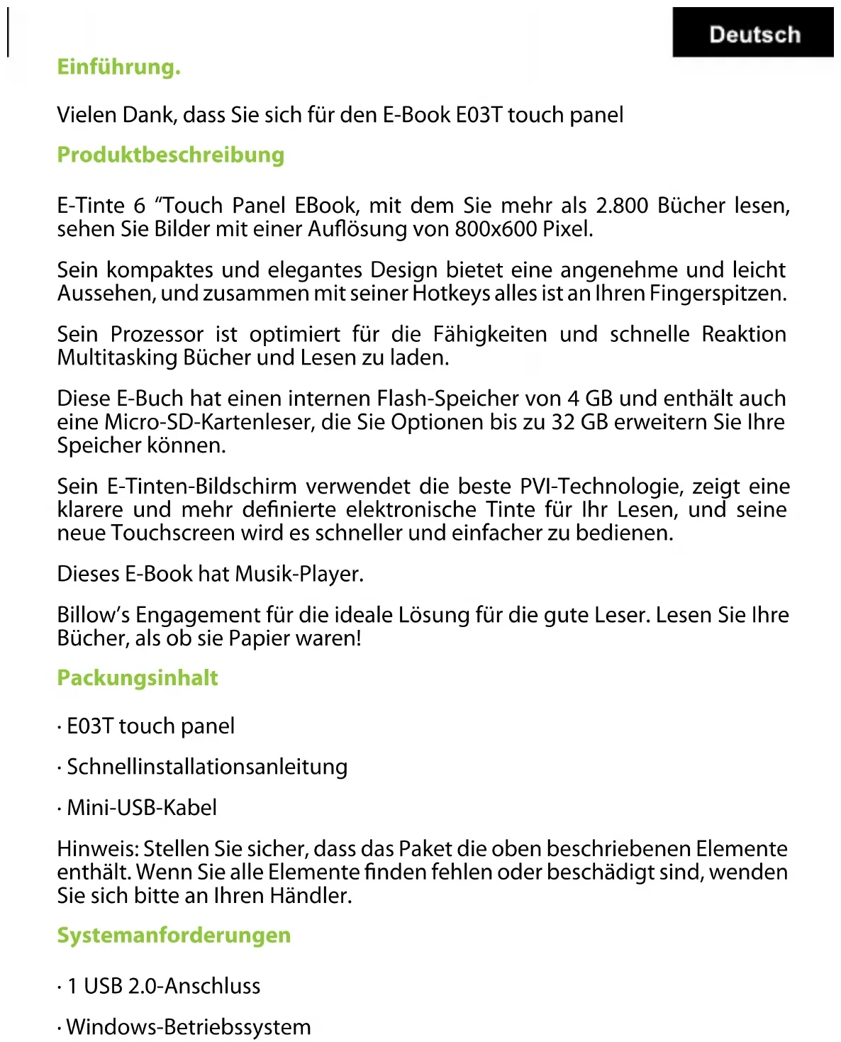 Z hlavního menu zvolte User Manual a stiskněte tlačítko OK. Uživatelská příručka v elektronické knihy se otevře. Technická podpora. Pro více informací o tomto produktu naleznete v sekci podpory na našich webových stránkách www.billowtechnology.com.Einführung. Vielen Dank, dass Sie sich für den E-Book E03T touch panel Produktbeschreibung E-Tinte 6 “Touch Panel EBook, mit dem Sie mehr als 2.800 Bücher lesen, sehen Sie Bilder mit einer Auösung von 800x600 Pixel. Sein kompaktes und elegantes Design bietet eine angenehme und leicht Aussehen, und zusammen mit seiner Hotkeys alles ist an Ihren Fingerspitzen. Sein Prozessor ist optimiert für die Fähigkeiten und schnelle Reaktion Multitasking Bücher und Lesen zu laden. Diese E-Buch hat einen internen Flash-Speicher von 4 GB und enthält auch eine Micro-SD-Kartenleser, die Sie Optionen bis zu 32 GB erweitern Sie Ihre Speicher können. Sein E-Tinten-Bildschirm verwendet die beste PVI-Technologie, zeigt eine klarere und mehr denierte elektronische Tinte für Ihr Lesen, und seine neue Touchscreen wird es schneller und einfacher zu bedienen. Dieses E-Book hat Musik-Player. Billow’s Engagement für die ideale Lösung für die gute Leser. Lesen Sie Ihre Bücher, als ob sie Papier waren! Packungsinhalt