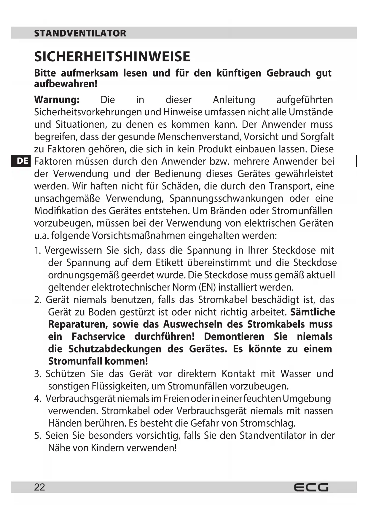 Verpackungspapier und Wellpappe – zum Altpapier geben. Verpackungsfolie, PET-Beutel, Plastikteile – in den Sammelcontainer für Plastik. ENTSORGUNG DES PRODUKTES NACH ABLAUF DER LEBENSDAUER Die Entsorgung der verwendeten elektrischen und elektronischen Geräte (gültig in den Mitgliedsländern der EU und weiteren europäischen Ländern mit dem eingeführten System der Abfalltrennung) Das abgebildete Symbol auf dem Produkt oder auf der Verpackung bedeutet, dass das Produkt nicht als Hausmüll abgegeben werden soll. Das Produkt geben Sie an einem Ort ab, der für das Recycling von elektrischen und elektronischen Geräten bestimmt ist. Die richtige Entsorgung des Produktes schützt Sie vor negativen Einüssen auf die menschliche Gesundheit und des Lebensraumes. Das Recycling des Materials trägt zum Schutz der Naturressourcen bei. Mehr Informationen über das Recycling dieses Produktes gibt Ihnen die Kommunalbehörde, Organisationen für die Bearbeitung von Hausabfall oder die Verkaufsstelle, in der Sie das Produkt erworben haben. Dieses Produkt erfüllt die Anforderung der EU-Richtlinien über elektromagnetische Kompatibilität und elektrische Sicherheit. Bedienungsanleitung s. www.ecg-electro.eu. Eine Änderung des Textes und der technischen Parameter vorbehalten. 08/05GB STAND FAN