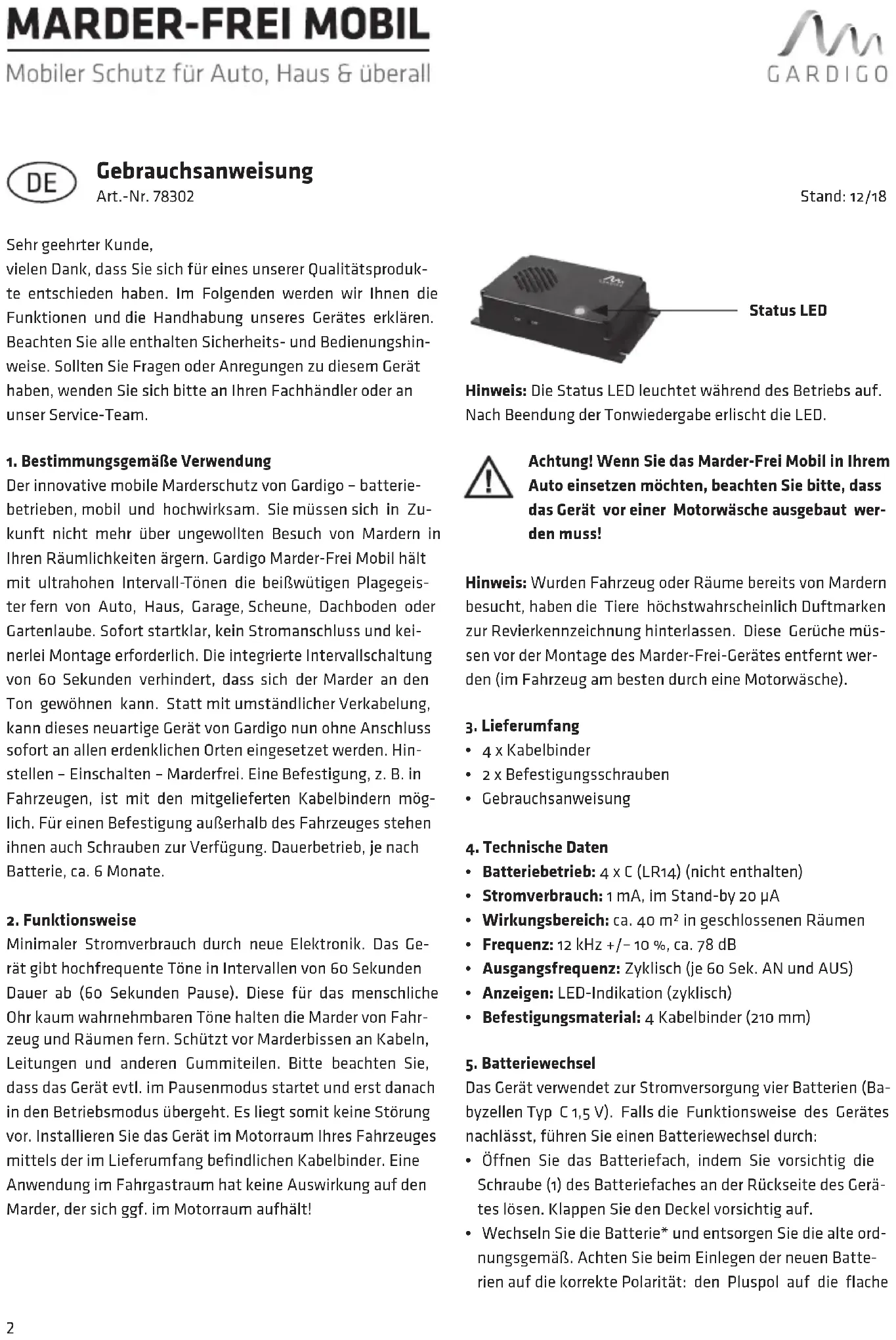 Gebrauchsanweisung 2 Instruction manual 5 Mode d’emploi 7 Manual de instrucciones 9 Istruzioni per l’uso 12 Návod k používání 14 Gebruikshandleiding 17 Instrucţiuni 19 Marder-Frei Mobil Art.-Nr. 783022 Gebrauchsanweisung Art.-Nr. 78302 Sehr geehrter Kunde, vielen Dank, dass Sie sich für eines unserer Qualitätsproduk- te entschieden haben. Im Folgenden werden wir Ihnen die Funktionen und die Handhabung unseres Gerätes erklären. Beachten Sie alle enthalten Sicherheits- und Bedienungshin- weise. Sollten Sie Fragen oder Anregungen zu diesem Gerät haben, wenden Sie sich bitte an Ihren Fachhändler oder an unser Service-Team.