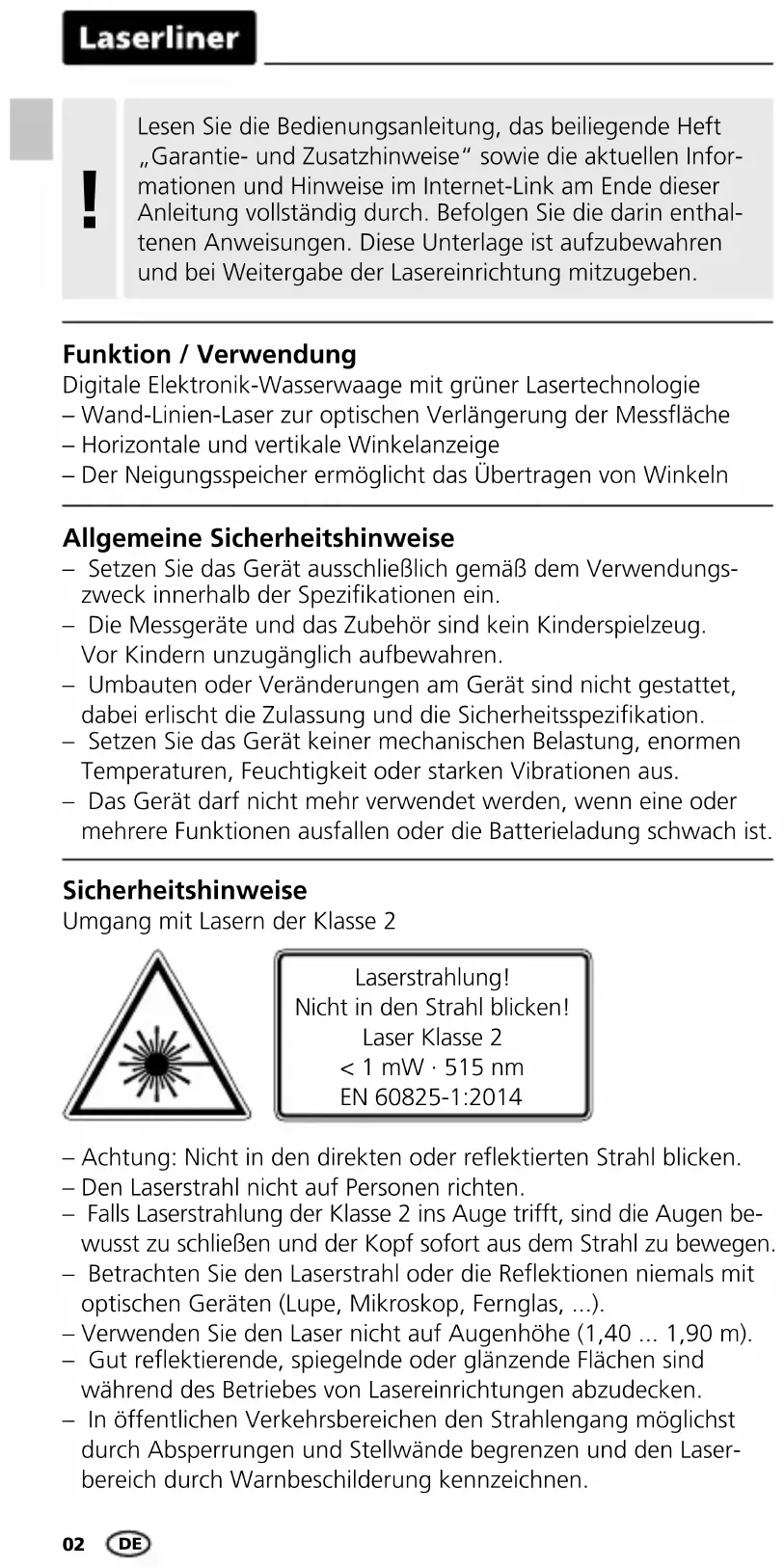 – Achtung: Nicht in den direkten oder reektierten Strahl blicken. – Den Laserstrahl nicht auf Personen richten. – Falls Laserstrahlung der Klasse 2 ins Auge trifft, sind die Augen be- wusst zu schließen und der Kopf sofort aus dem Strahl zu bewegen. – Betrachten Sie den Laserstrahl oder die Reektionen niemals mit optischen Geräten (Lupe, Mikroskop, Fernglas, ...). – Verwenden Sie den Laser nicht auf Augenhöhe (1,40 ... 1,90 m). – Gut reektierende, spiegelnde oder glänzende Flächen sind während des Betriebes von Lasereinrichtungen abzudecken. – In öffentlichen Verkehrsbereichen den Strahlengang möglichst durch Absperrungen und Stellwände begrenzen und den Laser- bereich durch Warnbeschilderung kennzeichnen. Laserstrahlung! Nicht in den Strahl blicken! Laser Klasse 2 < 1 mW · 515 nm EN 60825-1:2014 Sicherheitshinweise Umgang mit Lasern der Klasse 2 Allgemeine Sicherheitshinweise – Setzen Sie das Gerät ausschließlich gemäß dem Verwendungs- zweck innerhalb der Spezikationen ein. – Die Messgeräte und das Zubehör sind kein Kinderspielzeug. Vor Kindern unzugänglich aufbewahren. – Umbauten oder Veränderungen am Gerät sind nicht gestattet, dabei erlischt die Zulassung und die Sicherheitsspezikation. – Setzen Sie das Gerät keiner mechanischen Belastung, enormen Temperaturen, Feuchtigkeit oder starken Vibrationen aus. – Das Gerät darf nicht mehr verwendet werden, wenn eine oder mehrere Funktionen ausfallen oder die Batterieladung schwach ist. Funktion / Verwendung Digitale Elektronik-Wasserwaage mit grüner Lasertechnologie – Wand-Linien-Laser zur optischen Verlängerung der Messäche – Horizontale und vertikale Winkelanzeige – Der Neigungsspeicher ermöglicht das Übertragen von Winkeln Lesen Sie die Bedienungsanleitung, das beiliegende Heft „Garantie- und Zusatzhinweise“ sowie die aktuellen Infor- mationen und Hinweise im Internet-Link am Ende dieser Anleitung vollständig durch. Befolgen Sie die darin enthal- tenen Anweisungen. Diese Unterlage ist aufzubewahren und bei Weitergabe der Lasereinrichtung mitzugeben. !DigiLevel Laser G40/G80