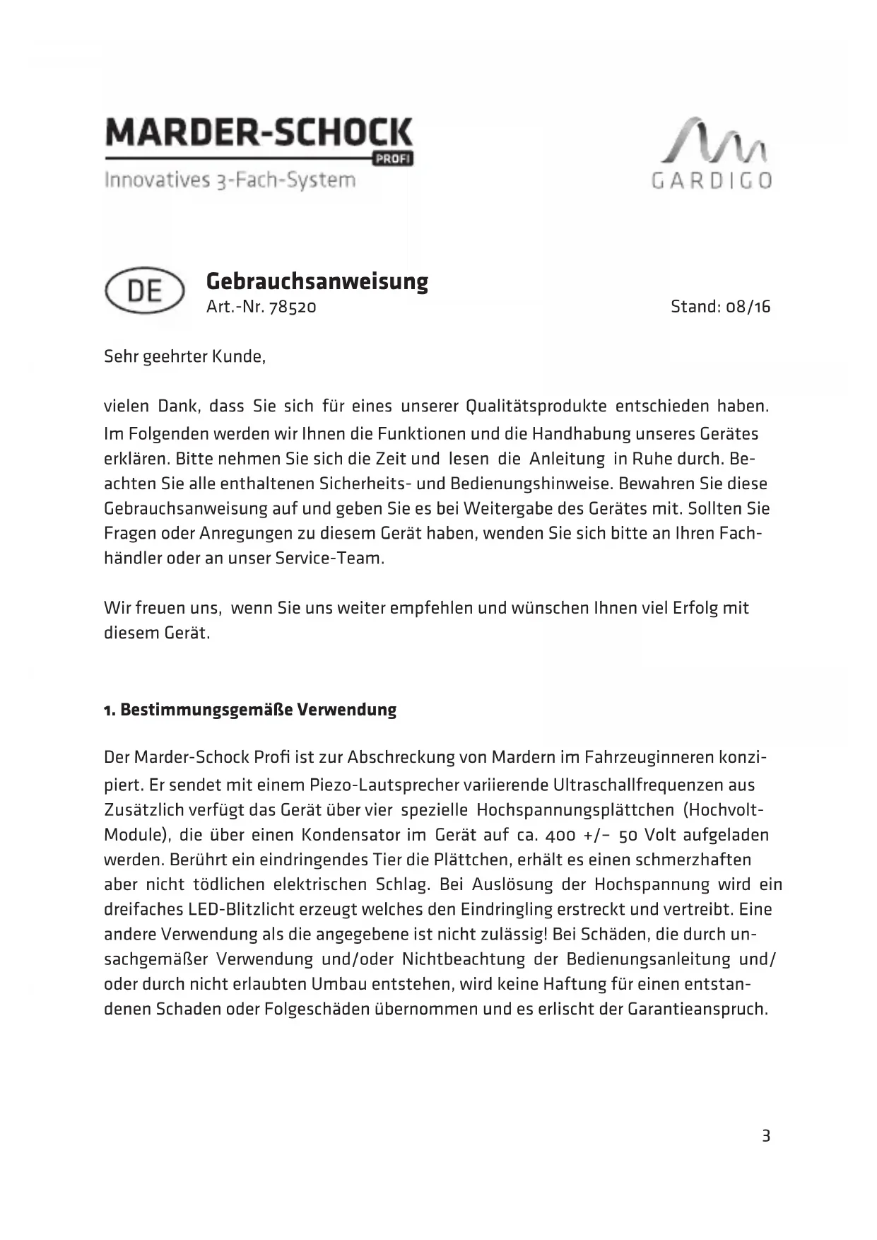 Der Marder-Schock Profi ist zur Abschreckung von Mardern im Fahrzeuginneren konzi- piert. Er sendet mit einem Piezo-Lautsprecher variierende Ultraschallfrequenzen aus Zusätzlich verfügt das Gerät über vier spezielle Hochspannungsplättchen (Hochvolt- Module), die über einen Kondensator im Gerät auf ca. 400 +/– 50 Volt aufgeladen werden. Berührt ein eindringendes Tier die Plättchen, erhält es einen schmerzhaften aber nicht tödlichen elektrischen Schlag. Bei Auslösung der Hochspannung wird ein dreifaches LED-Blitzlicht erzeugt welches den Eindringling erstreckt und vertreibt. Eine andere Verwendung als die angegebene ist nicht zulässig! Bei Schäden, die durch un- sachgemäßer Verwendung und/oder Nichtbeachtung der Bedienungsanleitung und/ oder durch nicht erlaubten Umbau entstehen, wird keine Haftung für einen entstan- denen Schaden oder Folgeschäden übernommen und es erlischt der Garantieanspruch. Stand: 08/164