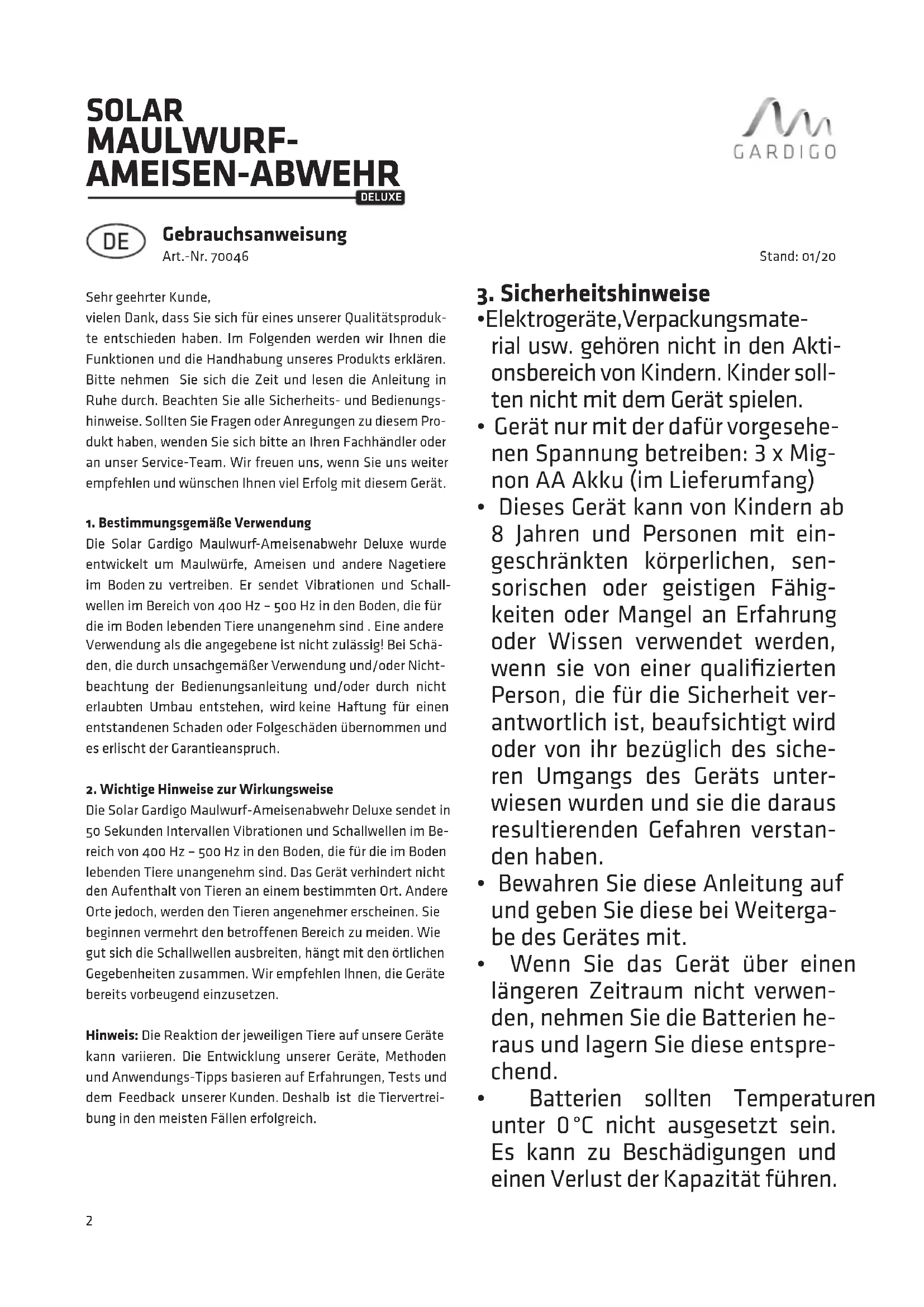 Die Solar Gardigo Maulwurf-Ameisenabwehr Deluxe wurde entwickelt um Maulwürfe, Ameisen und andere Nagetiere im Boden zu vertreiben. Er sendet Vibrationen und Schall- wellen im Bereich von 400 Hz – 500 Hz in den Boden, die für die im Boden lebenden Tiere unangenehm sind . Eine andere Verwendung als die angegebene ist nicht zulässig! Bei Schä- den, die durch unsachgemäßer Verwendung und/oder Nicht- beachtung der Bedienungsanleitung und/oder durch nicht erlaubten Umbau entstehen, wird keine Haftung für einen entstandenen Schaden oder Folgeschäden übernommen und es erlischt der Garantieanspruch.