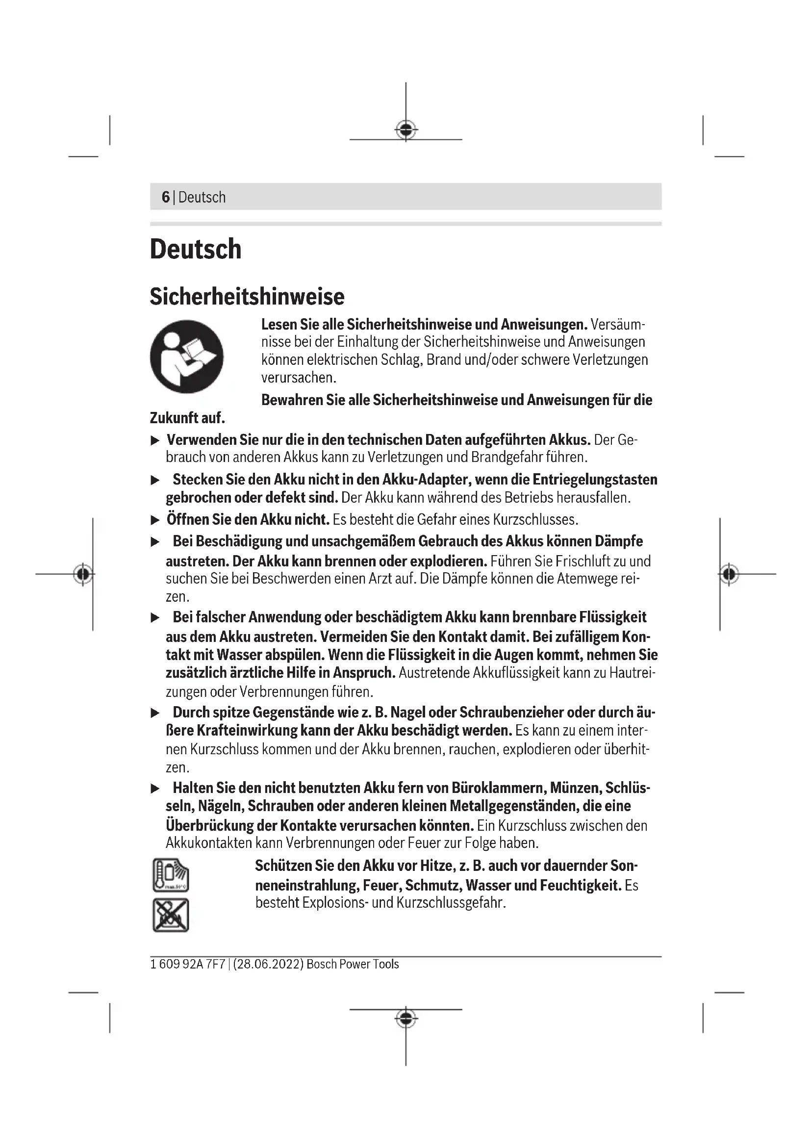 (6) (2) (2) (4) Bosch Power Tools 1 609 92A 7F7 | (28.06.2022)6 | Deutsch Deutsch Sicherheitshinweise Lesen Sie alle Sicherheitshinweise und Anweisungen. Versäum- nisse bei der Einhaltung der Sicherheitshinweise und Anweisungen können elektrischen Schlag, Brand und/oder schwere Verletzungen verursachen. Bewahren Sie alle Sicherheitshinweise und Anweisungen für die Zukunft auf. u Verwenden Sie nur die in den technischen Daten aufgeführten Akkus. Der Ge- brauch von anderen Akkus kann zu Verletzungen und Brandgefahr führen. u Stecken Sie den Akku nicht in den Akku-Adapter, wenn die Entriegelungstasten gebrochen oder defekt sind. Der Akku kann während des Betriebs herausfallen. u Öffnen Sie den Akku nicht. Es besteht die Gefahr eines Kurzschlusses. u Bei Beschädigung und unsachgemäßem Gebrauch des Akkus können Dämpfe austreten. Der Akku kann brennen oder explodieren. Führen Sie Frischluft zu und suchen Sie bei Beschwerden einen Arzt auf. Die Dämpfe können die Atemwege rei- zen. u Bei falscher Anwendung oder beschädigtem Akku kann brennbare Flüssigkeit aus dem Akku austreten. Vermeiden Sie den Kontakt damit. Bei zufälligem Kon- takt mit Wasser abspülen. Wenn die Flüssigkeit in die Augen kommt, nehmen Sie zusätzlich ärztliche Hilfe in Anspruch. Austretende Akkuflüssigkeit kann zu Hautrei- zungen oder Verbrennungen führen. u Durch spitze Gegenstände wie z. B. Nagel oder Schraubenzieher oder durch äu- ßere Krafteinwirkung kann der Akku beschädigt werden. Es kann zu einem inter- nen Kurzschluss kommen und der Akku brennen, rauchen, explodieren oder überhit- zen. u Halten Sie den nicht benutzten Akku fern von Büroklammern, Münzen, Schlüs- seln, Nägeln, Schrauben oder anderen kleinen Metallgegenständen, die eine Überbrückung der Kontakte verursachen könnten. Ein Kurzschluss zwischen den Akkukontakten kann Verbrennungen oder Feuer zur Folge haben. Schützen Sie den Akku vor Hitze, z. B. auch vor dauernder Son- neneinstrahlung, Feuer, Schmutz, Wasser und Feuchtigkeit. Es besteht Explosions- und Kurzschlussgefahr. 1 609 92A 7F7 | (28.06.2022) Bosch Power ToolsDeutsch | 7 Produkt- und Leistungsbeschreibung Lesen Sie alle Sicherheitshinweise und Anweisungen. Versäum- nisse bei der Einhaltung der Sicherheitshinweise und Anweisungen können elektrischen Schlag, Brand und/oder schwere Verletzungen verursachen. Bitte beachten Sie die Abbildungen im vorderen Teil der Betriebsan- leitung. Bestimmungsgemäßer Gebrauch Der Akku-Adapter dient zur Aufnahme eines Bosch 18-V-Lithium-Ionen-Akkus als Span- nungsquelle. Mit dem Akku-Adapter können maximal zwei USB-Geräte sowie ein Heizele- ment fur die Heizjacke gleichzeitig mit Spannung versorgt werden. Abgebildete Komponenten Die Nummerierung der abgebildeten Komponenten bezieht sich auf die Darstellung des Elektrowerkzeuges auf der Grafikseite. (1) Akku-Adapter (2) USB-Buchse (3) Buchse für Anschlussstecker des Heizelements der Heizjacke (4) Gurthalteclip (5) Ein-Taste zur Aktivierung des Akku-Adapters (6) Akku