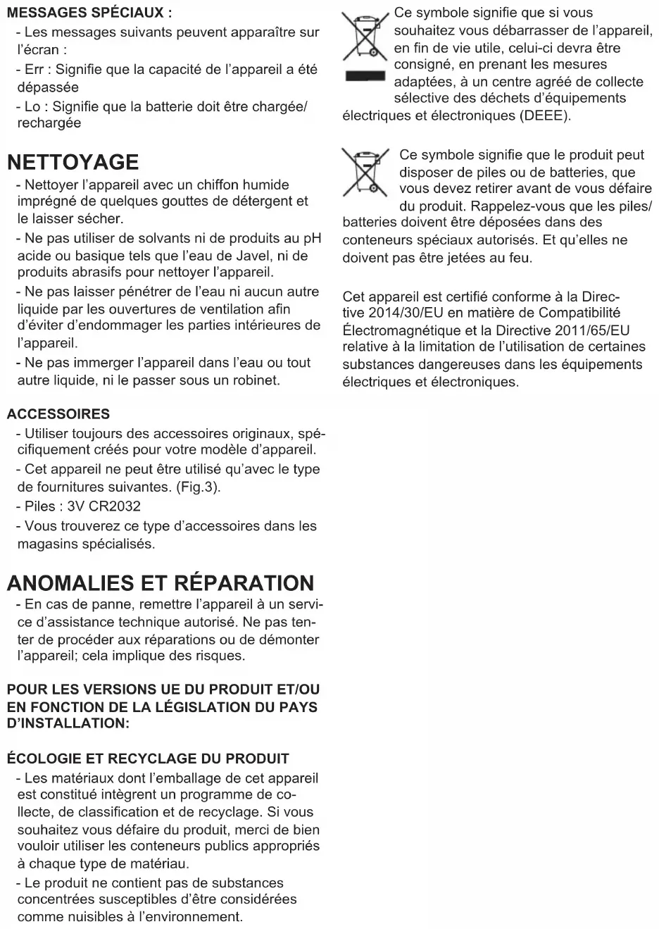 CHTSEINHEITENKG/LB/ST/OZ/LB-OZ....... - Das Gerät verfügt über eine Einstellung für die Gewichtseinheit, bringen Sie die Einstellung in die Position, die der Art von Einheiten entspri- cht, mit denen Sie arbeiten möchten. Drücken Sie auf die Taste „Modus“, die ausgewählte Messeinheit wird nach und nach auf dem Bilds- chirm erscheinen. STAND-BY-FUNKTION: - Zum Energiesparen geht das Gerät nach me- hreren Sekundenin den Sebstabschaltungszus- tand (Stand-By) über, wenn es während dieser Zeit nicht benutzt wurde. - Um das Gerät wieder in Betrieb zu setzen, betätigen Sie einfach den Ein-/Ausschalter - Um wieder zum normalen Betrieb überzugehen, müssen Sie einfach leicht auf die Wiegeplatt- form drücken und warten, bis auf dem Bilds- chirm 0,0erscheint.NACH DER BENUTZUNG DES GERÄTS: - Nehmen Sie die Batterien aus dem Fach, wenn Sie das Gerät längere Zeit nicht benutzen werden. SPEZIELLE HINWEISE: - Folgende Hinweise können auf dem Display angezeigt werden: - Err: Bedeutet, dass die Tragkraft des Gerätes überschritten worden ist - Lo: Bedeutet, dass die Batterie ausgewechselt / aufgeladen werden muss REINIGUNG - Reinigen Sie das Gerät mit einem feuchten Tuch, auf das Sie einige Tropfen Reinigungsmit- tel geben und trocknen Sie es danach ab. - Verwenden Sie zur Reinigung des Geräts weder Löse- oder Scheuermittel noch Produkte mit einem sauren oder basischen pH-Wert wie z.B. Lauge. - Lassen Sie kein Wasser oder andere Flüssi- gkeiten in die Belüftungsöffnungen eindringen, um Schäden an den inneren Funktionsteilen des Gerätes zu vermeiden. - Das Gerät nicht in Wasser oder andere Flüssi- gkeiten tauchen und nicht unter den Wasserh- ahn halten. ERSATZTEILE - Verwenden Sie stets für Ihr Gerät geeignete Originalteile. - Dieses Gerät ist nur mit den folgenden Batterien zu verwenden: (Fig.3). - Batterien: 3V CR2032. - Betriebsmittel sind in Fachgeschäften erhältlich.