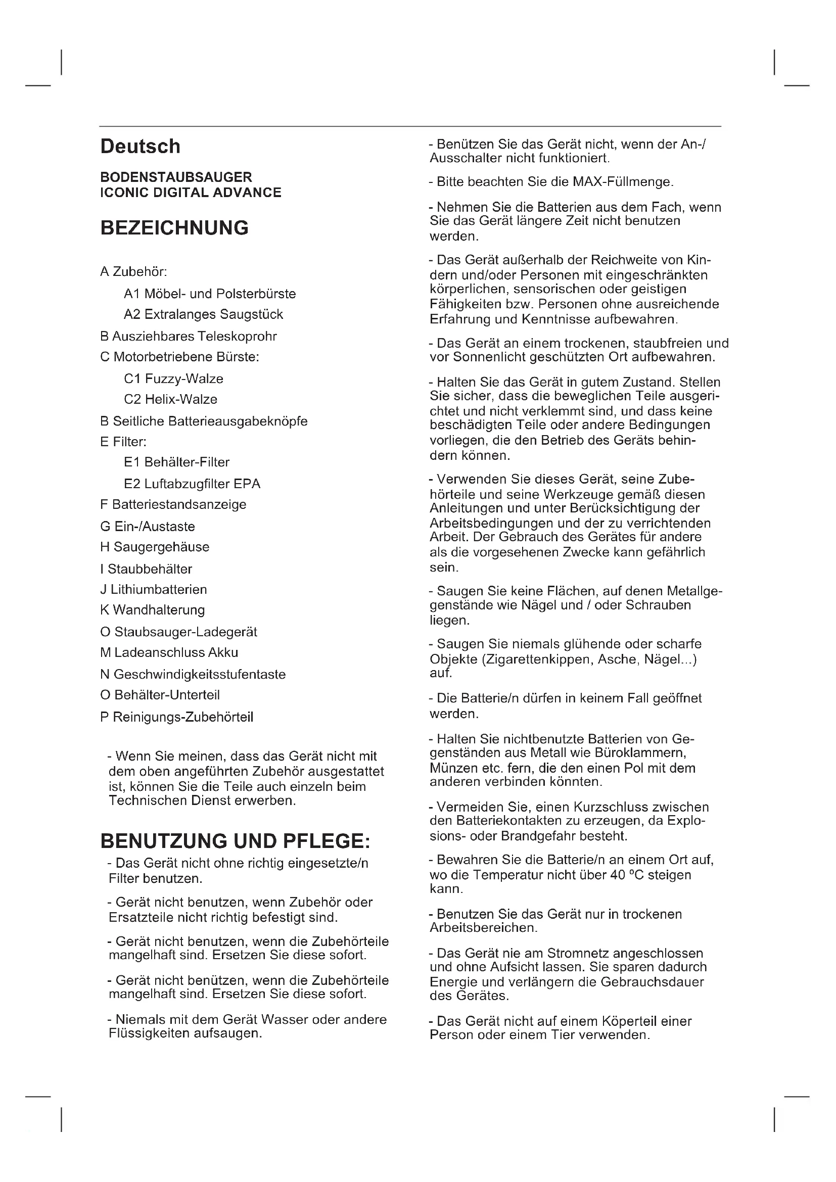 BEZEICHNUNG A Zubehör: A1 Möbel- und Polsterbürste A2 Extralanges Saugstück B Ausziehbares Teleskoprohr C Motorbetriebene Bürste: C1 Fuzzy-Walze C2 Helix-Walze B Seitliche Batterieausgabeknöpfe E Filter: E1 Behälter-Filter E2 Luftabzuglter EPA F Batteriestandsanzeige G Ein-/Austaste H Saugergehäuse I Staubbehälter J Lithiumbatterien K Wandhalterung O Staubsauger-Ladegerät M Ladeanschluss Akku N Geschwindigkeitsstufentaste O Behälter-Unterteil P Reinigungs-Zubehörteil - Wenn Sie meinen, dass das Gerät nicht mit dem oben angeführten Zubehör ausgestattet ist, können Sie die Teile auch einzeln beim Technischen Dienst erwerben. BENUTZUNG UND PFLEGE: - Das Gerät nicht ohne richtig eingesetzte/n Filter benutzen. - Gerät nicht benutzen, wenn Zubehör oder Ersatzteile nicht richtig befestigt sind. - Gerät nicht benutzen, wenn die Zubehörteile mangelhaft sind. Ersetzen Sie diese sofort. - Gerät nicht benützen, wenn die Zubehörteile mangelhaft sind. Ersetzen Sie diese sofort. - Niemals mit dem Gerät Wasser oder andere Flüssigkeiten aufsaugen. - Benützen Sie das Gerät nicht, wenn der An-/ Ausschalter nicht funktioniert. - Bitte beachten Sie die MAX-Füllmenge. - Nehmen Sie die Batterien aus dem Fach, wenn Sie das Gerät längere Zeit nicht benutzen werden. - Das Gerät außerhalb der Reichweite von Kin- dern und/oder Personen mit eingeschränkten körperlichen, sensorischen oder geistigen Fähigkeiten bzw. Personen ohne ausreichende Erfahrung und Kenntnisse aufbewahren. - Das Gerät an einem trockenen, staubfreien und vor Sonnenlicht geschützten Ort aufbewahren. - Halten Sie das Gerät in gutem Zustand. Stellen Sie sicher, dass die beweglichen Teile ausgeri- chtet und nicht verklemmt sind, und dass keine beschädigten Teile oder andere Bedingungen vorliegen, die den Betrieb des Geräts behin- dern können. - Verwenden Sie dieses Gerät, seine Zube- hörteile und seine Werkzeuge gemäß diesen Anleitungen und unter Berücksichtigung der Arbeitsbedingungen und der zu verrichtenden Arbeit. Der Gebrauch des Gerätes für andere als die vorgesehenen Zwecke kann gefährlich sein. - Saugen Sie keine Flächen, auf denen Metallge- genstände wie Nägel und / oder Schrauben liegen. - Saugen Sie niemals glühende oder scharfe Objekte (Zigarettenkippen, Asche, Nägel...) auf. - Die Batterie/n dürfen in keinem Fall geöffnet werden. - Halten Sie nichtbenutzte Batterien von Ge- genständen aus Metall wie Büroklammern, Münzen etc. fern, die den einen Pol mit dem anderen verbinden könnten. - Vermeiden Sie, einen Kurzschluss zwischen den Batteriekontakten zu erzeugen, da Explo- sions- oder Brandgefahr besteht. - Bewahren Sie die Batterie/n an einem Ort auf, wo die Temperatur nicht über 40 ºC steigen kann. - Benutzen Sie das Gerät nur in trockenen Arbeitsbereichen. - Das Gerät nie am Stromnetz angeschlossen und ohne Aufsicht lassen. Sie sparen dadurch Energie und verlängern die Gebrauchsdauer des Gerätes. - Das Gerät nicht auf einem Köperteil einer Person oder einem Tier verwenden.DEN AKKU-LADESTAND ÜBERPRÜFEN: - Stellen Sie das Gerät an, indem Sie den An-/ Ausschalter betätigen. (G) - Wenn sich die fünf Leucht- (F) anzeigeneins- chalten bedeutet dies, dass das Gerät komplett aufgeladen ist. - Wenn nur eine Akkuanzeige aueuchtet, be- deutet das, dass der Akku nur gering aufgela- den ist. - Wenn keine Leuchte angeht, bedeutet dies, dass die Batterie vollständig entladen ist. - Anmerkung: Für eine lange Akku-Lebensdauer wird empfohlen, den Akku erst aufzuladen, wenn er sich vollständig entladen hat.
