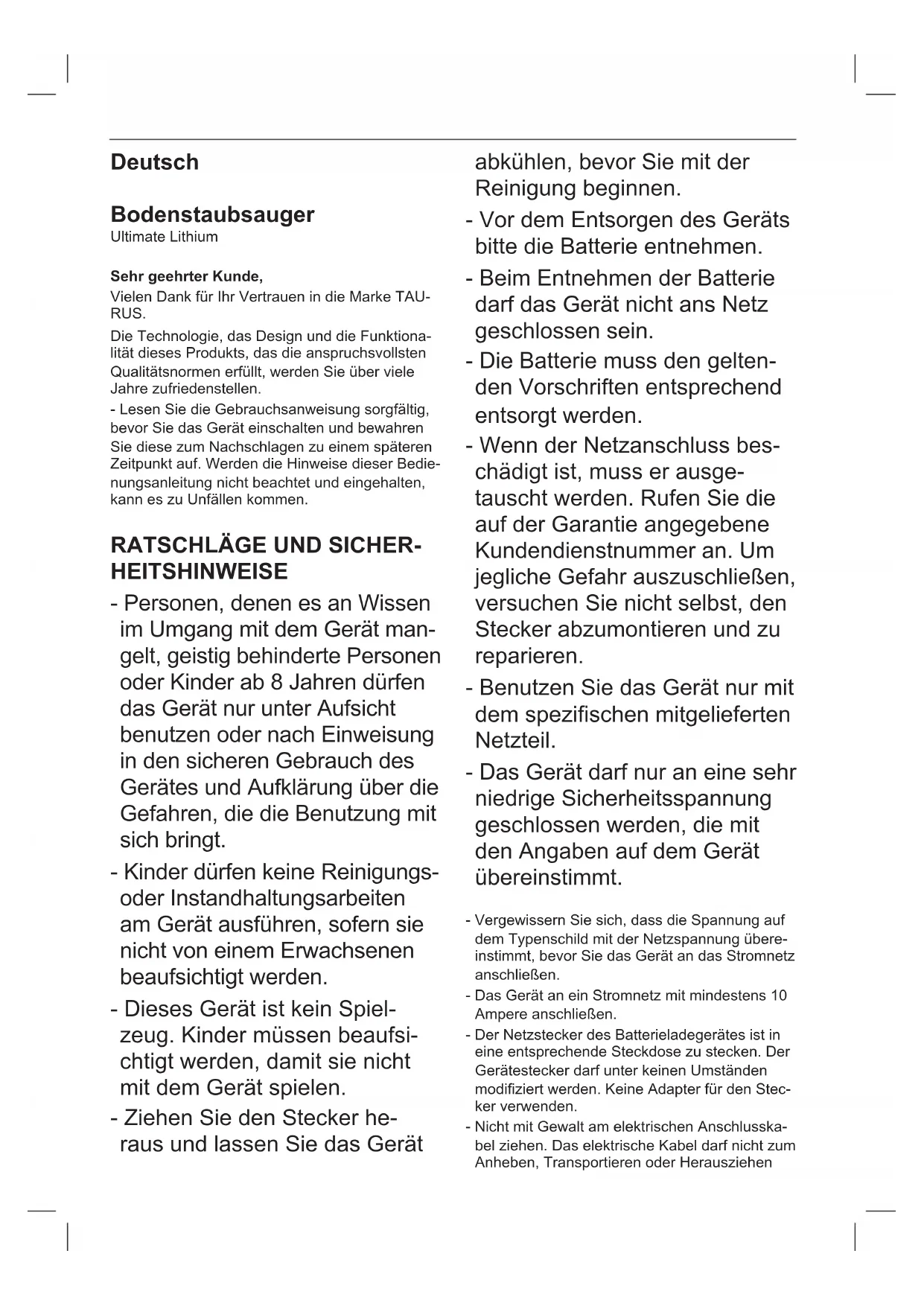 Ultimate Lithium - Staubsauger TAURUS - Kostenlose Bedienungsanleitung