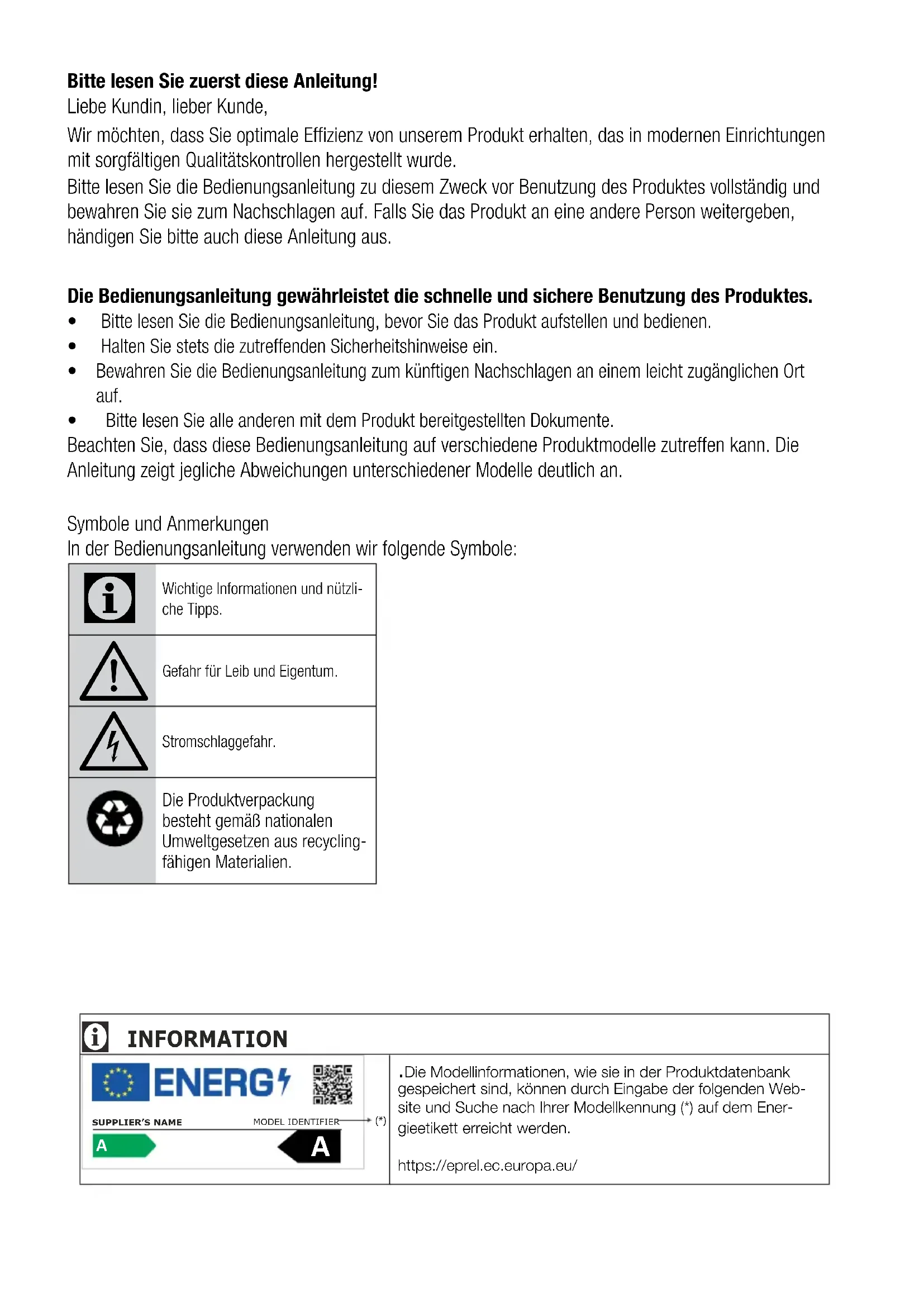 Wichtige Informationen und nützli-che Tipps. Gefahr für Leib und Eigentum. Stromschlaggefahr.Die Produktverpackung besteht gemäß nationalen Umweltgesetzen aus recycling-fähigen Materialien. .Die Modellinformationen, wie sie in der Produktdatenbank gespeichert sind, können durch Eingabe der folgenden Web-site und Suche nach Ihrer Modellkennung (*) auf dem Ener-gieetikett erreicht werden.https://eprel.ec.europa.eu/