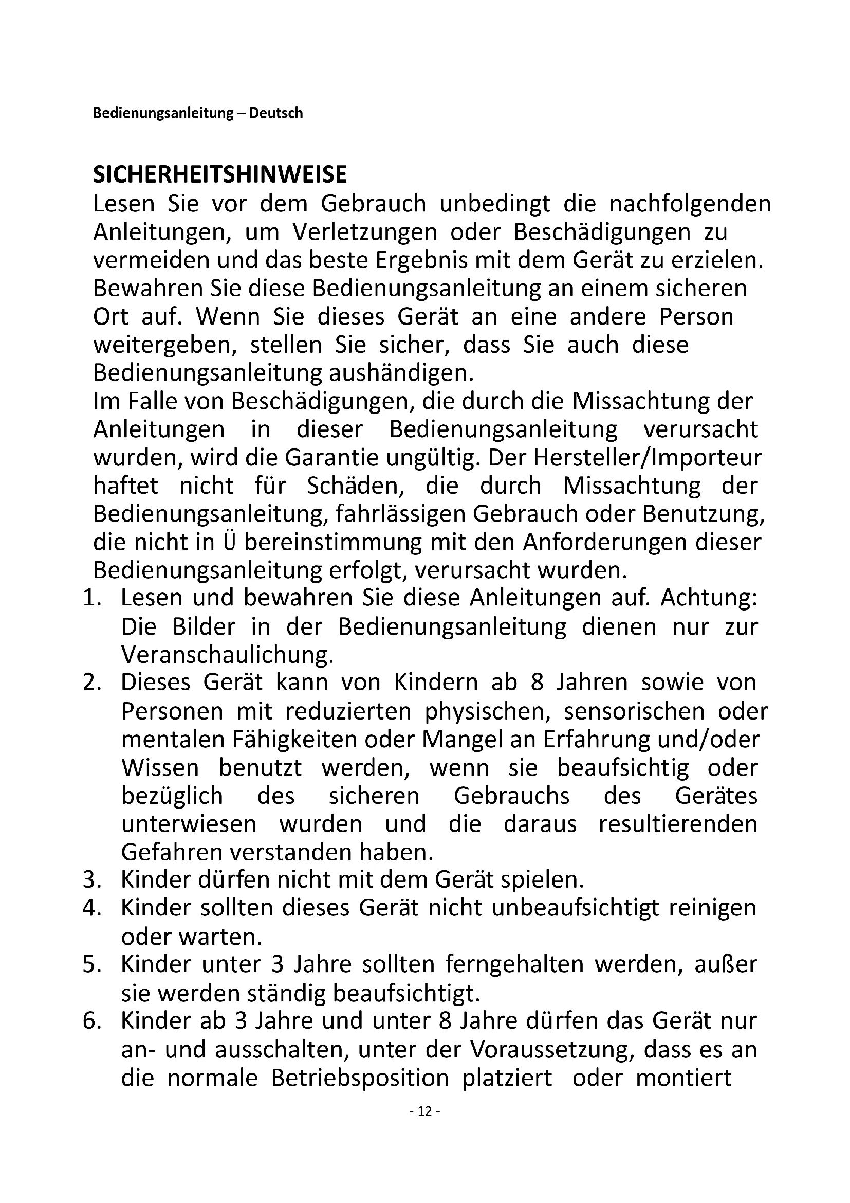 Satisfies the requirement of the Council Directives: COMMISSION REGULATION (EU) No 2015/1188 of 28 April 2015 and Amending COMMISSION REGULATION (EU) 2016/2282 implementing Directive 2009/125/EC of the European Parliament and of the Council with regards to ecodesign requirements for local space heaters Regarding information for consumers on how to install, use and maintain the product, WEEE information, please check the instruction manual provided with packaging.- 12 - Bedienungsanleitung – Deutsch SICHERHEITSHINWEISE Lesen Sie vor dem Gebrauch unbedingt die nachfolgenden Anleitungen, um Verletzungen oder Beschädigungen zu vermeiden und das beste Ergebnis mit dem Gerät zu erzielen. Bewahren Sie diese Bedienungsanleitung an einem sicheren Ort auf. Wenn Sie dieses Gerät an eine andere Person weitergeben, stellen Sie sicher, dass Sie auch diese Bedienungsanleitung aushändigen. Im Falle von Beschädigungen, die durch die Missachtung der Anleitungen in dieser Bedienungsanleitung verursacht wurden, wird die Garantie ungültig. Der Hersteller/Importeur haftet nicht für Schäden, die durch Missachtung der Bedienungsanleitung, fahrlässigen Gebrauch oder Benutzung, die nicht in Übereinstimmung mit den Anforderungen dieser Bedienungsanleitung erfolgt, verursacht wurden.