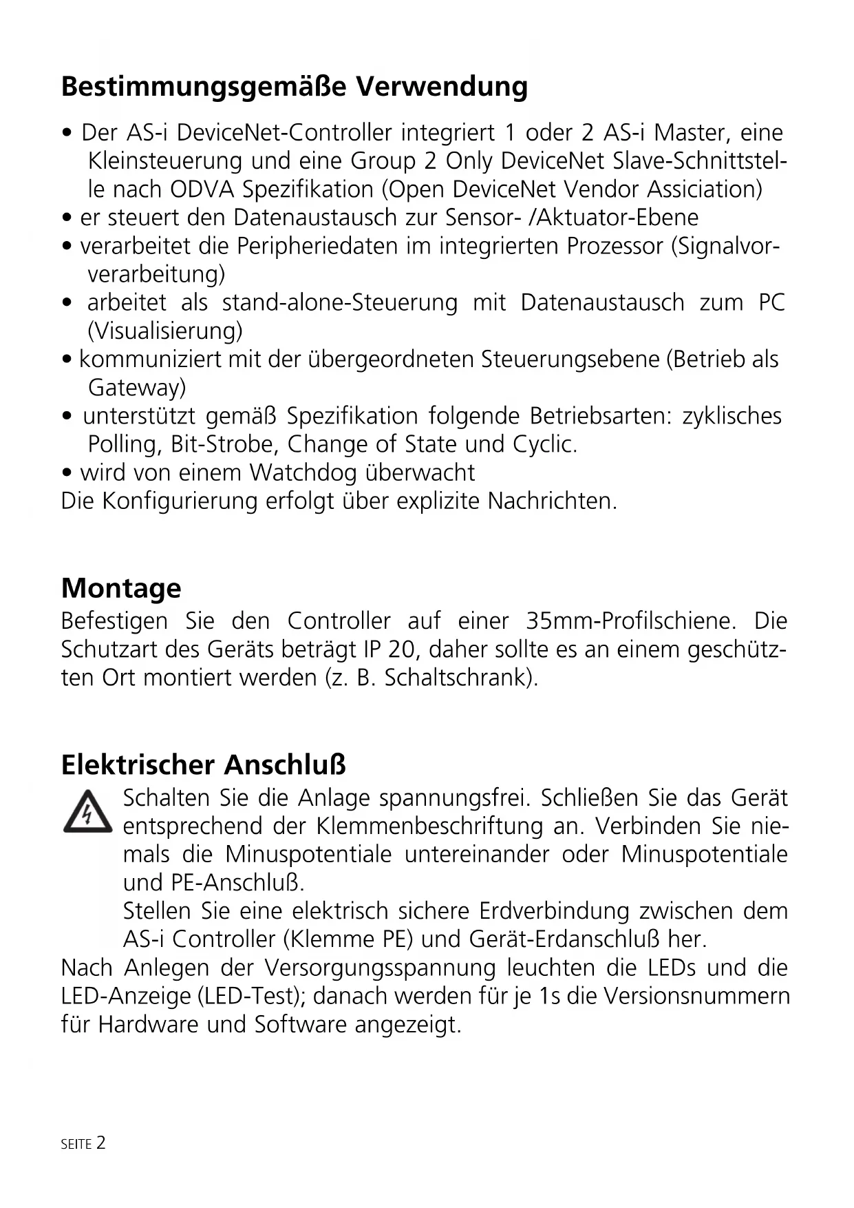 - Der AS-i DeviceNet-Controller integriert 1 oder 2 AS-i Master, eine Kleinsteuerung und eine Group 2 Only DeviceNet Slave-Schnittstel- le nach ODVA Spezifikation (Open DeviceNet Vendor Assiciation)