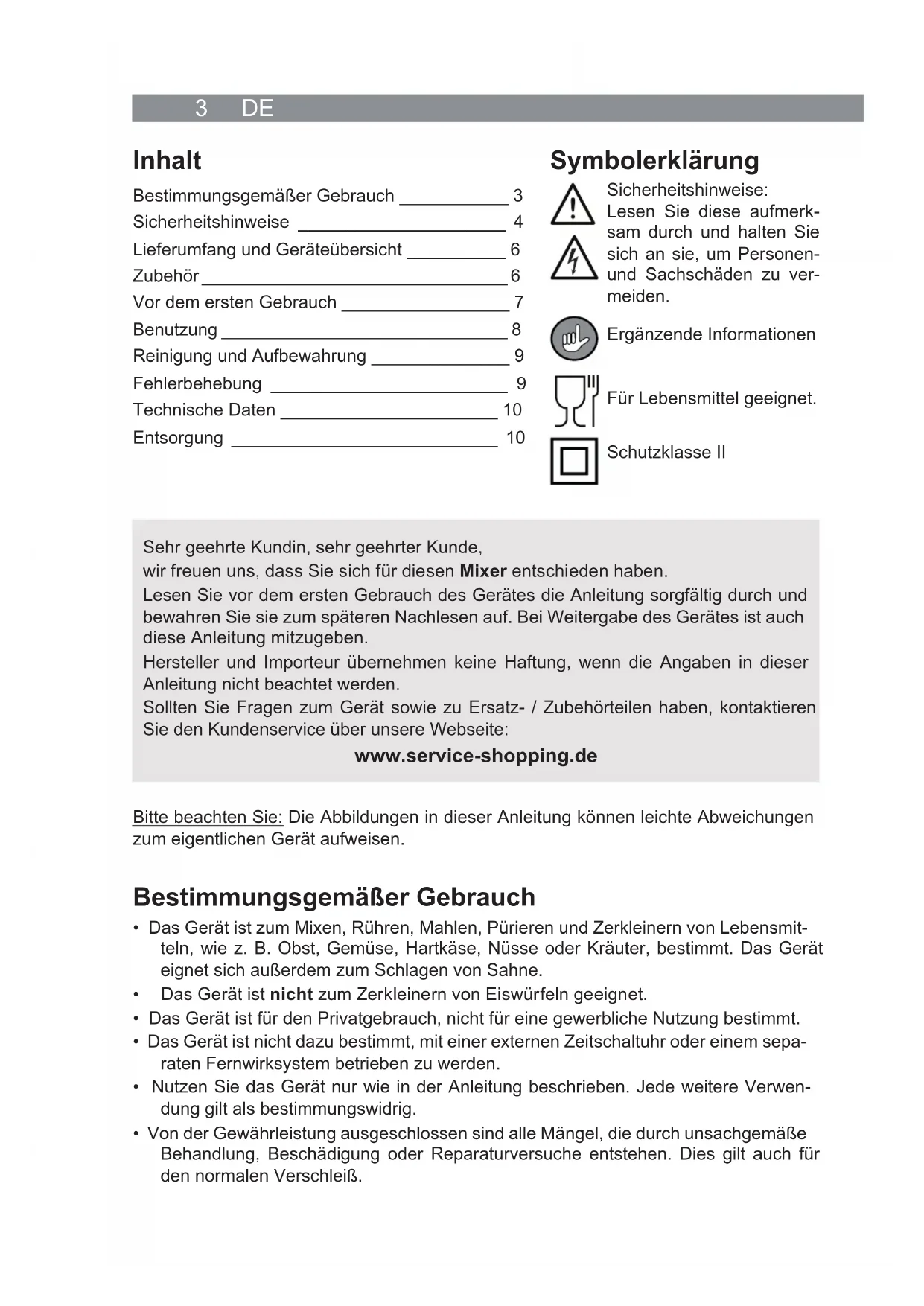 - Von der Gewährleistung ausgeschlossen sind alle Mängel, die durch unsachgemäße Behandlung, Beschädigung oder Reparaturversuche entstehen. Dies gilt auch für den normalen Verschleiß. Symbolerklärung Sicherheitshinweise: Lesen Sie diese aufmerk- sam durch und halten Sie sich an sie, um Personen- und Sachschäden zu ver- meiden. Ergänzende Informationen Für Lebensmittel geeignet. Schutzklasse II Sehr geehrte Kundin, sehr geehrter Kunde, wir freuen uns, dass Sie sich für diesen Mixer entschieden haben. Lesen Sie vor dem ersten Gebrauch des Gerätes die Anleitung sorgfältig durch und bewahren Sie sie zum späteren Nachlesen auf. Bei Weitergabe des Gerätes ist auch diese Anleitung mitzugeben. Hersteller und Importeur übernehmen keine Haftung, wenn die Angaben in dieser Anleitung nicht beachtet werden. Sollten Sie Fragen zum Gerät sowie zu Ersatz- / Zubehörteilen haben, kontaktieren Sie den Kundenservice über unsere Webseite: www.service-shopping.deDE 4 Sicherheitshinweise ■ Dieses Gerät kann von Personen mit reduzierten physischen, sensorischen oder mentalen Fähigkeiten oder Mangel an Erfah- rung und/oder Wissen benutzt werden, wenn sie beaufsichtigt oder bezüglich des sicheren Gebrauchs des Gerätes unterwie- sen wurden und die daraus resultierenden Gefahren verstanden haben. Kinder dürfen nicht mit dem Gerät spielen. ■ Kinder und Tiere sind vom Gerät und der Anschlussleitung fern- zuhalten! Bewahren Sie das Gerät für Kinder und Tiere unzu- gänglich auf! ■ Das Gerät ist bei nicht vorhandener Aufsicht und vor dem Zu- sammenbau, dem Auseinandernehmen sowie Reinigen stets vom Netz zu trennen. ■ Wenn das Gerät, die Anschlussleitung oder der Stecker des Ge- rätes beschädigt ist, muss es durch den Hersteller oder Kunden- service oder eine ähnlich qualifi zierte Person (z. B. Fachwerk- statt) ersetzt werden, um Gefährdungen zu vermeiden. Verletzungsgefahren ■ Erstickungsgefahr! Halten Sie Kinder und Tiere vom Ver packungsmaterial fern. ■ Verletzungsgefahr durch scharfe Klingen! Die Klingen sind scharf! Seien Sie vorsichtig im Umgang mit dem Kreuzklingenaufsatz, um Schnittverletzungen zu ver- meiden. ■ Verbrennungsgefahr! Befüllen Sie das Gerät niemals mit heißen Lebensmitteln oder Flüssigkeiten! Der Inhalt darf nicht wärmer als 50 °C sein. ■ Achten Sie darauf, dass Ihr Arbeitsbereich stets gut beleuchtet ist, wenn Sie das Gerät verwenden. ■ Achten Sie darauf, dass das angeschlossene Netzkabel keine Stolpergefahr dar- stellt. Lassen Sie das Kabel nicht über den Rand von Tischen oder Küchentheken hängen. Es könnte jemand hängen bleiben und das Gerät herunterziehen. Stromschlag- und Brandgefahr ■ Verwenden Sie das Gerät nur in geschlossenen Räumen. ■ Stellen Sie das Gerät immer auf einen trockenen, ebenen und festen Untergrund. ■ Halten Sie ausreichend Abstand zu anderen Wärmequellen, z. B. Herdplatten oder Öfen. ■ Decken Sie das Gerät niemals mit Tüchern o. Ä. ab. Es besteht Überhitzungsgefahr! ■ Stellen Sie das Gerät nie in der Nähe von leicht entzündbaren Materialien (Gardi- nen, Textilien, etc.) auf. ■ Legen Sie keine leicht entfl ammbaren Gegenstände, z. B. Papier, Pappe oder Kunst- stoff, in oder auf das Gerät.5 DE ■ Tauchen Sie die Motoreinheit niemals in Wasser oder andere Flüssigkeiten ein! Stel- len Sie sicher, dass die Motoreinheit, das Kabel oder der Stecker nicht ins Wasser fallen oder nass werden können. ■ Sollte die Motoreinheit ins Wasser fallen, unterbrechen Sie sofort die Stromzufuhr. ■ Berühren Sie die Motoreinheit, das Kabel oder den Stecker niemals mit feuchten Händen. ■ Schließen Sie das Gerät nur an eine Steckdose an, die ordnungsgemäß installiert ist und mit den technischen Daten des Gerätes übereinstimmt (siehe Kapitel „Tech- nische Daten“). ■ Verlegen Sie das Kabel so, dass es nicht gequetscht oder geknickt wird und nicht mit heißen Flächen in Berührung kommt. ■ Ziehen Sie den Netzstecker aus der Steckdose, wenn während des Betriebes ein Fehler auftritt oder vor einem Gewitter. ■ Wenn Sie den Netzstecker aus der Steckdose ziehen möchten, ziehen Sie am Ste- cker und nie am Kabel. Vermeiden von Material-, Sach- und Geräteschäden ■ Überprüfen Sie das Gerät vor jeder Inbetriebnahme auf Beschädigungen. Wenn die Motoreinheit, das Zubehör, das Netzkabel oder der Stecker sichtbare Schäden aufweisen, darf das Gerät nicht benutzt werden. Versuchen Sie nicht, das Gerät eigenständig zu reparieren oder das Kabel bzw. den Stecker zu ersetzen. Kontak- tieren Sie in Schadensfällen umgehend den Kundenservice. ■ Überprüfen Sie vor jeder Inbetriebnahme, ob das Gerät sauber und trocken sowie korrekt zusammengesetzt und verschlossen ist. ■ Benutzen Sie das Gerät nur, wenn es vollständig zusammengebaut, unbeschädigt und funktionsfähig ist! ■ Stellen Sie das Gerät immer auf einen trockenen, ebenen und festen Untergrund. ■ Verwenden Sie kein zusätzliches Zubehör. Verwenden Sie nur die mitgelieferten Zubehörteile vom Hersteller. ■ Lassen Sie den Motor nicht laufen, wenn das Gerät leer ist. ■ Halten Sie die Motoreinheit während der Zubereitung immer mit einer Hand fest. ■ Verwenden Sie das Gerät maximal 1 Minute lang ohne Unterbrechung. Anschlie- ßend muss eine Abkühlzeit von 2 Minuten eingehalten werden. ■ Achten Sie darauf, dass die maximale Füllmenge (MAX-Mar kierung im Mixbecher) nicht überschritten wird! ■ Das Gerät darf im eingeschalteten Zustand nicht transportiert werden. Ziehen Sie stets den Netzstecker aus der Steckdose und lassen Sie den Motor vollständig zum Stillstand kommen, bevor Sie das Gerät bewegen. ■ Lassen Sie das Gerät nicht fallen und setzen Sie es keinen starken Stößen aus. ■ Setzen Sie das Gerät keinen extremen Temperaturen, starken Temperaturschwan- kungen, Feuchtigkeit oder direkter Sonneneinstrahlung aus. Hygienehinweise ■ Das Gerät kann mit Produktionsrückständen behaftet sein. Um gesundh
