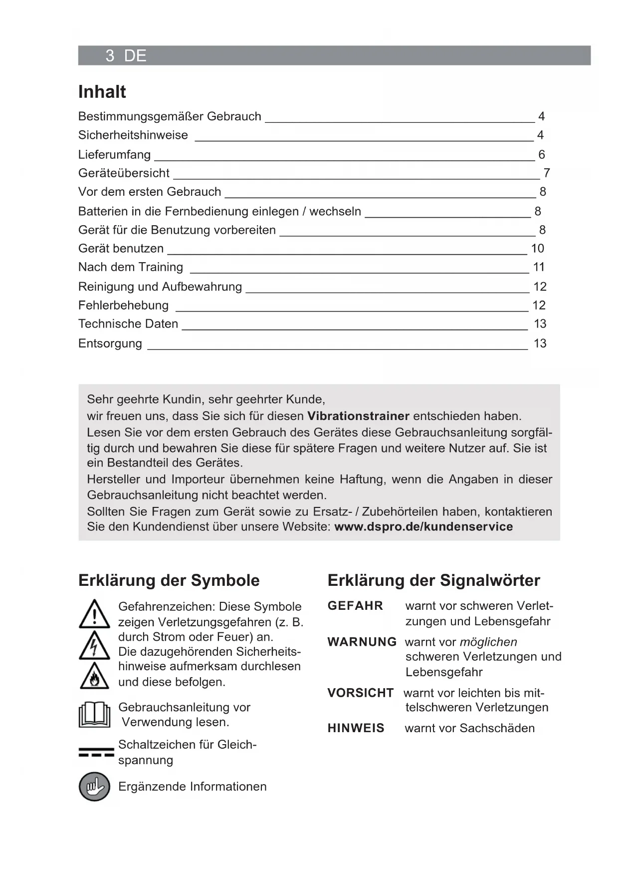 Gebruikershandleiding vanaf pagina 363 DE Inhalt Bestimmungsgemäßer Gebrauch _______________________________________ 4 Sicherheitshinweise _________________________________________________ 4 Lieferumfang _______________________________________________________ 6 Geräteübersicht _____________________________________________________ 7 Vor dem ersten Gebrauch _____________________________________________ 8 Batterien in die Fernbedienung einlegen / wechseln ________________________ 8 Gerät für die Benutzung vorbereiten _____________________________________ 8 Gerät benutzen ____________________________________________________ 10 Nach dem Training _________________________________________________ 11 Reinigung und Aufbewahrung _________________________________________ 12 Fehlerbehebung ___________________________________________________ 12 Technische Daten __________________________________________________ 13 Entsorgung _______________________________________________________ 13 Erklärung der Symbole Gefahrenzeichen: Diese Symbole zeigen Verletzungsgefahren (z. B. durch Strom oder Feuer) an. Die dazugehörenden Sicherheits- hinweise aufmerksam durchlesen und diese befolgen. Gebrauchsanleitung vor Verwendung lesen. Schaltzeichen für Gleich- spannung Ergänzende Informationen Erklärung der Signalwörter GEFAHR warnt vor schweren Verlet- zungen und Lebensgefahr WARNUNG warnt vor mög lic hen schweren Verletzungen und Lebensgefahr VORSICHT warnt vor leichten bis mit- telschweren Verletzungen HINWEIS warnt vor Sachschäden Sehr geehrte Kundin, sehr geehrter Kunde, wir freuen uns, dass Sie sich für diesen Vibrationstrainer entschieden haben. Lesen Sie vor dem ersten Gebrauch des Gerätes diese Gebrauchsanleitung sorgfäl- tig durch und bewahren Sie diese für spätere Fragen und weitere Nutzer auf. Sie ist ein Bestandteil des Gerätes. Hersteller und Importeur übernehmen keine Haftung, wenn die Angaben in dieser Gebrauchsanleitung nicht beachtet werden. Sollten Sie Fragen zum Gerät sowie zu Ersatz- / Zubehörteilen haben, kontaktieren Sie den Kundendienst über unsere Website: www.dspro.de/kundenserviceDE 4 Bestimmungsgemäßer Gebrauch