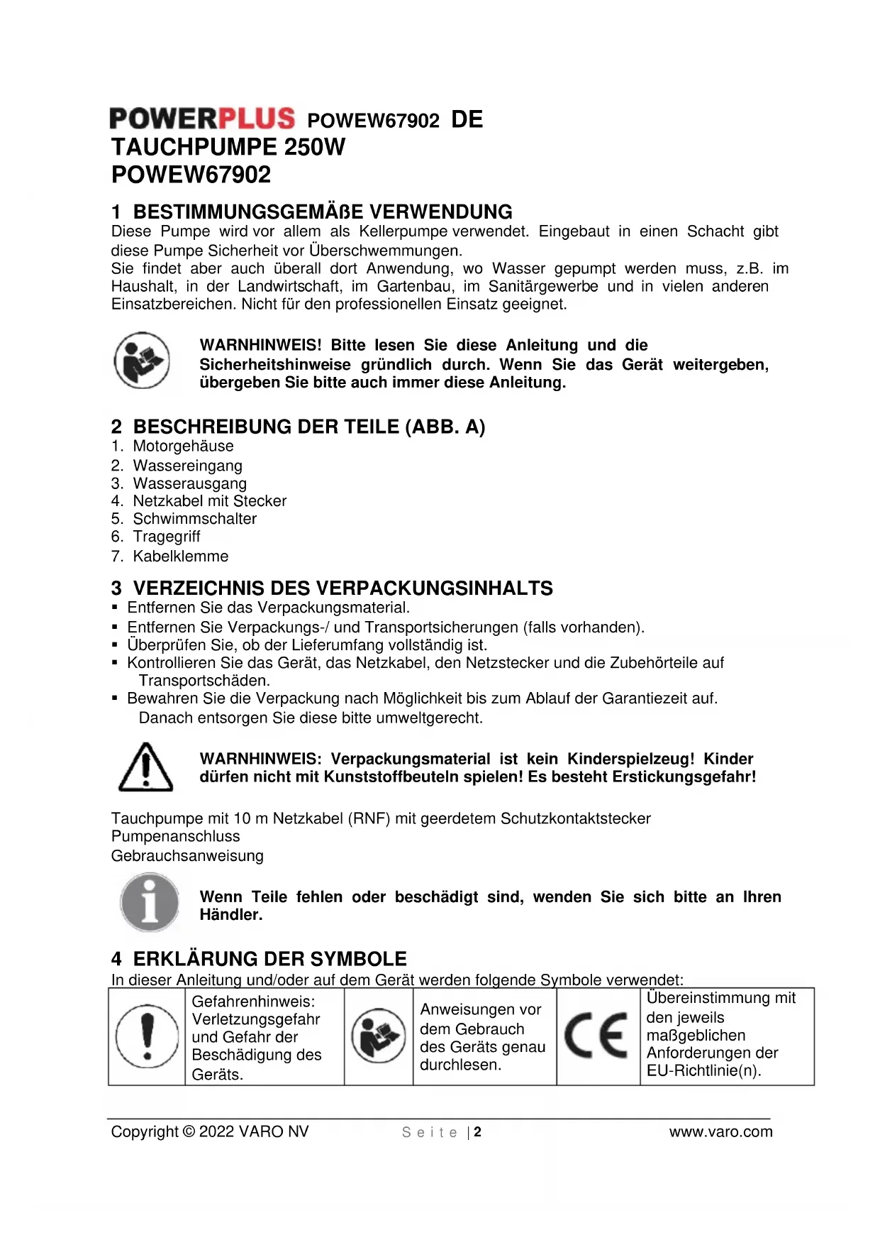 Copyright © 2022 VARO NV S e i t e | 2 www.varo.com TAUCHPUMPE 250W POWEW67902 1 BESTIMMUNGSGEMÄßE VERWENDUNG Diese Pumpe wird vor allem als Kellerpumpe verwendet. Eingebaut in einen Schacht gibt diese Pumpe Sicherheit vor Überschwemmungen. Sie findet aber auch überall dort Anwendung, wo Wasser gepumpt werden muss, z.B. im Haushalt, in der Landwirtschaft, im Gartenbau, im Sanitärgewerbe und in vielen anderen Einsatzbereichen. Nicht für den professionellen Einsatz geeignet. WARNHINWEIS! Bitte lesen Sie diese Anleitung und die Sicherheitshinweise gründlich durch. Wenn Sie das Gerät weitergeben, übergeben Sie bitte auch immer diese Anleitung. 2 BESCHREIBUNG DER TEILE (ABB. A)