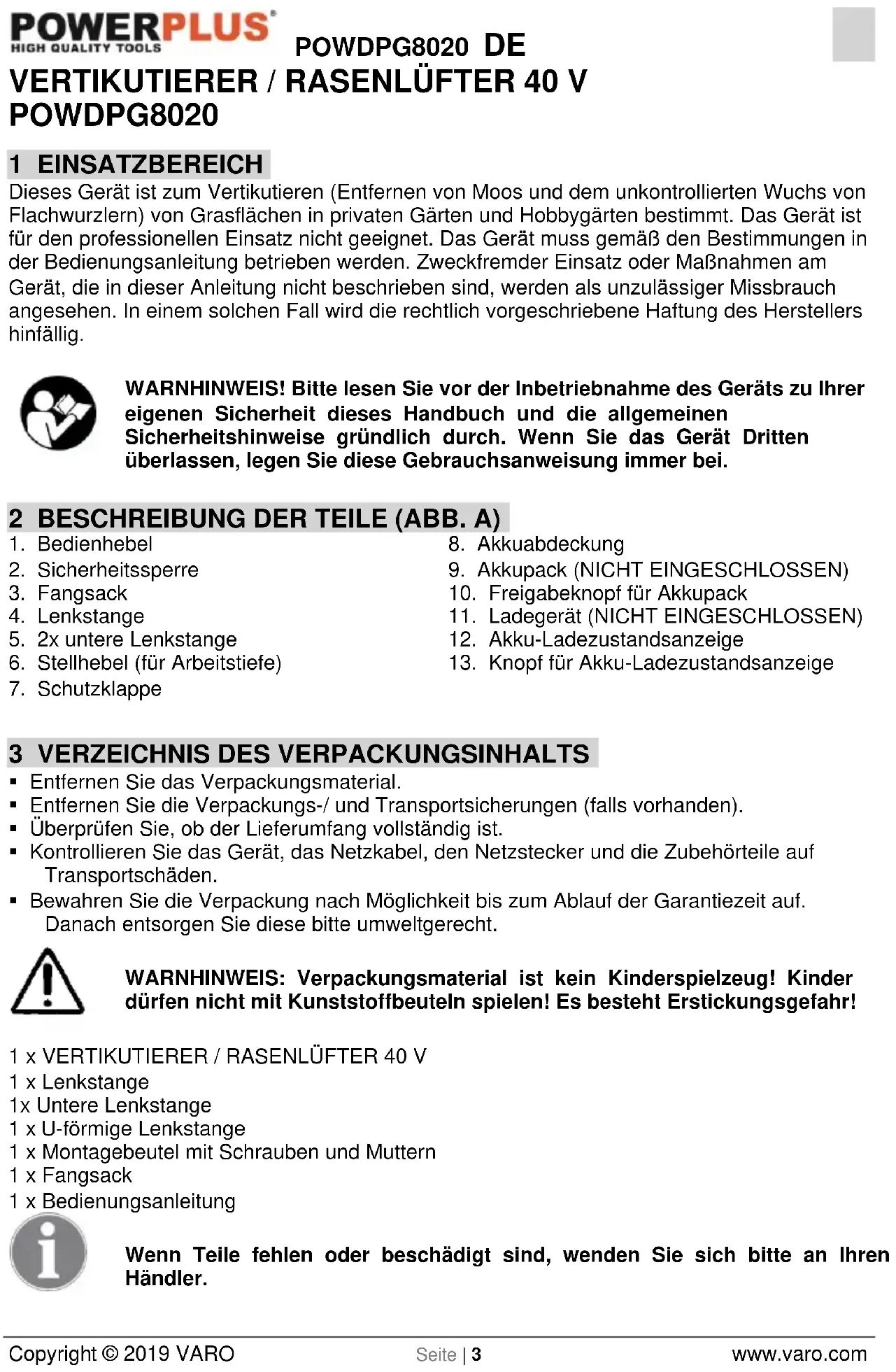 - Bewahren Sie die Verpackung nach Möglichkeit bis zum Ablauf der Garantiezeit auf. Danach entsorgen Sie diese bitte umweltgerecht. WARNHINWEIS: Verpackungsmaterial ist kein Kinderspielzeug! Kinder dürfen nicht mit Kunststoffbeuteln spielen! Es besteht Erstickungsgefahr! 1 x VERTIKUTIERER / RASENLÜFTER 40 V 1 x Lenkstange 1x Untere Lenkstange 1 x U-förmige Lenkstange 1 x Montagebeutel mit Schrauben und Muttern 1 x Fangsack 1 x Bedienungsanleitung Wenn Teile fehlen oder beschädigt sind, wenden Sie sich bitte an Ihren Händler.POWDPG8020 DE Copyright © 2019 VARO Seite | 4 www.varo.com