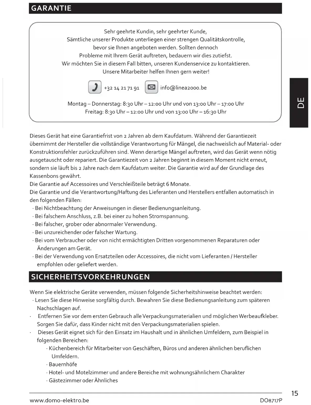 GARANTIE Sehr geehrte Kundin, sehr geehrter Kunde, Sämtliche unserer Produkte unterliegen einer strengen Qualitätskontrolle, bevor sie Ihnen angeboten werden. Sollten dennoch Probleme mit Ihrem Gerät auftreten, bedauern wir dies zutiefst. Wir möchten Sie in diesem Fall bitten, unseren Kundenservice zu kontaktieren. Unsere Mitarbeiter helfen Ihnen gern weiter! +32 14 21 71 91 info@linea2000.be Montag – Donnerstag: 8:30 Uhr – 12:00 Uhr und von 13:00 Uhr – 17:00 Uhr Freitag: 8:30 Uhr – 12:00 Uhr und von 13:00 Uhr – 16:30 Uhr Dieses Gerät hat eine Garantiefrist von 2 Jahren ab dem Kaufdatum. Während der Garantiezeit übernimmt der Hersteller die vollständige Verantwortung für Mängel, die nachweislich auf Material- oder Konstruktionsfehler zurückzuführen sind. Wenn derartige Mängel auftreten, wird das Gerät wenn nötig ausgetauscht oder repariert. Die Garantiezeit von 2 Jahren beginnt in diesem Moment nicht erneut, sondern sie läuft bis 2 Jahre nach dem Kaufdatum weiter. Die Garantie wird auf der Grundlage des Kassenbons gewährt. Die Garantie auf Accessoires und Verschleißteile beträgt 6 Monate. Die Garantie und die Verantwortung/Haftung des Lieferanten und Herstellers entfallen automatisch in den folgenden Fällen: