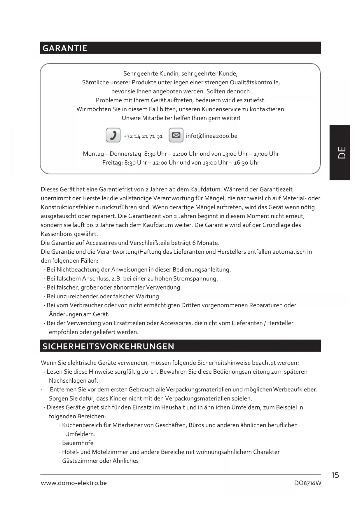 - Das Gerät ist nur auf den privaten Gebrauch ausgelegt. Der Hersteller ist nicht verantwortlich für Unfälle, die als Folge von unsachgemäßem Gebrauch des Geräts oder Nichtbefolgen der in dieser Anleitung aufgeführten Regeln entstehen.17 DO8716W www.domo-elektro.be