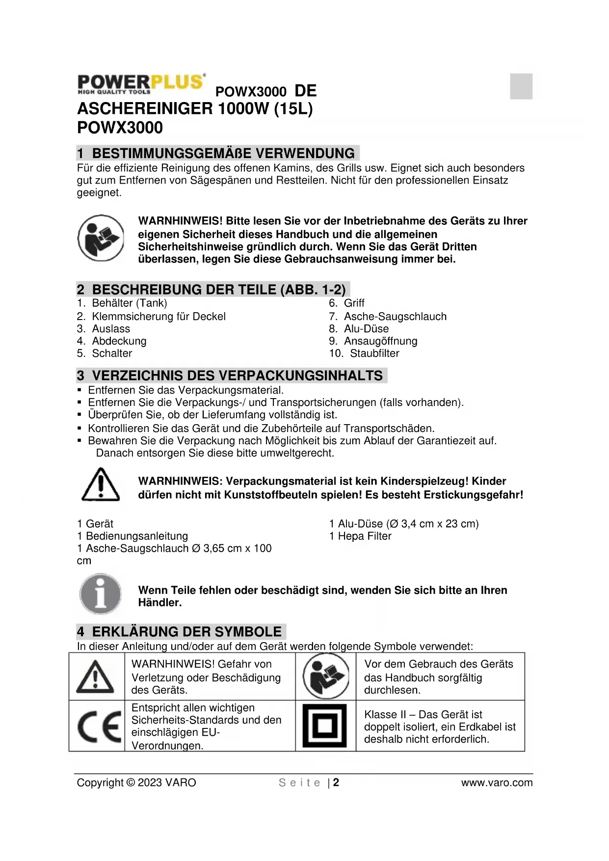 Copyright © 2023 VARO S e i t e | 2 www.varo.com ASCHEREINIGER 1000W (15L) POWX3000 1 BESTIMMUNGSGEMÄßE VERWENDUNG Für die effiziente Reinigung des offenen Kamins, des Grills usw. Eignet sich auch besonders gut zum Entfernen von Sägespänen und Restteilen. Nicht für den professionellen Einsatz geeignet. WARNHINWEIS! Bitte lesen Sie vor der Inbetriebnahme des Geräts zu Ihrer eigenen Sicherheit dieses Handbuch und die allgemeinen Sicherheitshinweise gründlich durch. Wenn Sie das Gerät Dritten überlassen, legen Sie diese Gebrauchsanweisung immer bei. 2 BESCHREIBUNG DER TEILE (ABB. 1-2)