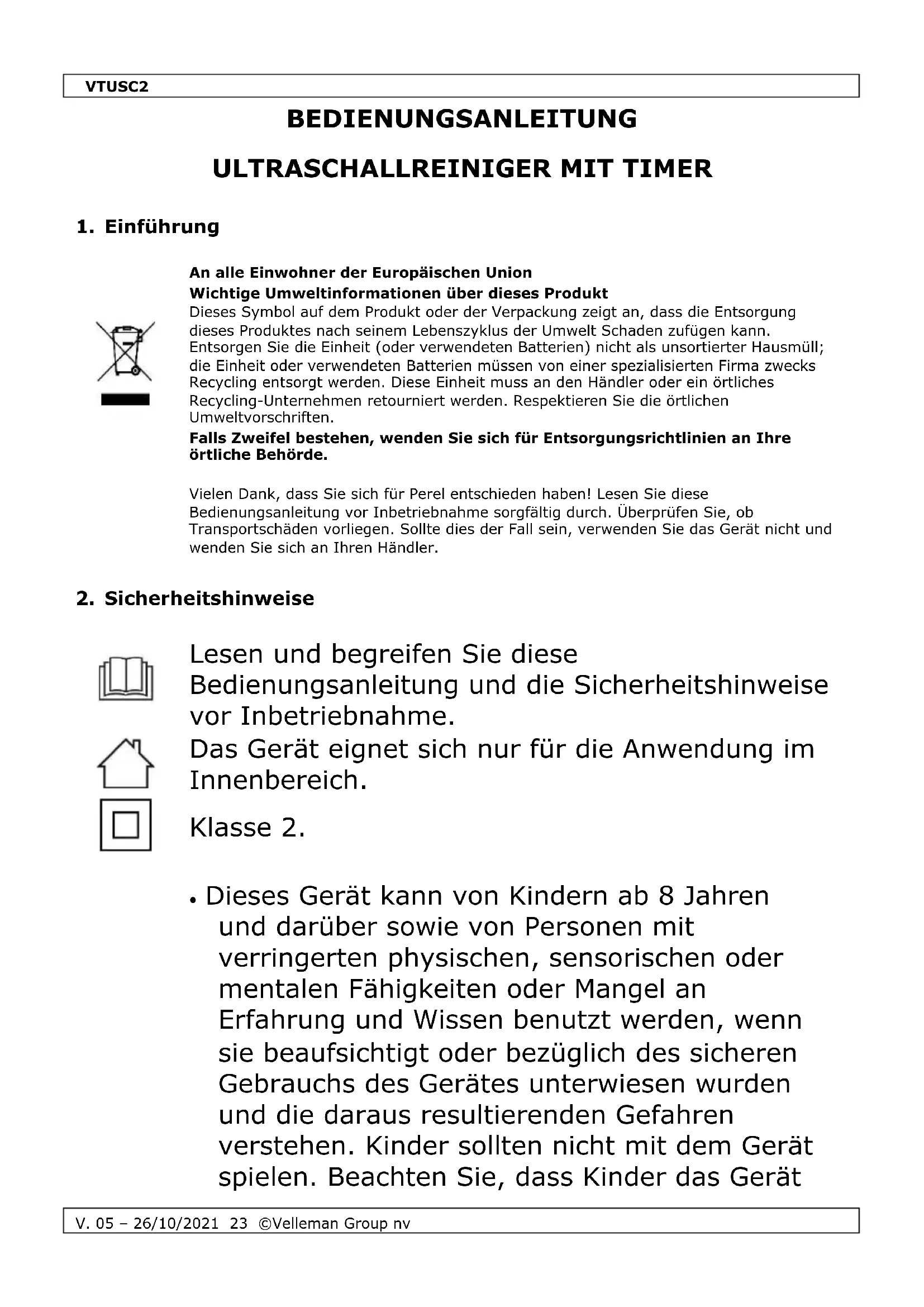 VTUSC2 - Ultraschallreiniger Perel - Kostenlose Bedienungsanleitung